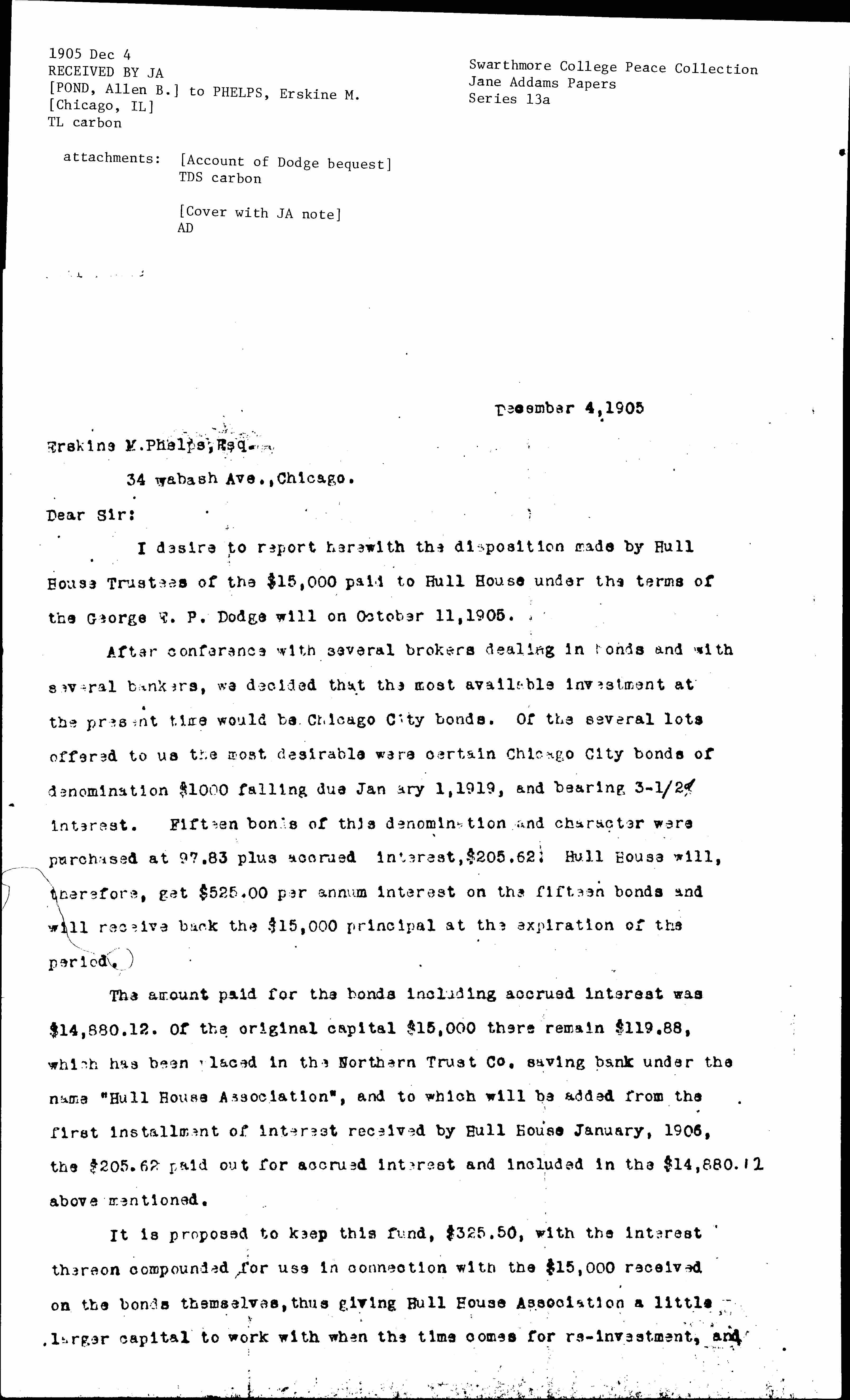 After conferences with several brokers dealing in bonds and with several bankers, we decided that the most available investment at the present time would be Chicago City bonds. Of the several lots offered to us the most desirable were certain Chicago City Bonds of denomination $1000 falling due January 1, 1919, and bearing 3-1/2% interest. Fifteen bonds of this denomination and character were purchased at 97.83 plus accrued interest, $205.62. Hull House will, therefore, get $525.00 per annum interest on the fifteen bonds and will receive back the $15,000 principal at the expiration of the period.