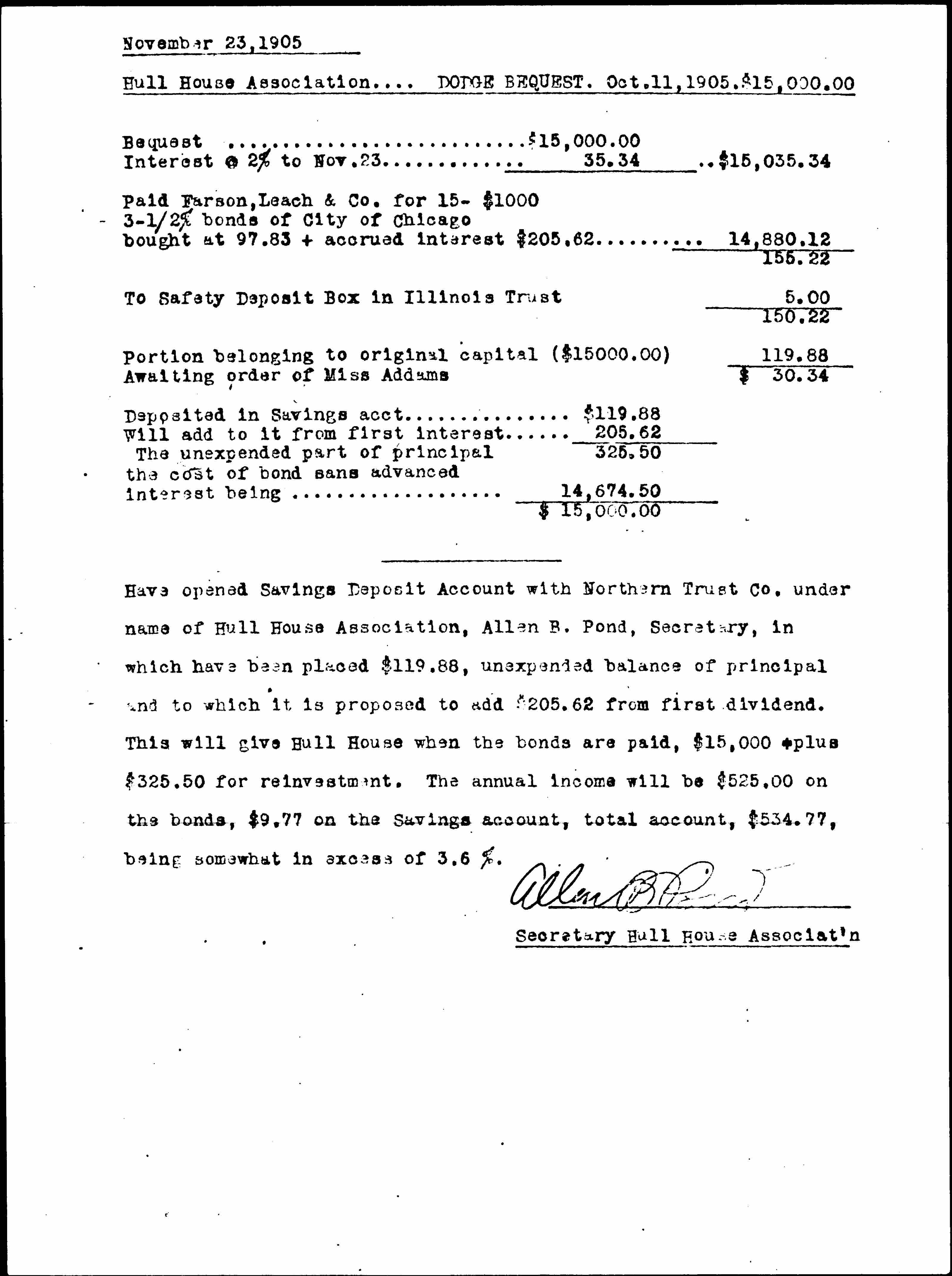 Have opened Saving Deposit Account with Northern Trust Co. under name of Hull House Association, Allen B. Pond, Secretary, in which have been placed $119.88, unexpened balance of principal and to which it is proposed to add $205.62 from first dividend. This will give Hull House when the bonds are paid, $15,000 -- plus $325.50 for reinvestment. The annual income will be $52.00 on the bonds, $9.77 on the Savings account, total account, $534.77, being somewhat in excess of 3.6%