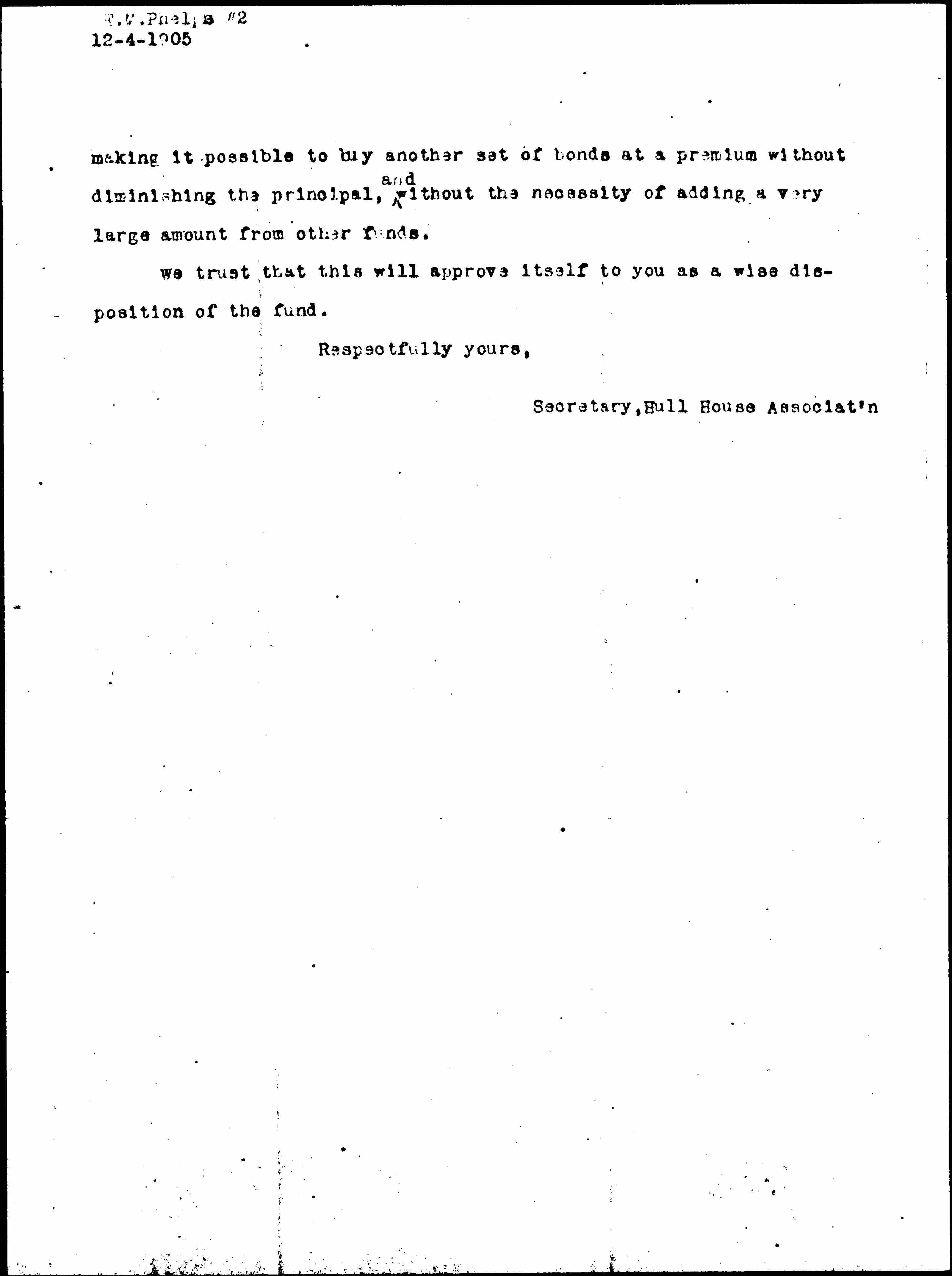 It is proposed to keep this fund, $325.50, with the interest thereon compounded for use in connection with the $15,000 received on the bonds themselves, thus giving Hull House Association a little larger capital to work with when the time comes for re-investment, and [page 2] making it possible to buy another set of bonds at a premium without diminishing the principal, ↑and↓ without the necessity of adding a very large amount from other funds.