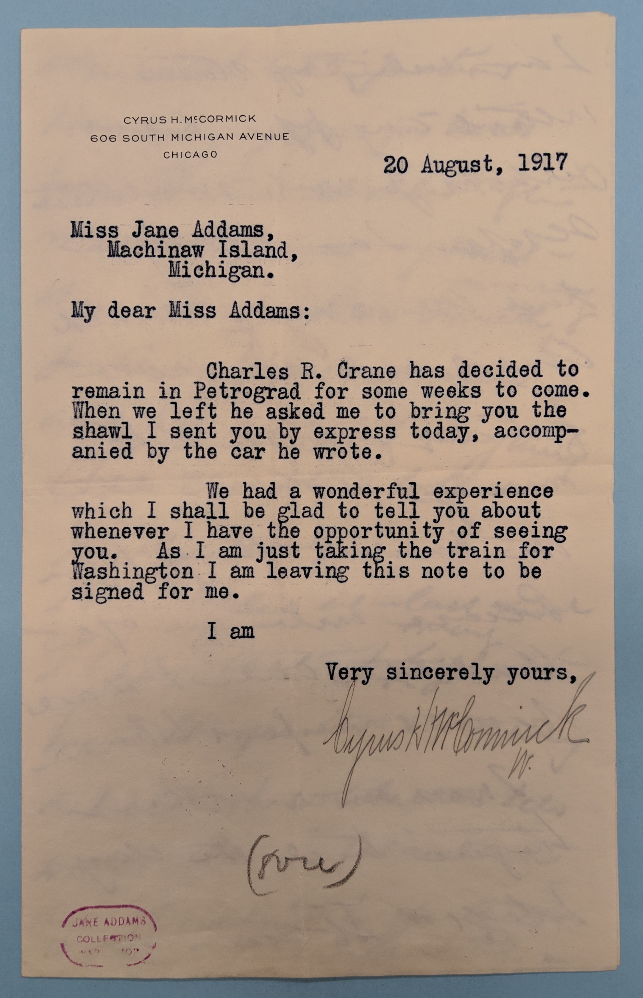 Charles R. Crane has decided to remain in Petrograd for some weeks to come. When we left he asked me to bring you the shawl I sent you by express today, accompanied by the [card] he wrote.
