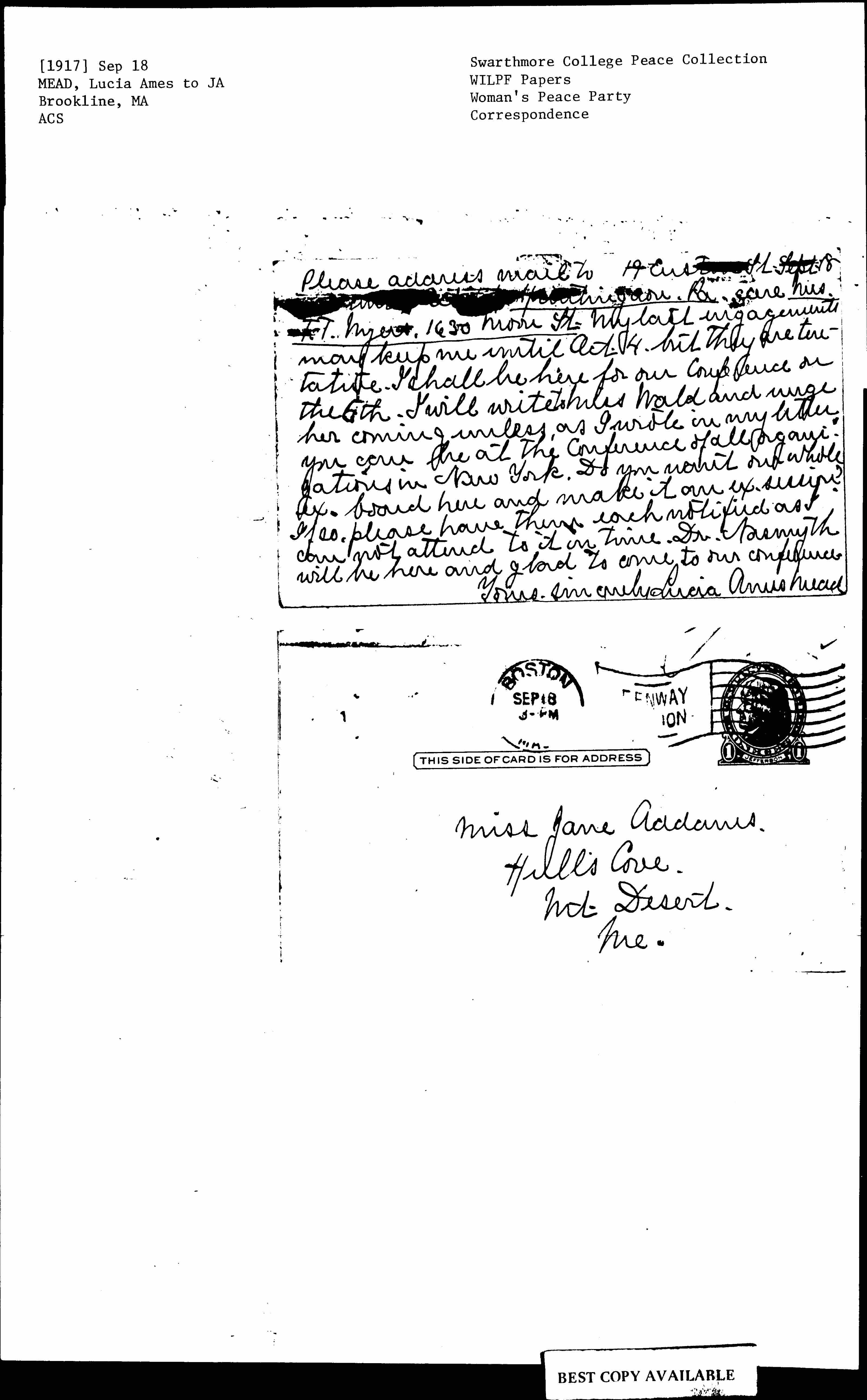 Please address mail to 19 Euston St Sept 18 [illegible words] Huntingdon, Pa, care Mrs. T. T. Myers, 1630 Moore St My last engagements may keep me until Oct. 4, but they are tentative. I shall be here for our Conference on the 6th. I will write to Miss Wald and urge her coming unless, as I wrote in my letter, you can be at the Conference of all organizations in New York. Do you want our whole ex. board here and make it an ex. session? If so, please have them each notified as I can not attend to it on time. Dr. Nasmyth will be here and glad to come to our conference.