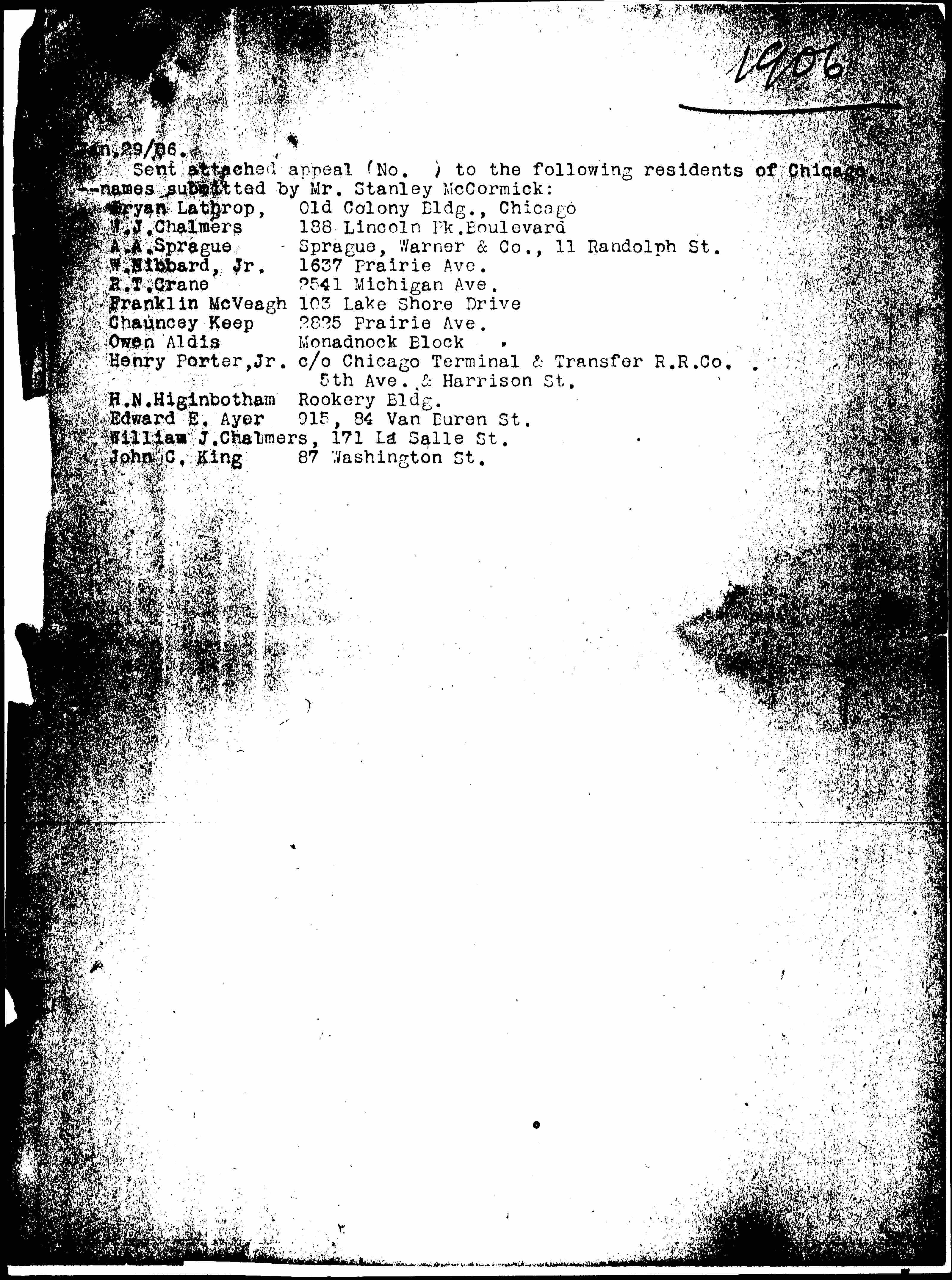 Sent attached appeal (No. ) to the following residents of Chicago, -- names submitted by Mr. Stanley McCormick: