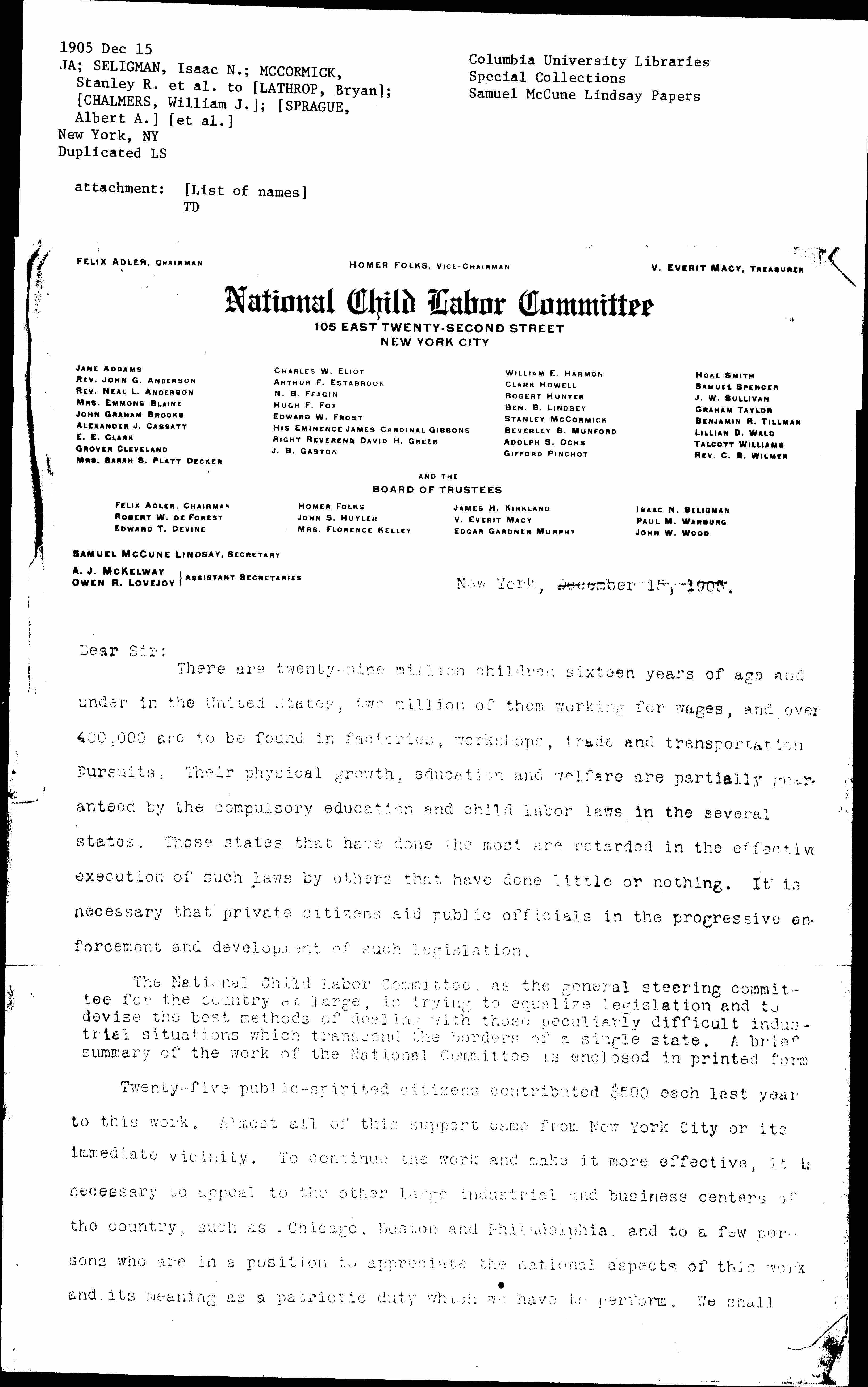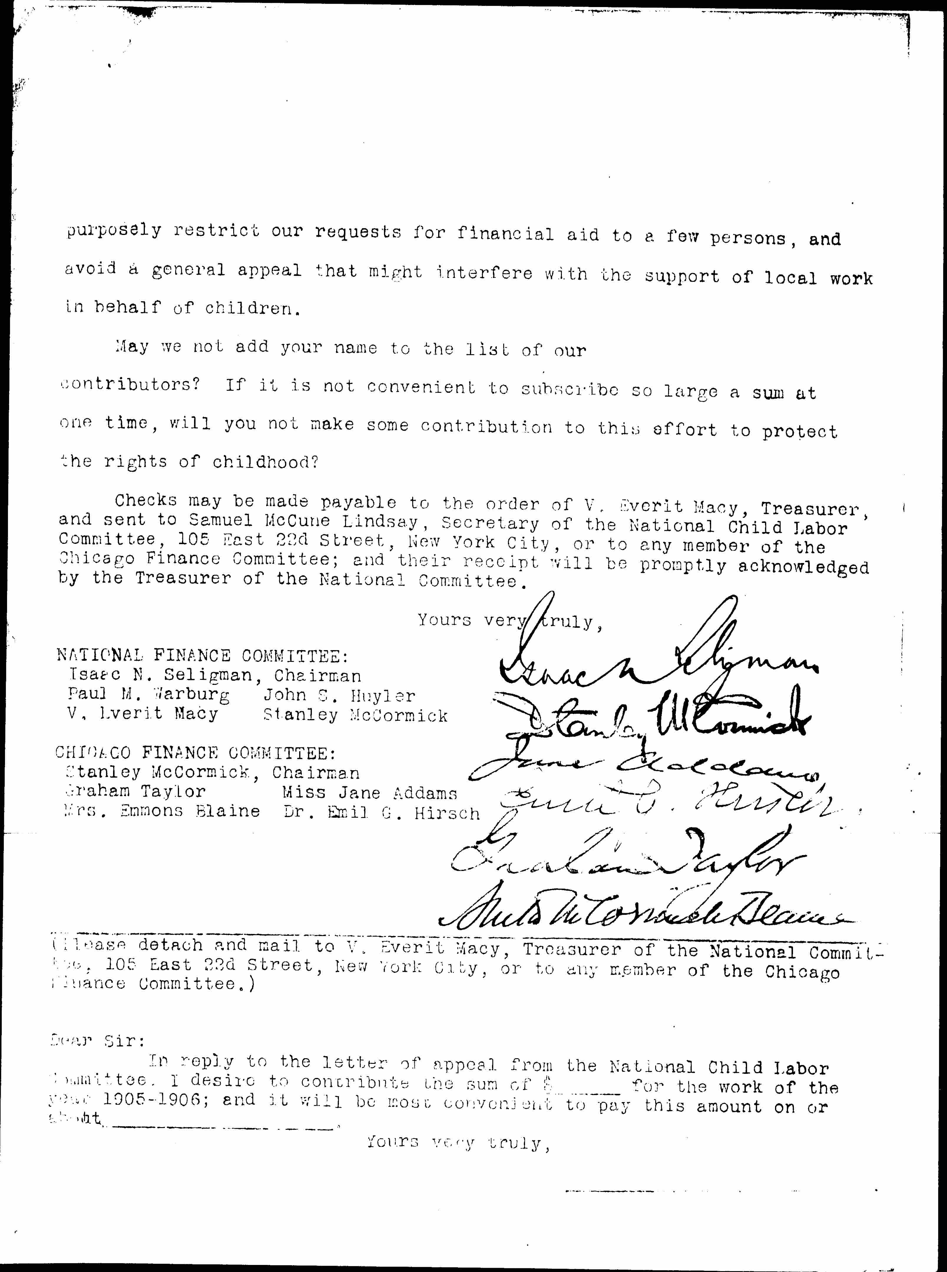 Checks may be made payable to the order of V. Everit Macy, Treasurer, and sent to Samuel McCune Lindsay, Secretary of the National Child Labor Committee, 105 East 22d Street, New York City, or to any member of the Chicago Finance Committee; and their receipt will be promptly acknowledged by the Treasurer of the National Committee.