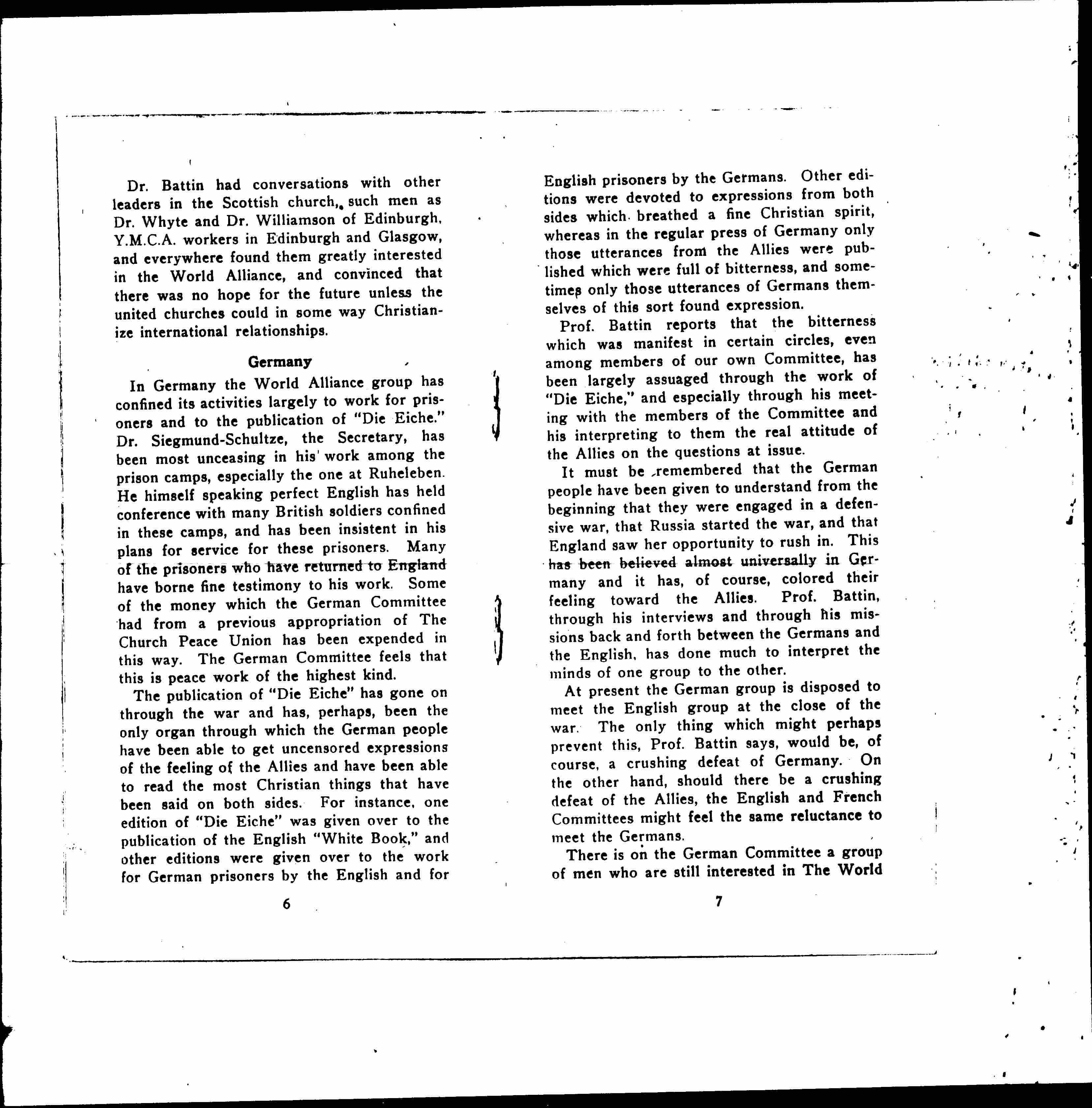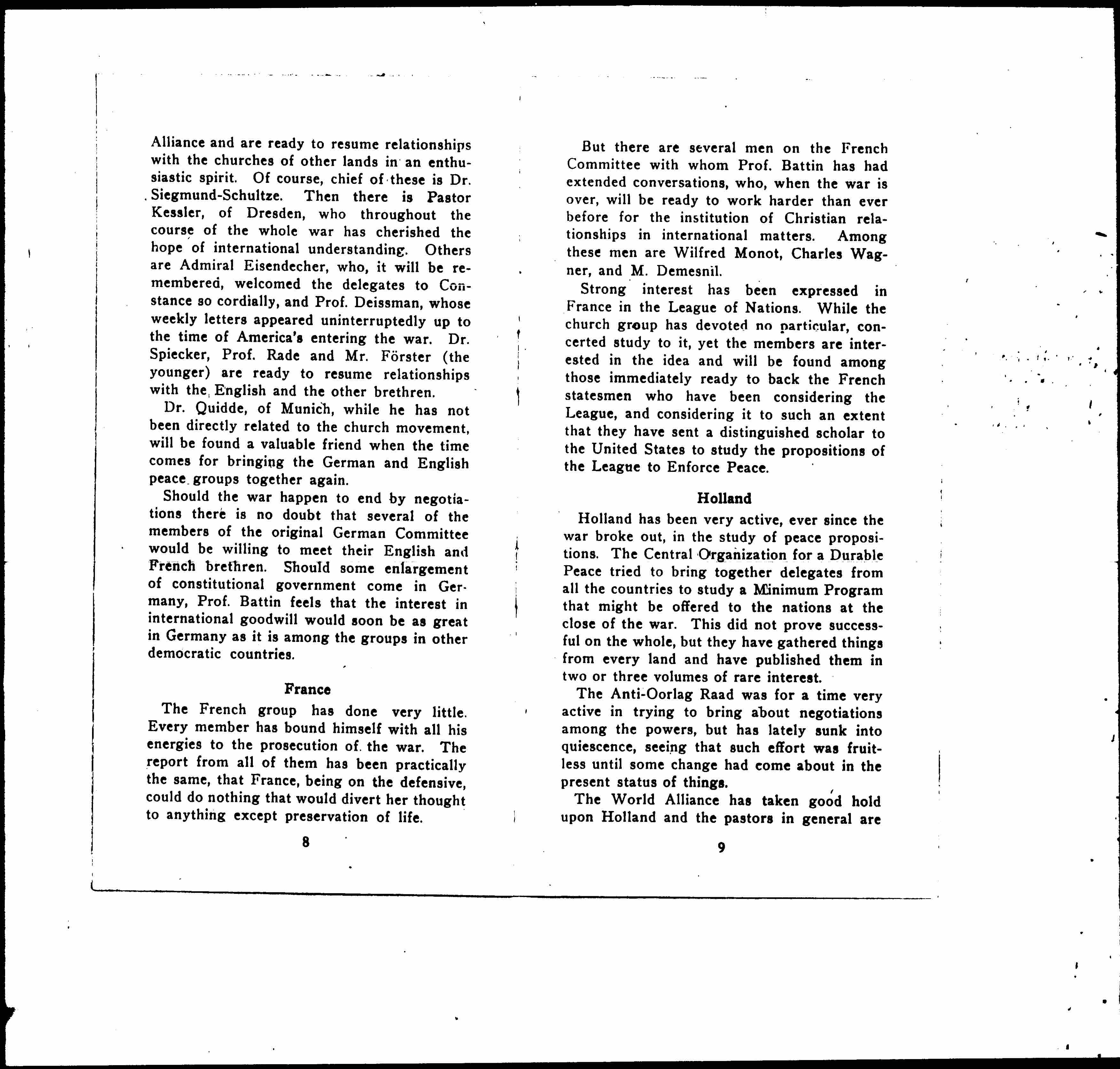 There is on the German Committee a group of men who are still interested in The World [page 8] Alliance and are ready to resume relationships with the churches of other lands in an enthusiastic spirit. Of course, chief of these is Dr. Siegmund-Schultze. Then there is Pastor Kessler, of Dresden, who throughout the course of the whole war has cherished the hope of international understanding. Others are Admiral Eisendecher, who, it will be remembered, welcomed the delegates to Constance so cordially, and Prof. [Deissmann], whose weekly letter appeared uninterruptedly up to the time of America's entering the war. Dr. Spiecker, Prof. Rade and Mr. Forster (the younger) are ready to resume relationships with the English and the other brethren.