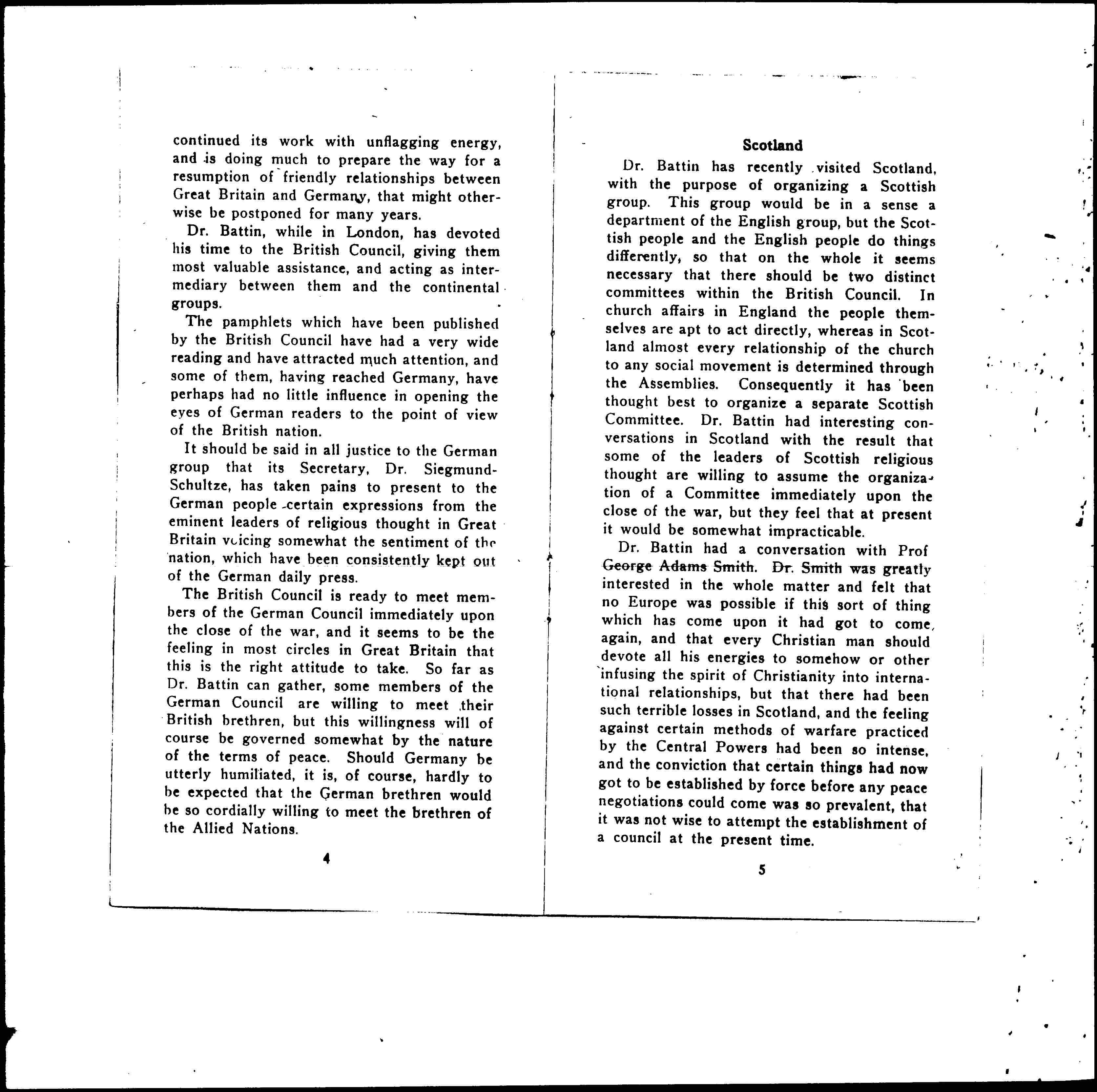 Dr. Battin has recently visited Scotland, with the purpose of organizing a Scottish group. This group would be in a sense a department of the English group, but the Scottish people and the English people do things differently, so that on the whole it seems necessary that there should be two distinct committees within the British Council. In Church affairs in England the people themselves are apt to act directly, whereas in Scotland almost every relationship of the church to any social movement is determined through the Assemblies. Consequently it has been thought best to organize a separate Scottish Committee. Dr. Battin had interesting conversations in Scotland with the result that some of the leaders of Scottish religious thought are willing to assume the organization of a Committee immediately upon the close of the war, but they feel that at present it would be somewhat impracticable.