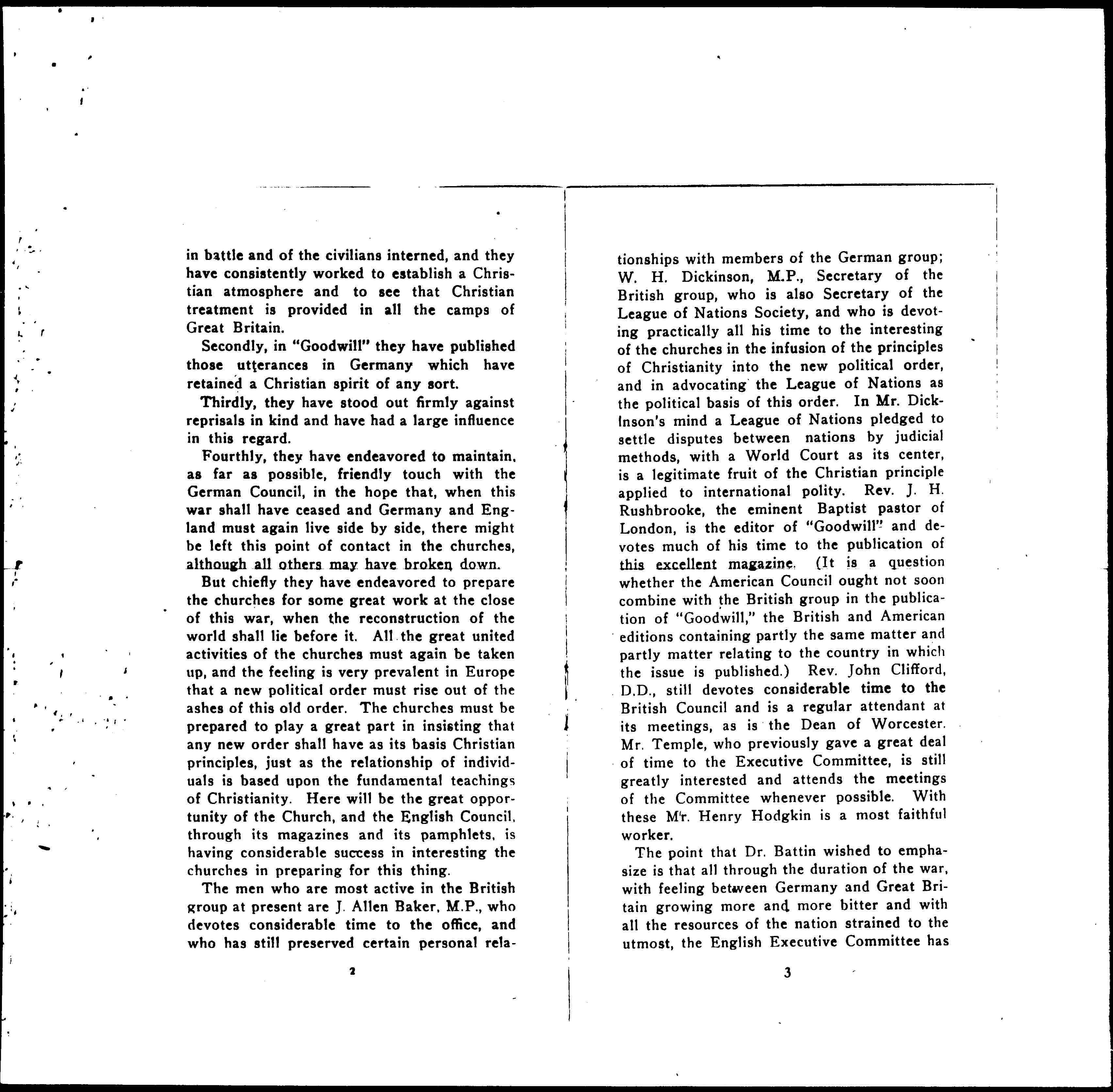 The men who are most active in the British group at present are J. Allen Baker, M.P., who devotes considerable time to the office, and who has still preserved certain personal relationships [page 3] with members of the German group; W. H. Dickinson, M.P., Secretary of the British group, who is also Secretary of the League of Nations Society, and who is devoting practically all his time to the interesting of the churches in the infusion of the principles of Christianity into the new political order, and in advocating the League of Nations as the political basis of this order. In Mr. Dickinson's mind a League of Nations pledged to settle disputes between nations by judicial methods, with a World Court as its center, is a legitimate fruit of the Christian principle applied to international polity. Rev. J. H. Rushbrooke, the eminent Baptist pastor of London, is the editor of "Goodwill" and devotes much of his time to the publication of this excellent magazine. (It is a question whether the American Council ought not soon combine with the British group in the publication of "Goodwill," the British and American editions containing partly the same matter and partly matter relating to the country in which the issue is published.) Rev. John Clifford, D.D., still devotes considerable time to the British Council and is a regular attendant at its meetings, as is the Dean of Worcester. Mr. Temple, who previously gave a great deal of time to the Executive Committee, is still greatly interested and attends the meetings of the Committee whenever possible. With these Mr. Henry Hodgkin is a most faithful worker.