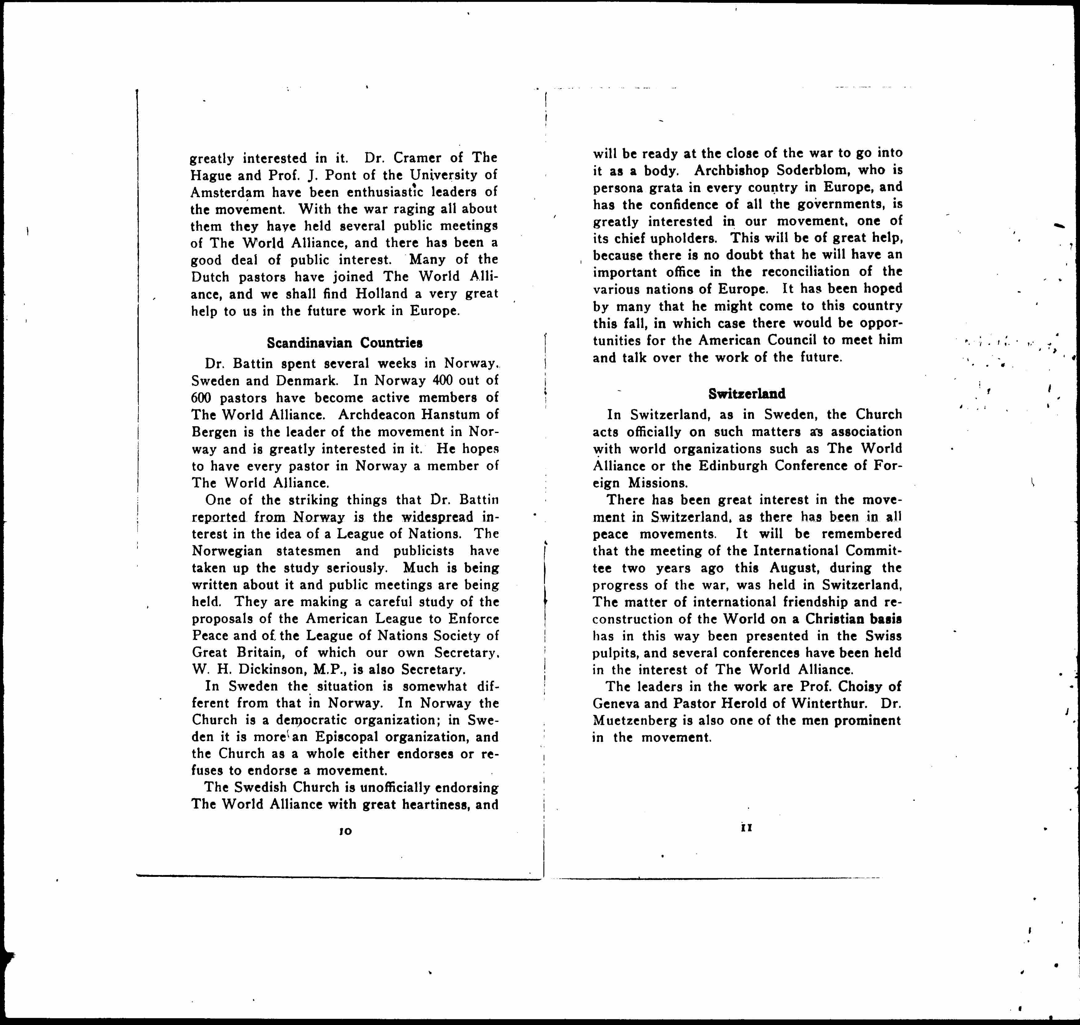 The World Alliance has taken good hold upon Holland and the pastors in general are [page 10] greatly interested in it. Dr. Cramer of The Hague and Prof. J. Pont of the University of Amsterdam have been enthusiastic leaders of the movement. With the war raging all about them they have held several public meetings of The World Alliance, and there has been a good deal of public interest. Many of the Dutch pastors have joined The World Alliance, and we shall find Holland a very great help to us in the future work in Europe.
