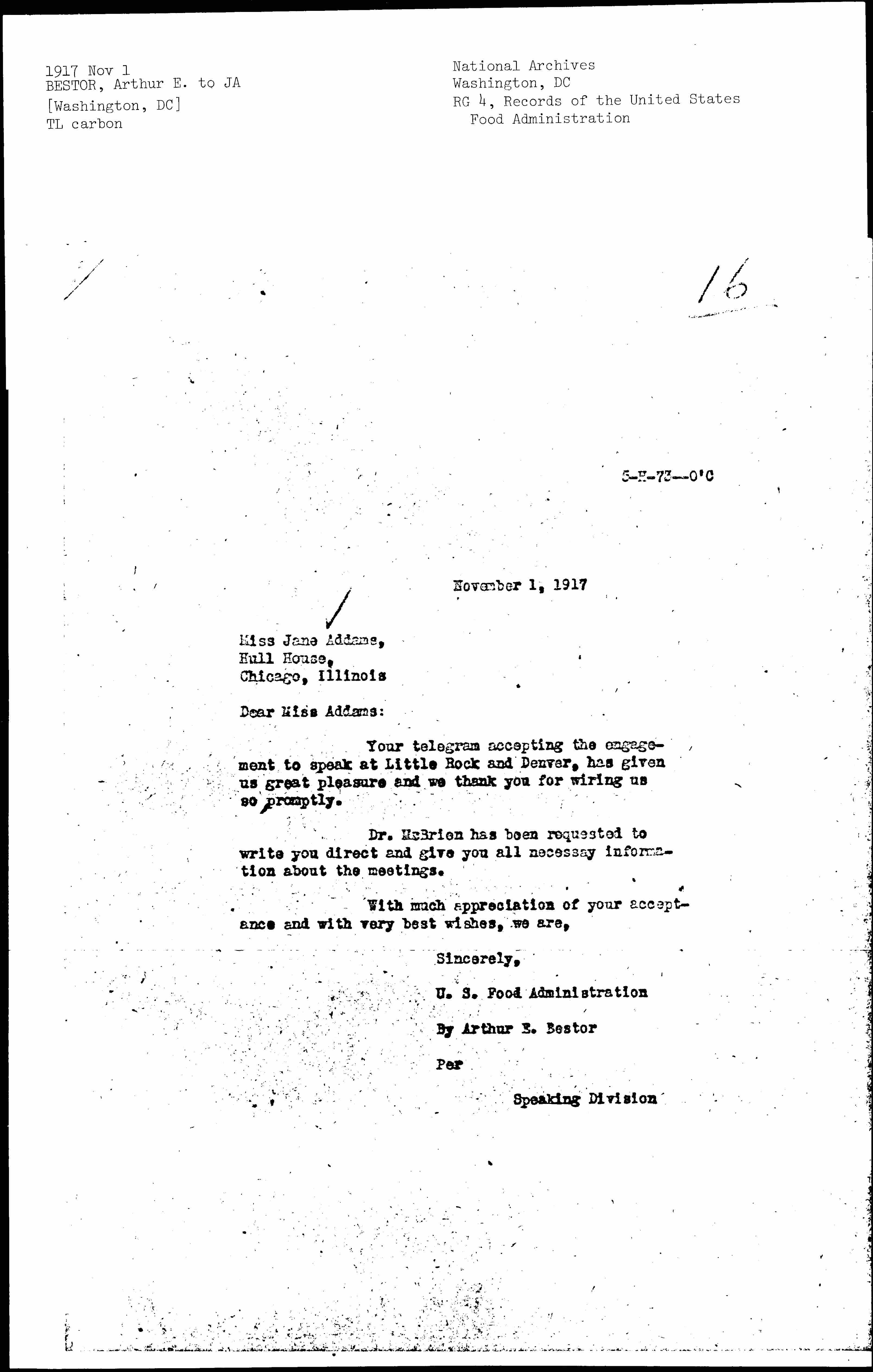 Your telegram accepting the engagement to speak at Little Rock and Denver, has given us great pleasure and we thank you for wiring us so promptly.