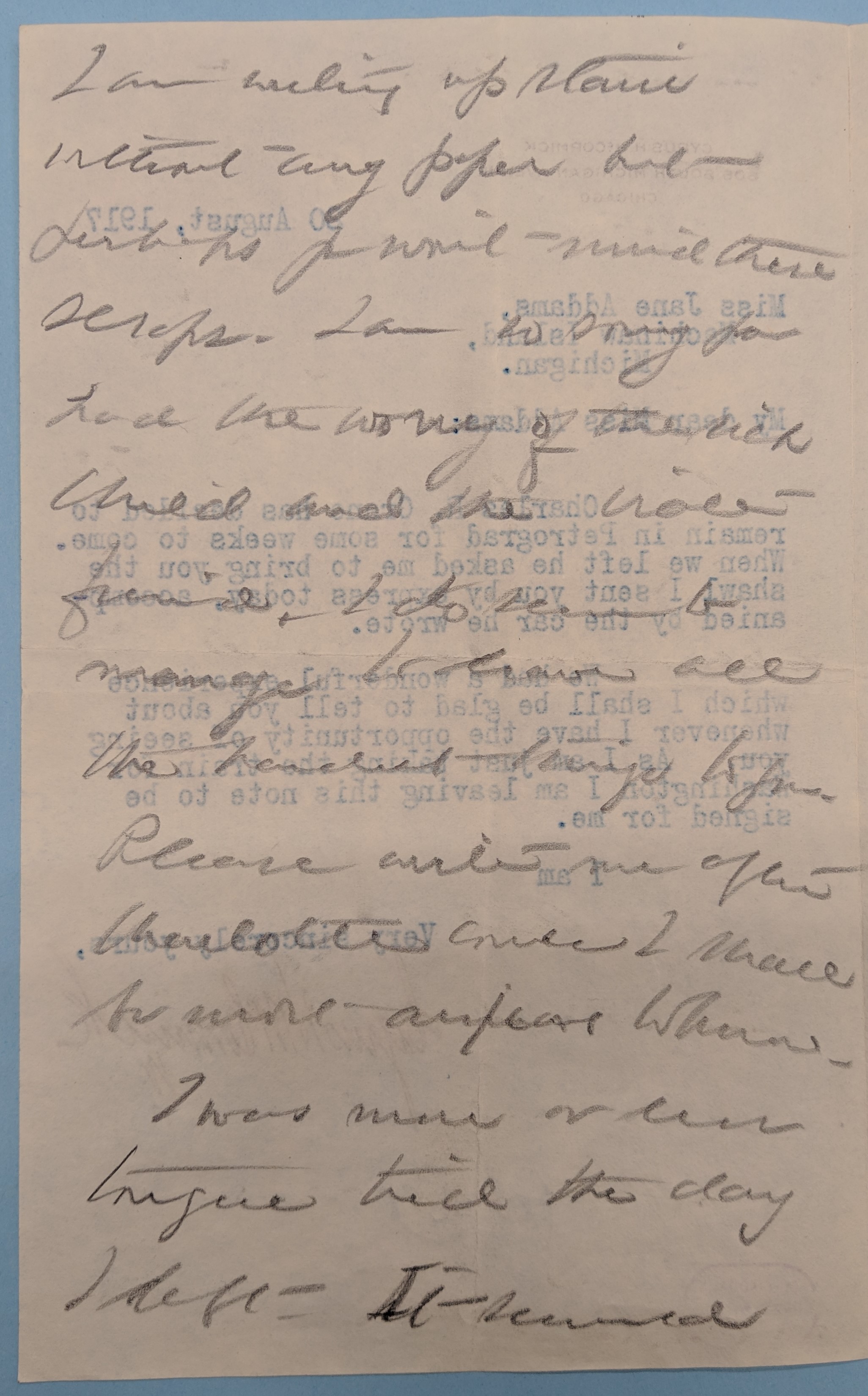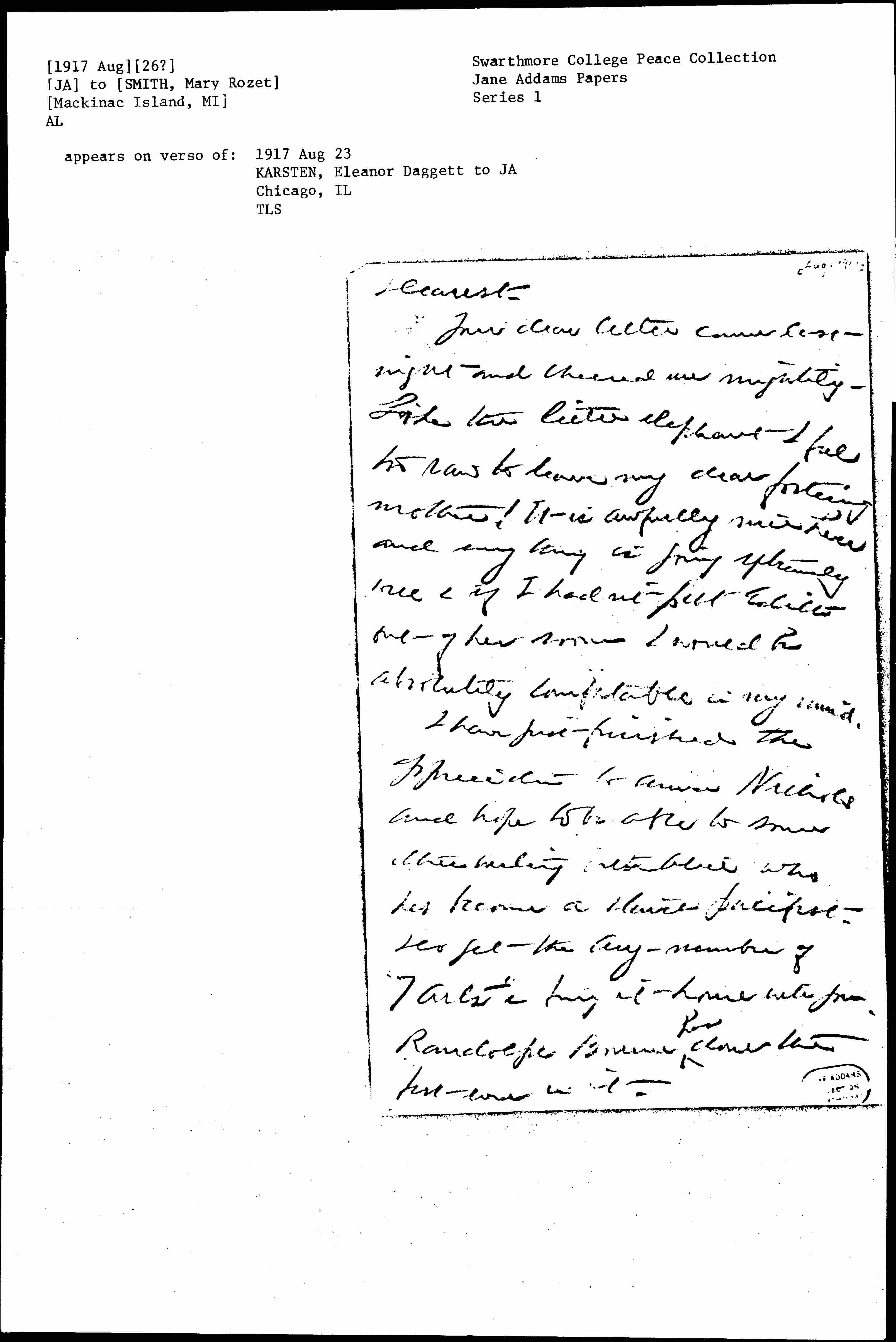 I have just finished the appreciation to Anna [Nicholes] and hope to be able to some other writing with Alice who has become a staunch pacifist. Do get the Aug-number of "7 Arts" & bring it home with you. Randolph Bourne <has>