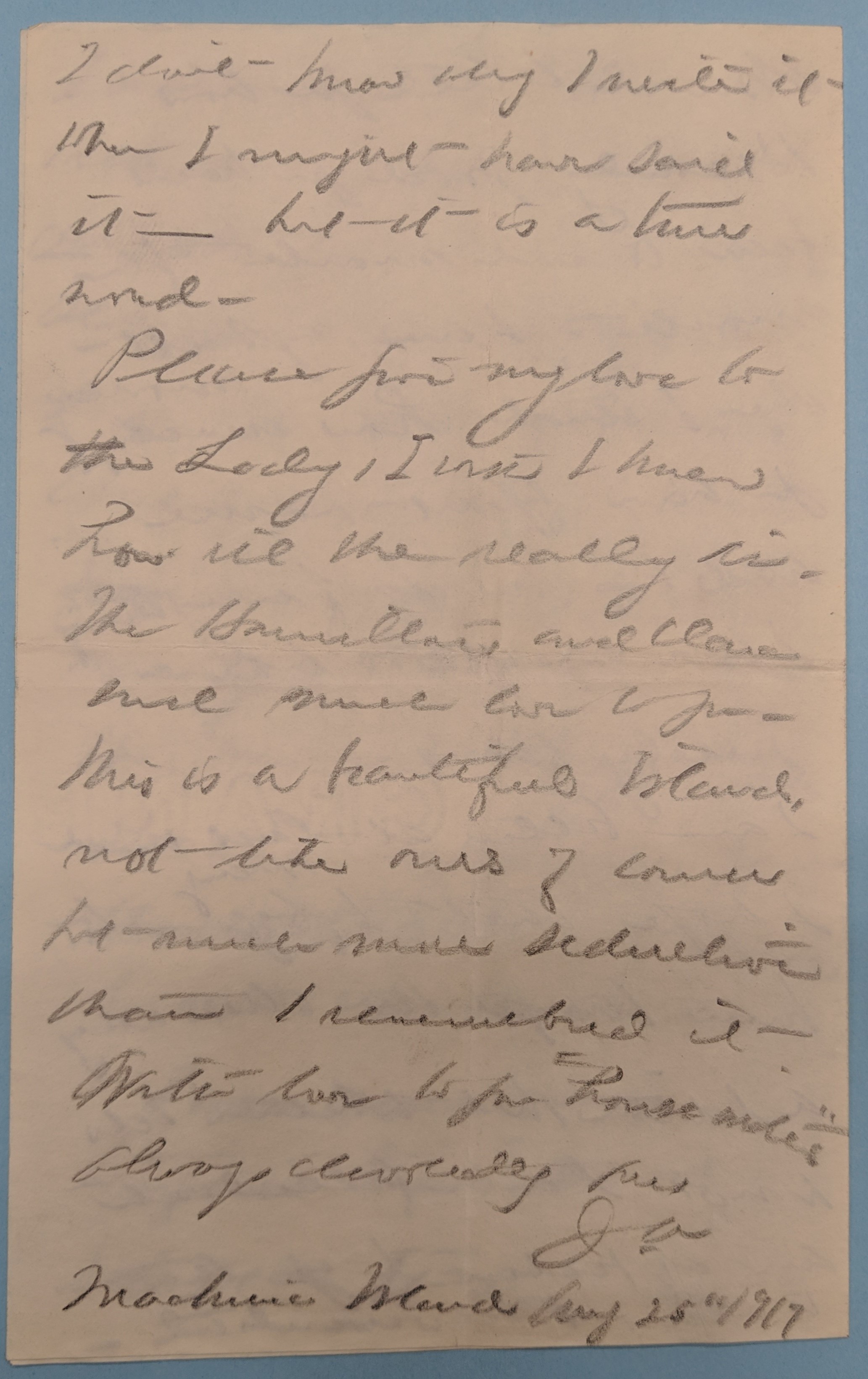 I am better at last and I hope that I <may> begin to turn things the other way a little, but whether I do or not I am filled with an affection for you that is almost reverential. [page 4] I don’t know why I write it when I might have said it -- but it is a true word.