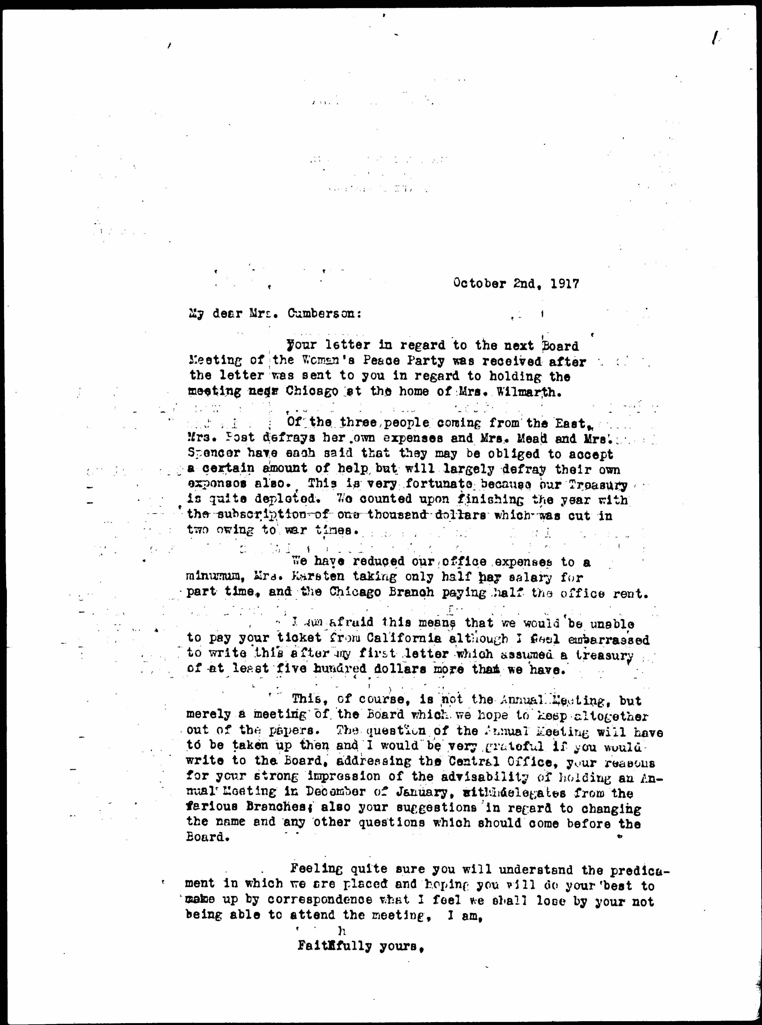 Your letter in regard to the next Board Meeting of the Woman's Peace Party was received after the letter was sent to you in regard to holding the meeting near Chicago at the home of Mrs. Wilmarth.
