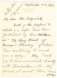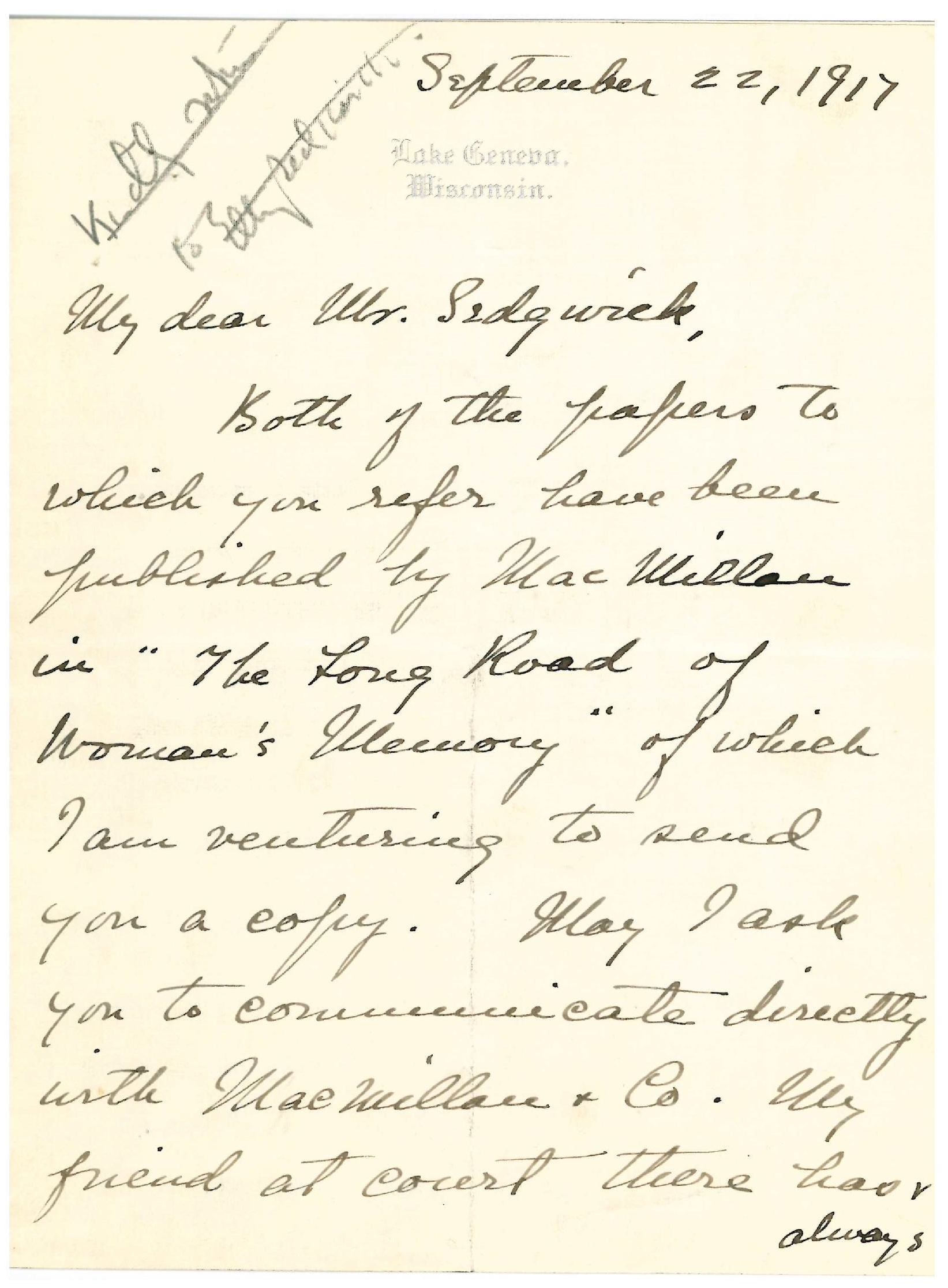 Both of the papers to which you refer have been published by Mac Millan in "The Long Road of Woman's Memory" of which I am venturing to send you a copy. May I ask you to communicate directly with Mac Millan & Co. My friend at court there has ↑always↓ [page 2] been Mr. Marsh. I should of course be much pleased to have a paper in such a book as you are contemplating.