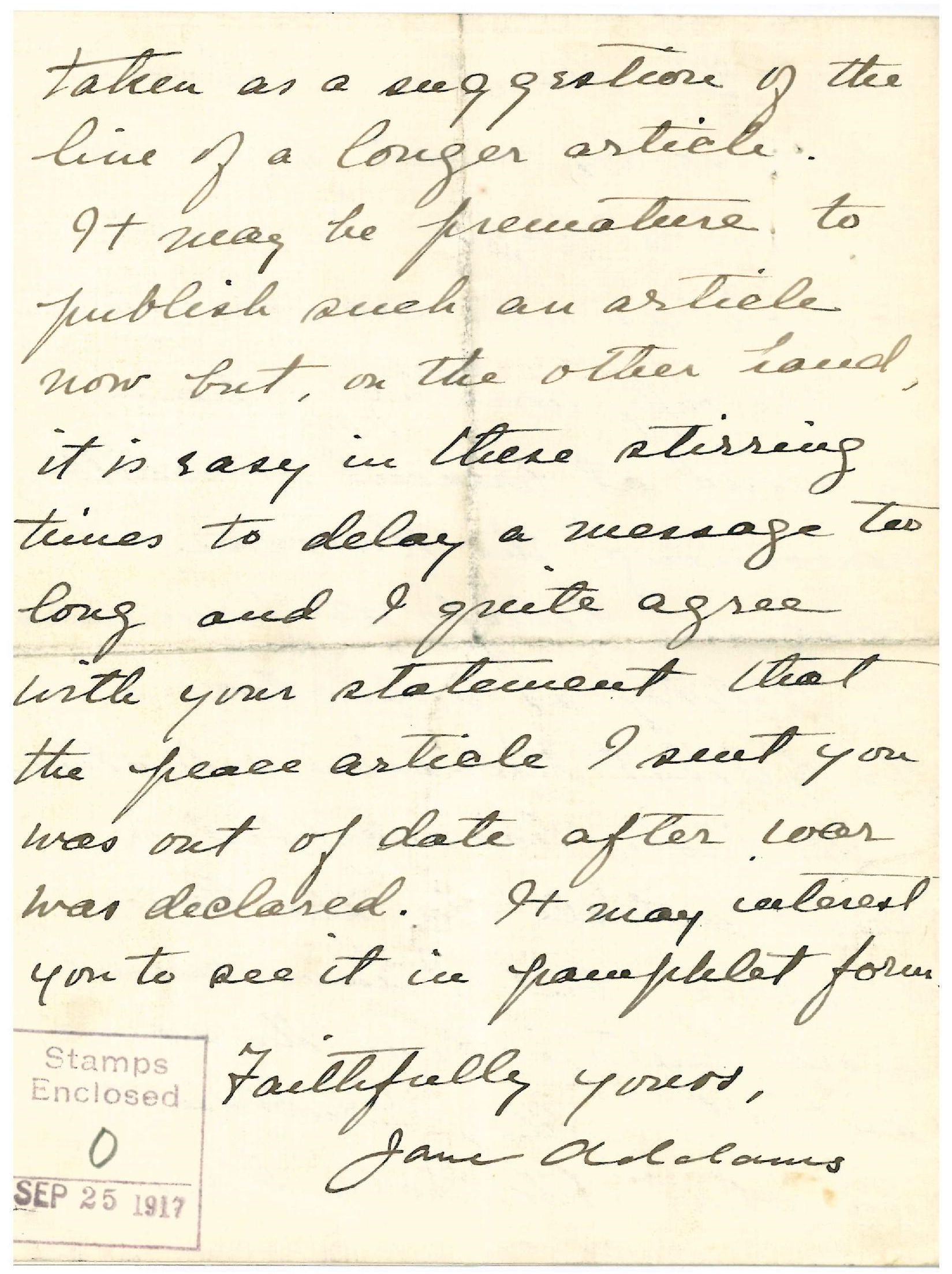 It may be premature to publish such an article now but, on the other hand, it is easy in these stirring times to delay a message too long and I quite agree with your statement that the peace article I sent you was out of date after war was declared. It may interest you to see it in pamphlet form.