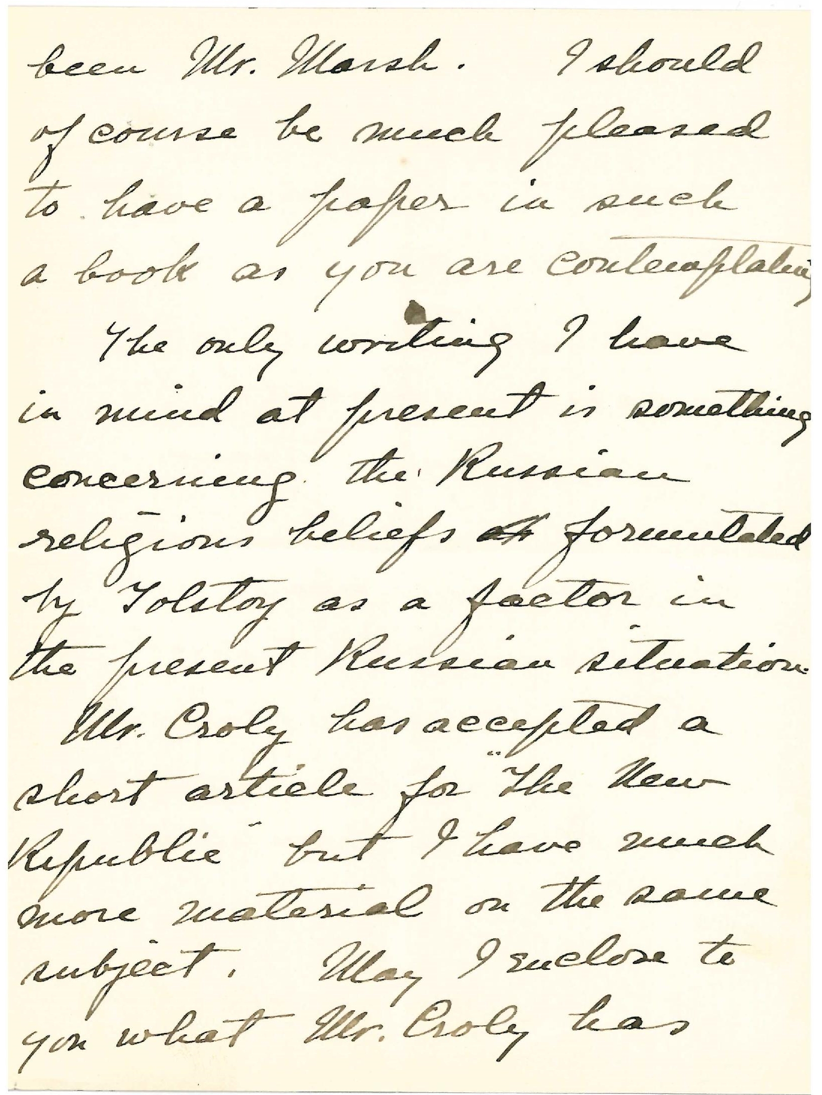 Mr. Croly has accepted a short article for "The New Republic" but I have much more material on the same subject. May I enclose to you what Mr. Croly has [page 3] taken as a suggestion of the line of a longer article.