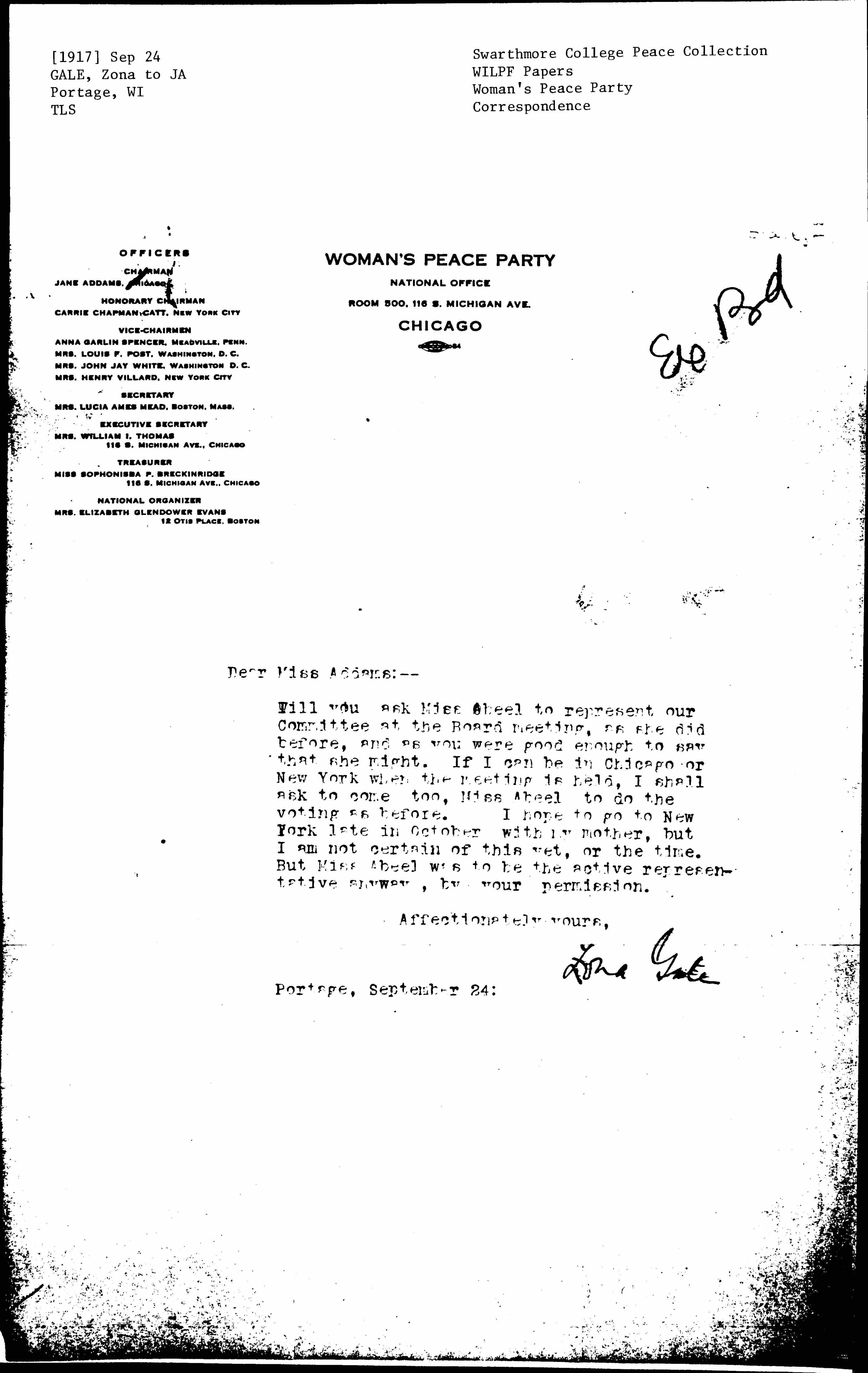 Will you ask Miss Abeel to represent our Committee at the Board meeting, as she did before, and as you were good enough to say that she might. If I can be in Chicago or New York when the meeting is held, I shall ask to come too, Miss Abeel to do the voting as before. I hope to go to New York late in October with my mother, but I am not certain of this yet, or the time. But Miss Abeel was to be the active representative anyway, by your permission.