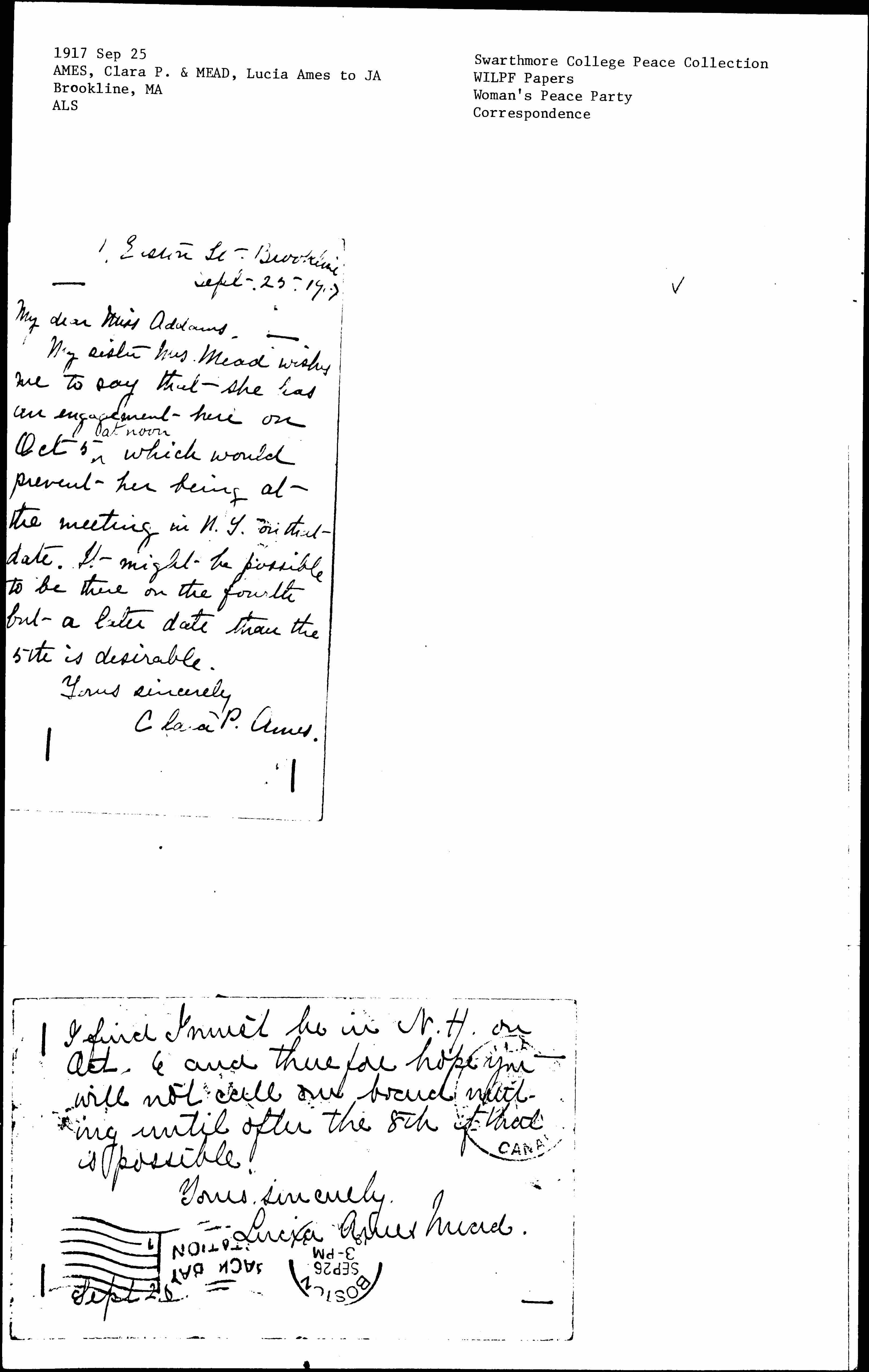 My sister Mrs. Mead wishes me to say that she has an engagement here on Oct 5 <at noon> which would prevent her being at the meeting in N.Y. on that date. It might be possible to be there on the fourth but a later date than the 5th is desirable.