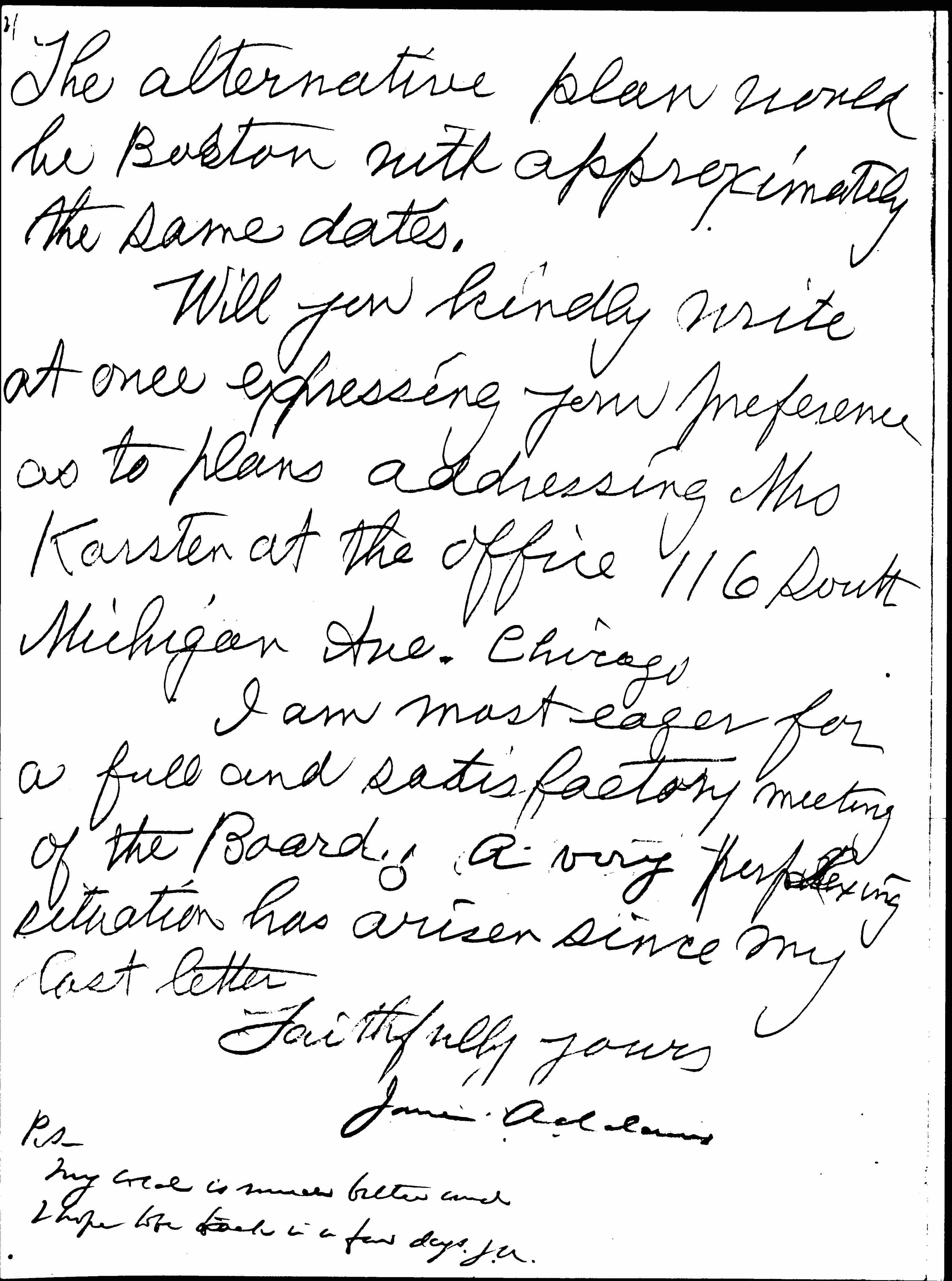 Will you kindly write at once expressing your preference as to plans addressing Mrs Karsten at the office 116 South Michigan Ave. Chicago.