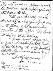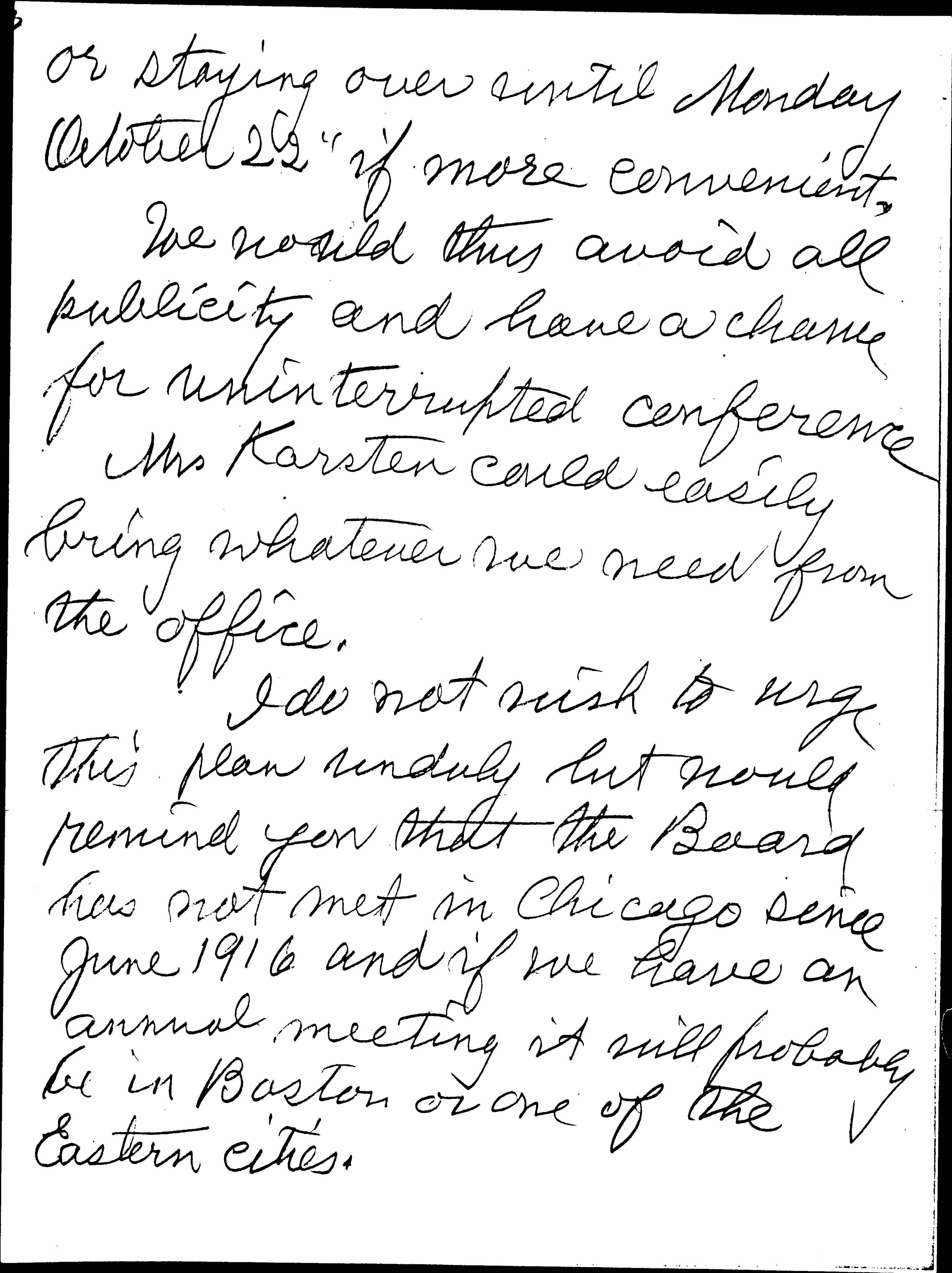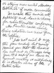 I do not wish to urge this plan unduly but would remind you that the Board has not met in Chicago since June 1916 and if we have an annual meeting it will probably be in Boston or one of the Eastern cities. [page 4]