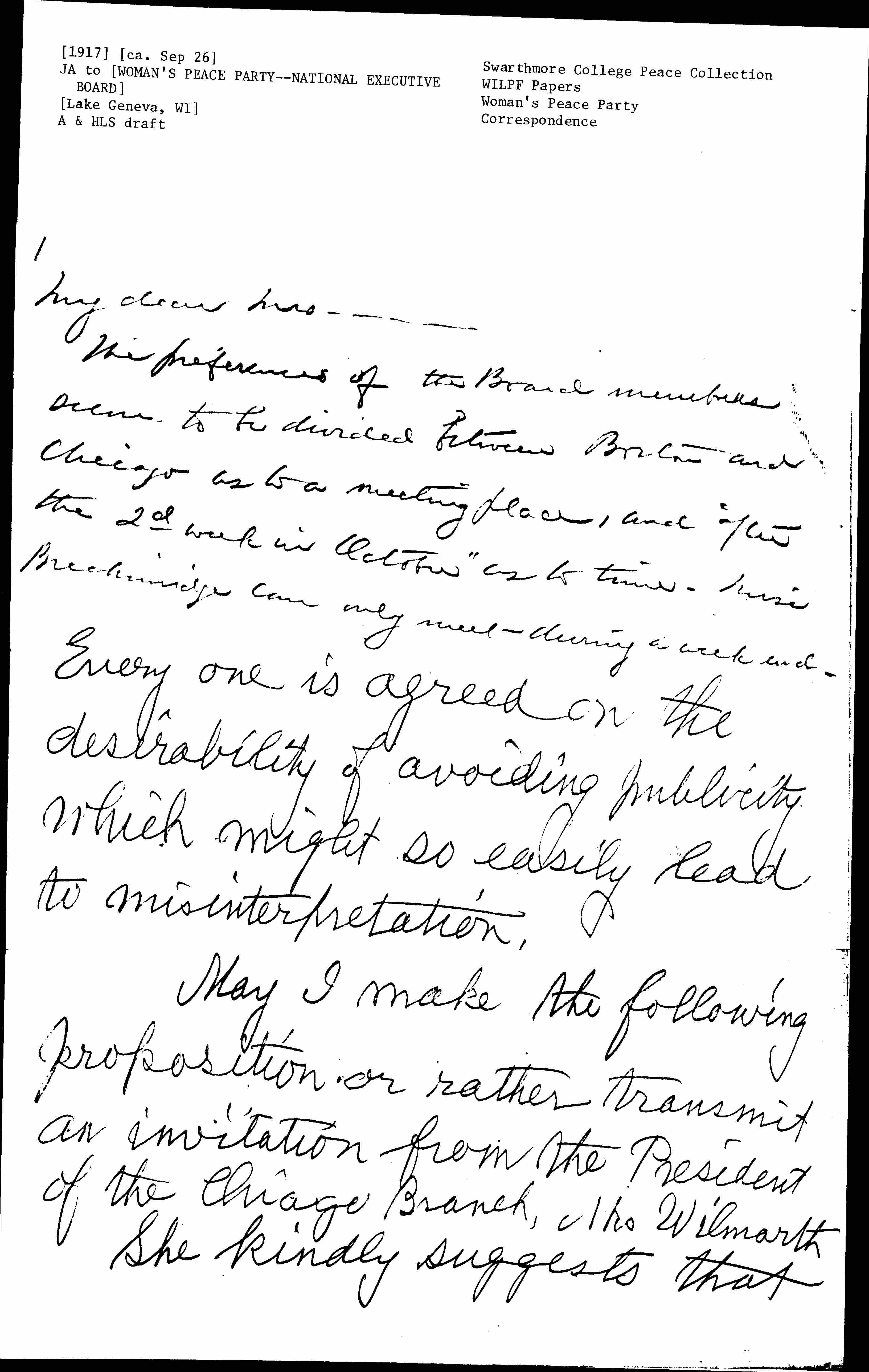 The preferences of the Board members seem to be divided between Boston and Chicago as to a meeting place, and "after the 2d week in October" as to time. Miss Breckinridge can only meet during a week end. Every one is agreed on the desirability of avoiding publicity which might so easily lead to misinterpretation.