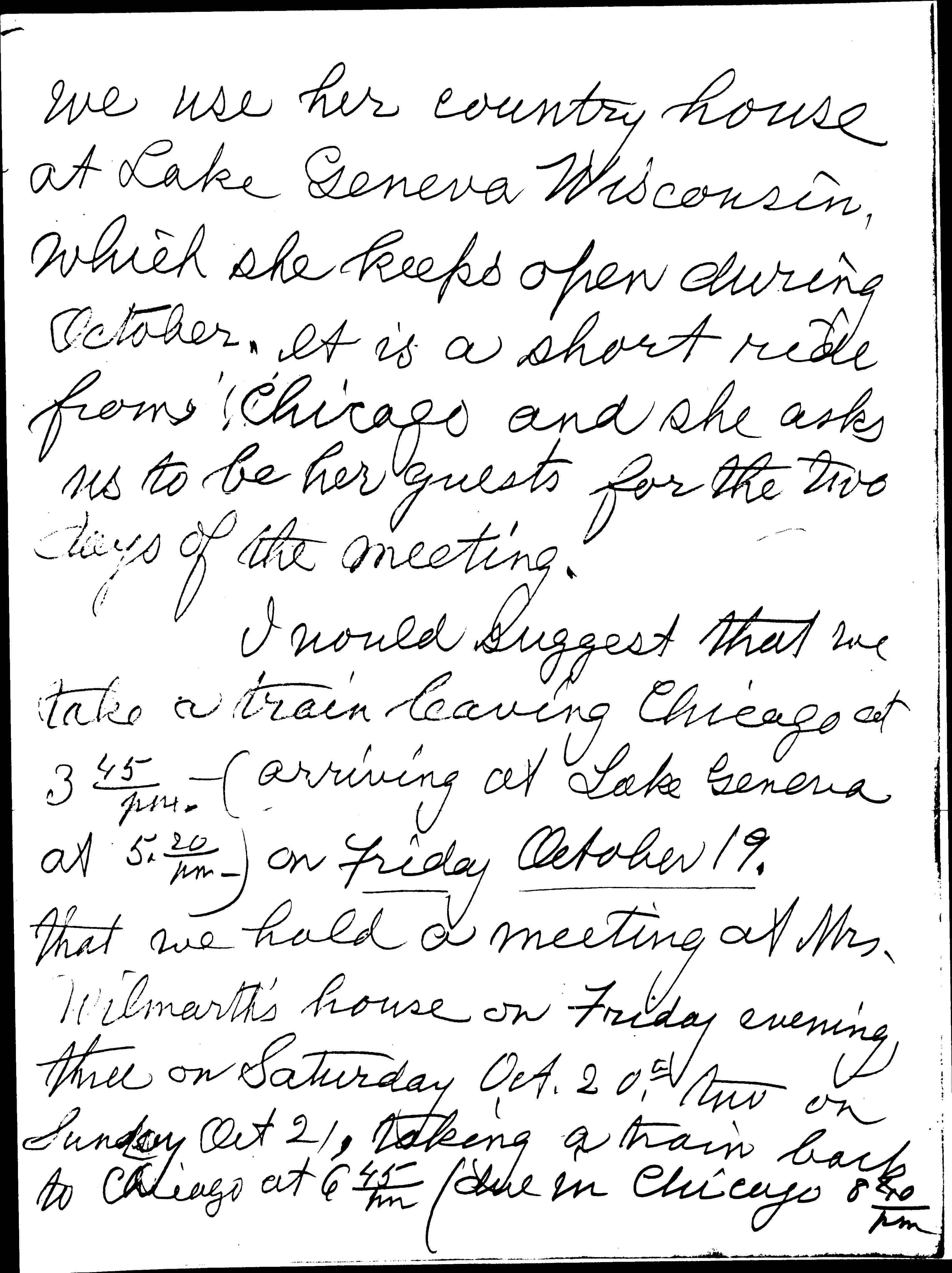 I would suggest that we take a train leaving Chicago at 345 pm. (arriving at Lake Geneva at 5.20 pm.) on Friday October 19. That we hold a meeting at Mrs. Wilmarth's house on Friday evening, three on Saturday Oct. 20th, two on Sunday Oct 21, taking a train back to Chicago at 645 pm (due in Chicago 840 pm) [page 3] or staying over until Monday October 22" if more convenient.