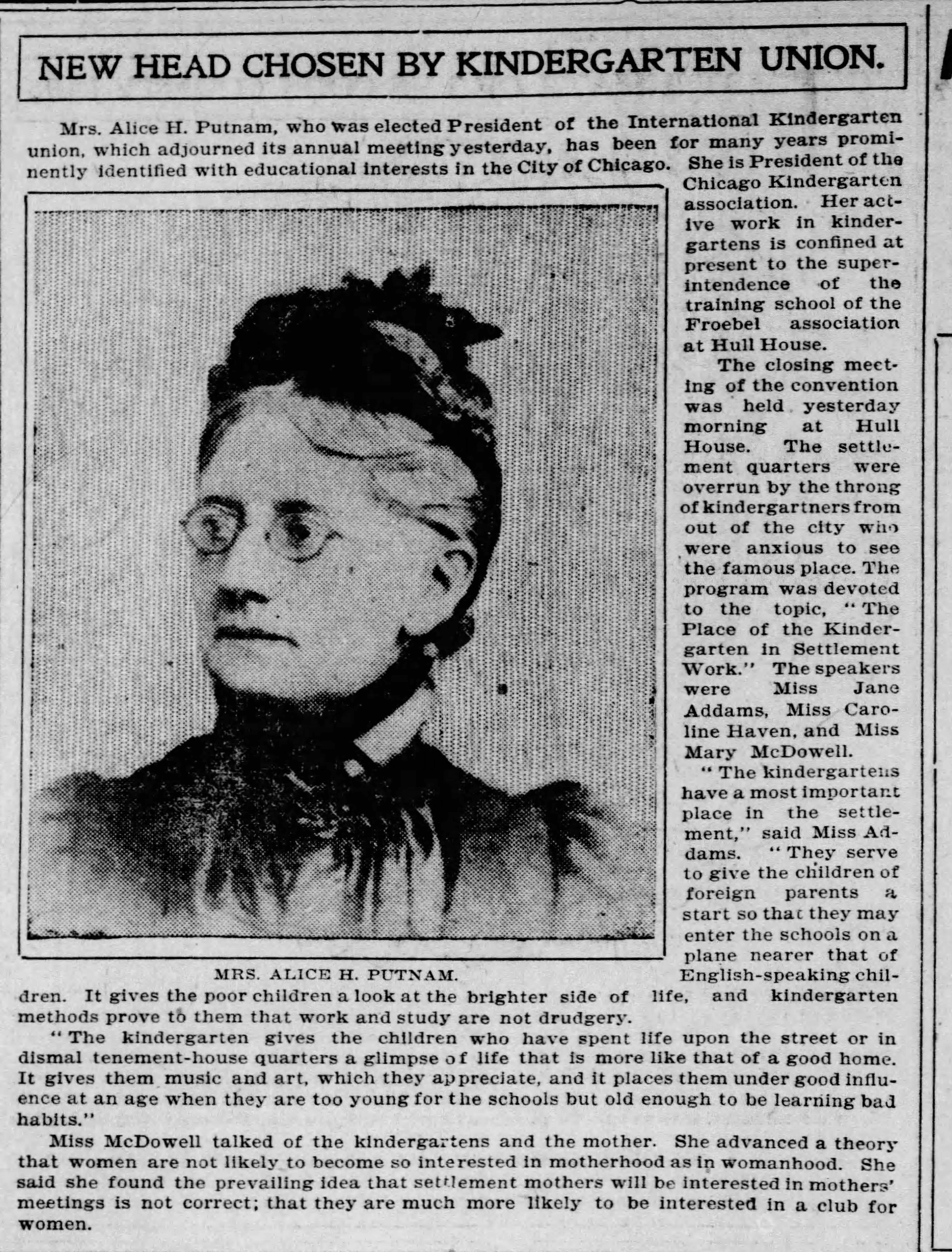 "The kindergarten gives the children who have spent life upon the street or in dismal tenement-house quarters a glimpse of life that is more like that of a good home. It gives them music and art, which they appreciate, and it places them under good influence at an age when they are too young for the school but old enough to be learning bad habits."