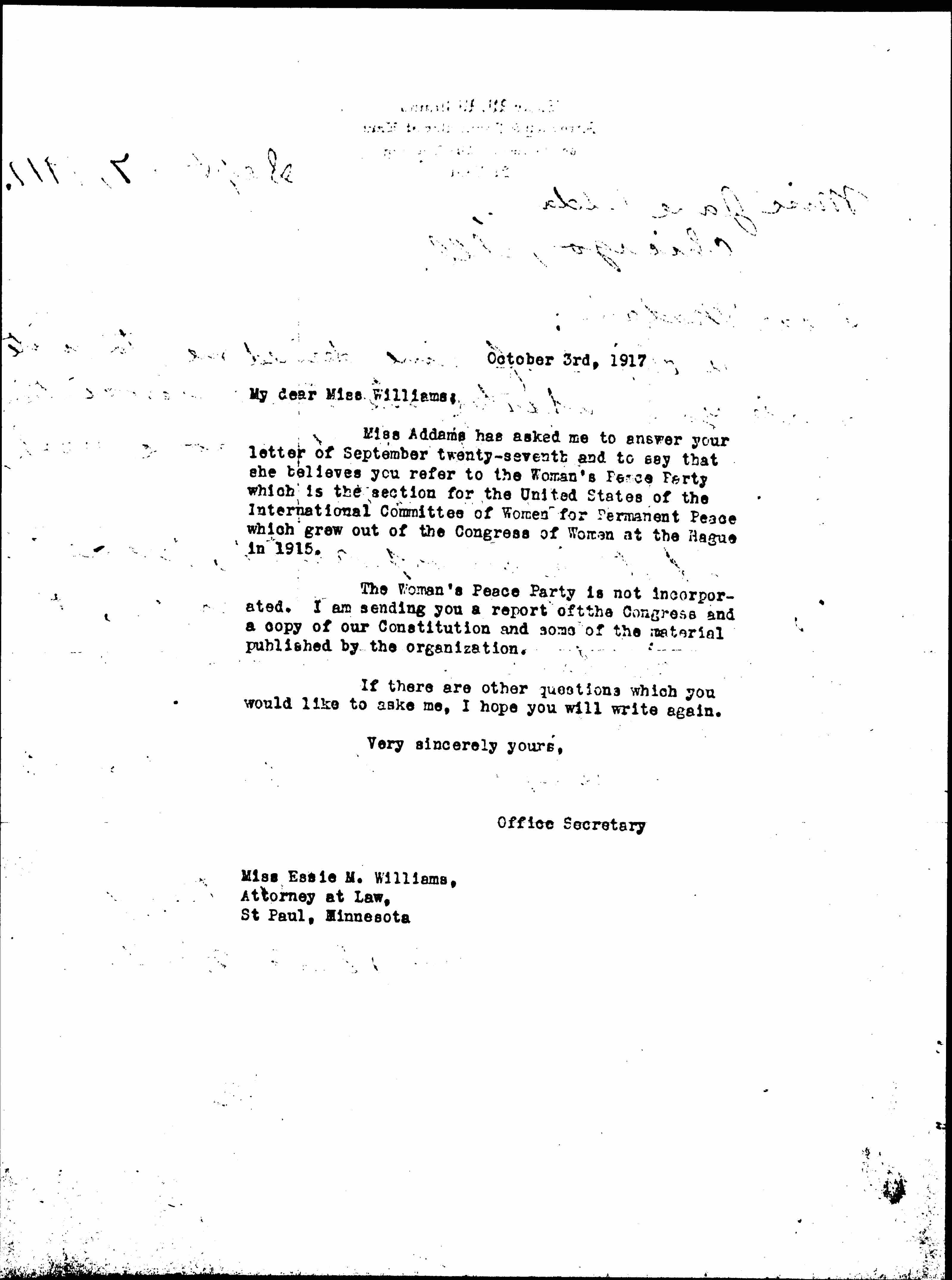 Miss Addams has asked me to answer your letter of September twenty-seventh and to say that she believes you refer to the Woman's Peace Party which is the section for the United States of the International Committee of Women for Permanent Peace which grew out of the Congress of Women at The Hague in 1915.