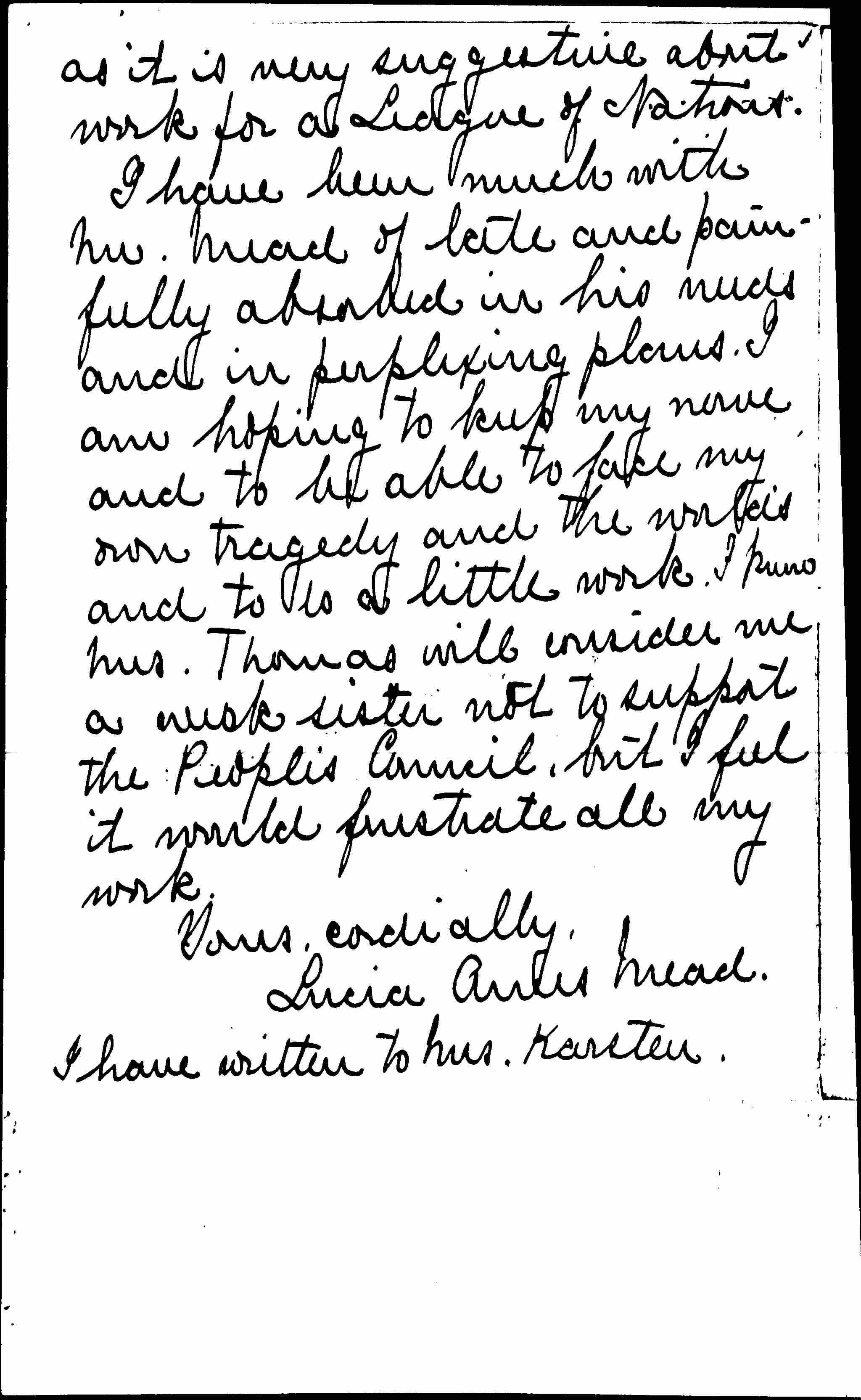 I foresee that we must take a stand about the People's Council which may involve sharp dissension. I understand that the Indiana branch has withdrawn because of activity of certain members in it -- I suppose Mrs. Thomas and Mrs. Karsten. I feel as the New Republic said that the treatment of them was most intolerant but I think we shall injure our influence if we endorse them. The revelations of German duplicity and intrigue damage their cause and make it seem that they have [unconsciously] [page 3] been made the tools of the Pro-Germans.