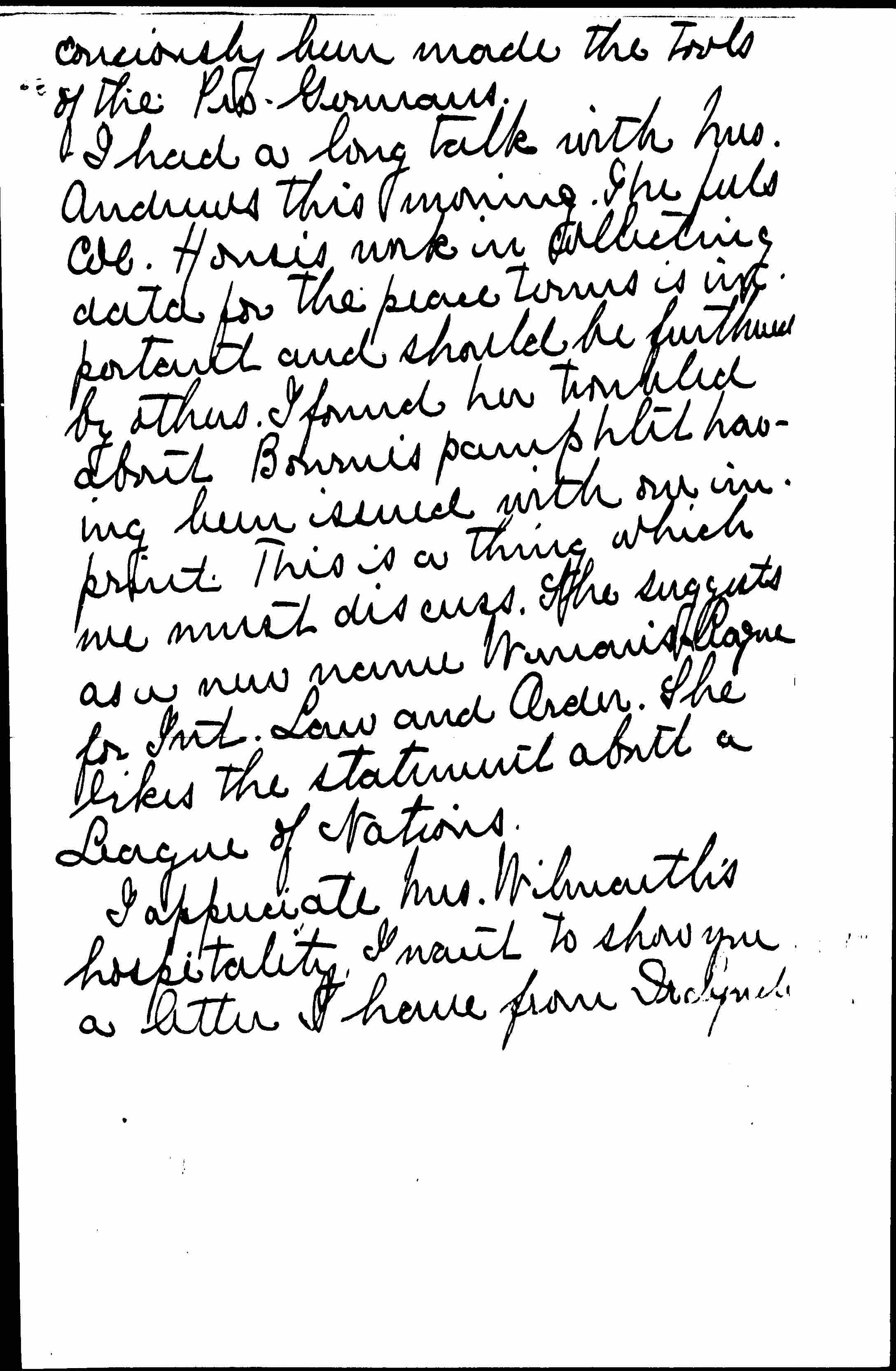 I appreciate Mrs. Wilmarth's hospitality. I want to show you a letter I have from Dr Lynch [page 4] as it is very suggestive about work for a League of Nations.
