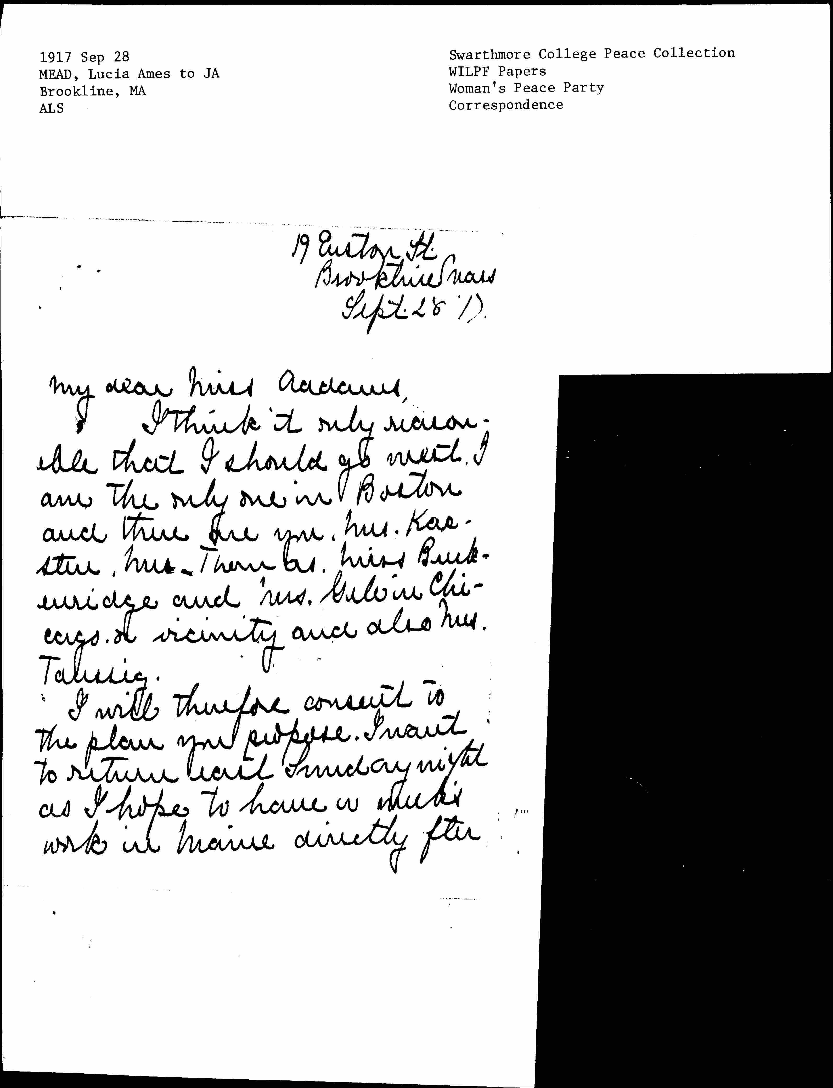I think it only reasonable that I should go west. I am the only one in Boston and there are you, Mrs. Karsten, Mrs. Thomas, Miss [Breckinridge] and Mrs. Gale in Chicago or vicinity and also Mrs. Taussig.