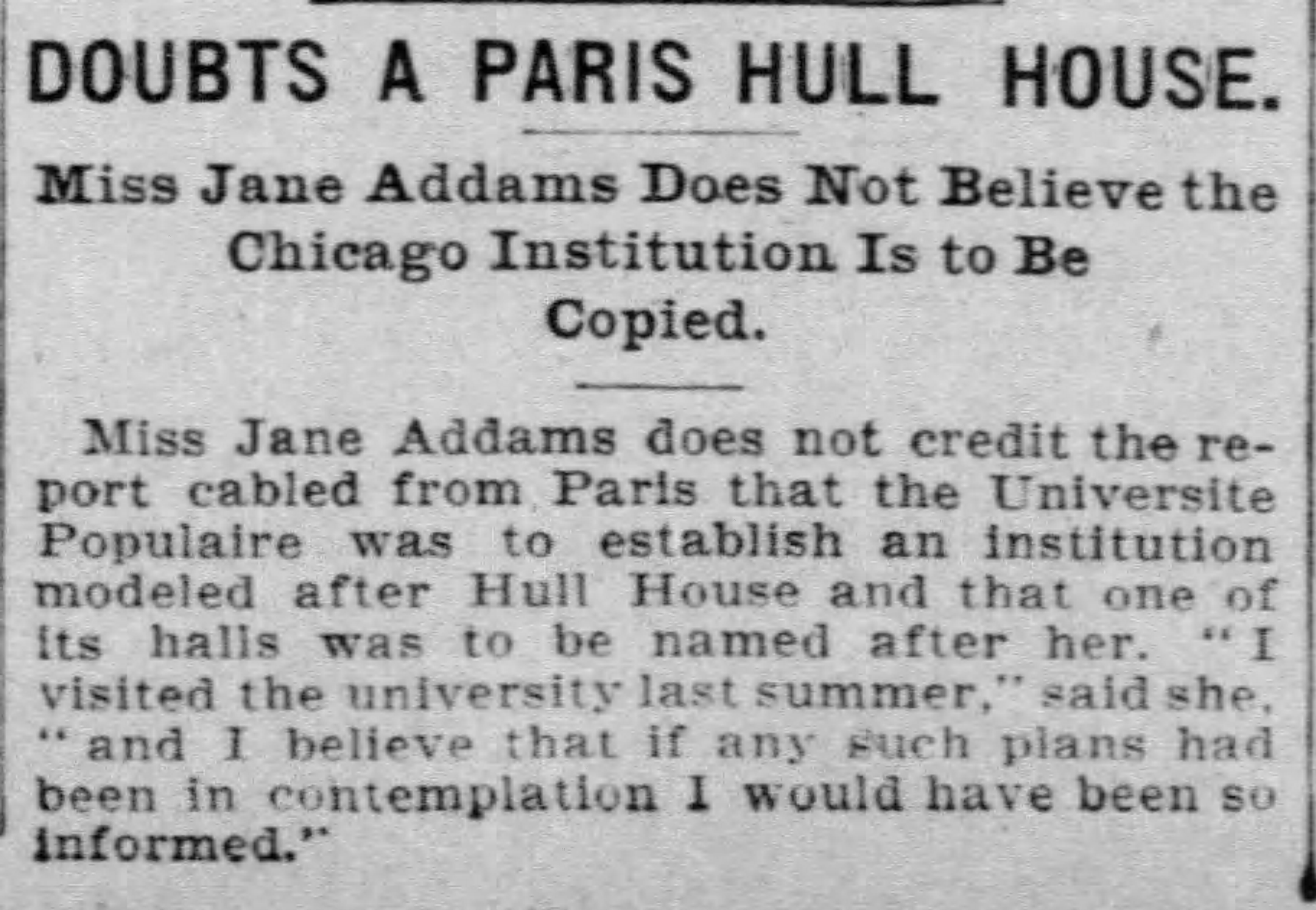 Miss Jane Addams does not credit the report cabled from Paris that the Universite Populaire was to establish an institution modeled after Hull House and that one of its halls was to be named after her. "I visited the university last summer," said she, "and I believe that if any such plans had been in contemplation I would have be so informed."