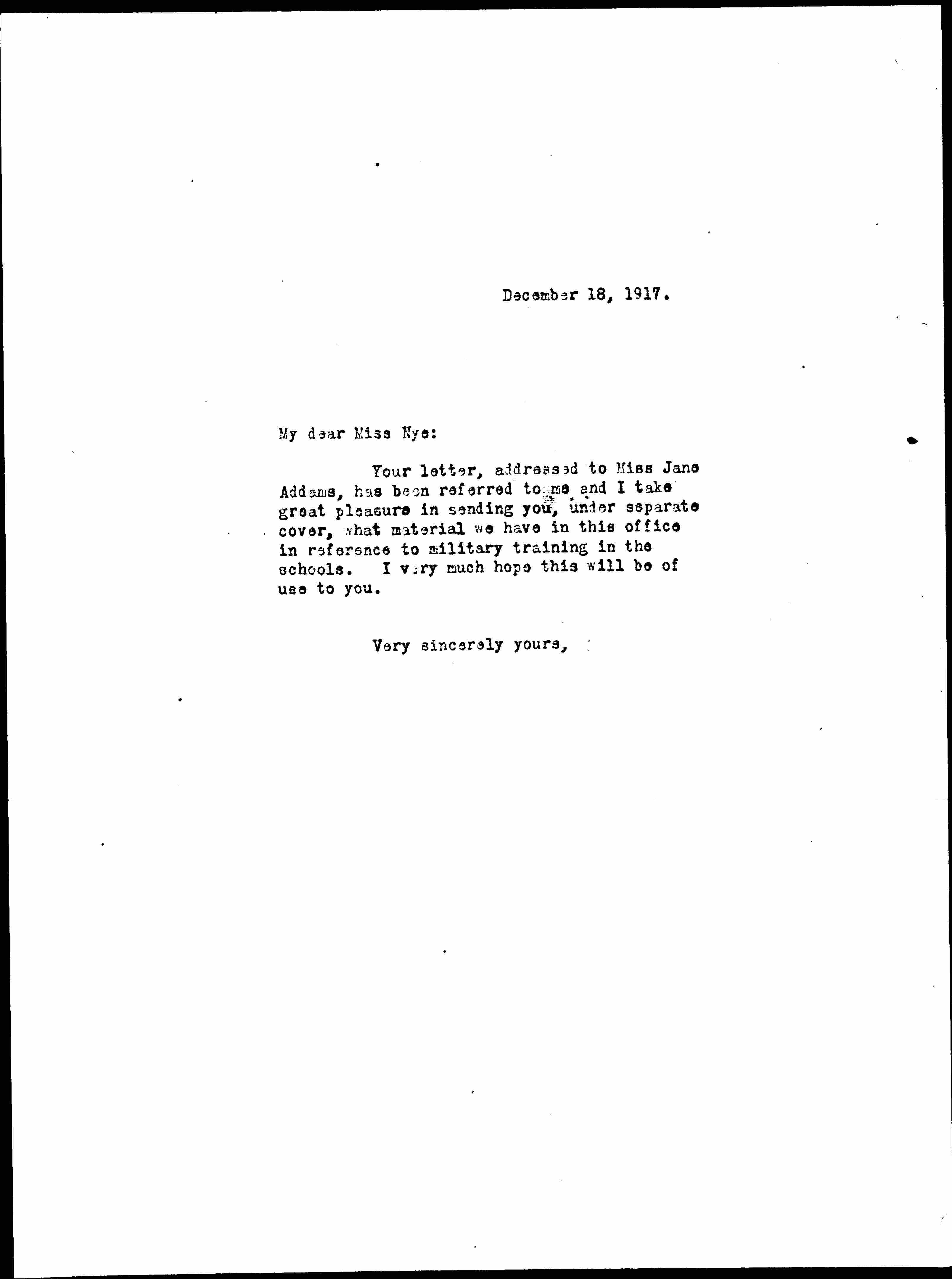 Your letter, addressed to Miss Jane Addams, has been referred to me and I take great pleasure in sending you, under separate cover, what material we have in this office in reference to military training in the schools. I very much hope this will be of use to you.