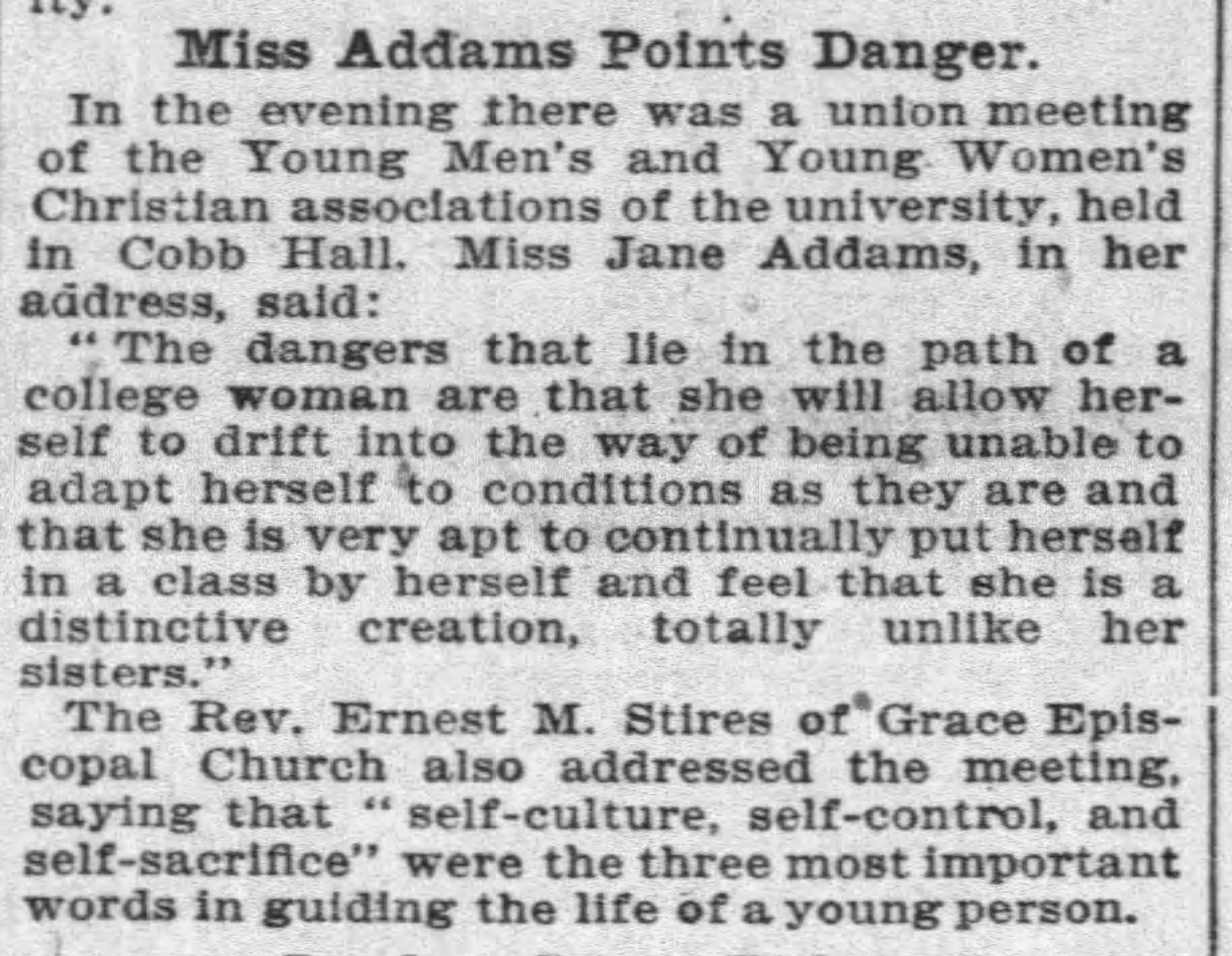 "The dangers that lie in the path of a college woman are that she will allow herself to drift into the way of being unable to adapt herself to conditions as they are and that she is very apt to continually put herself in a class by herself and feel that she is a distinctive creation, totally unlike her sisters."