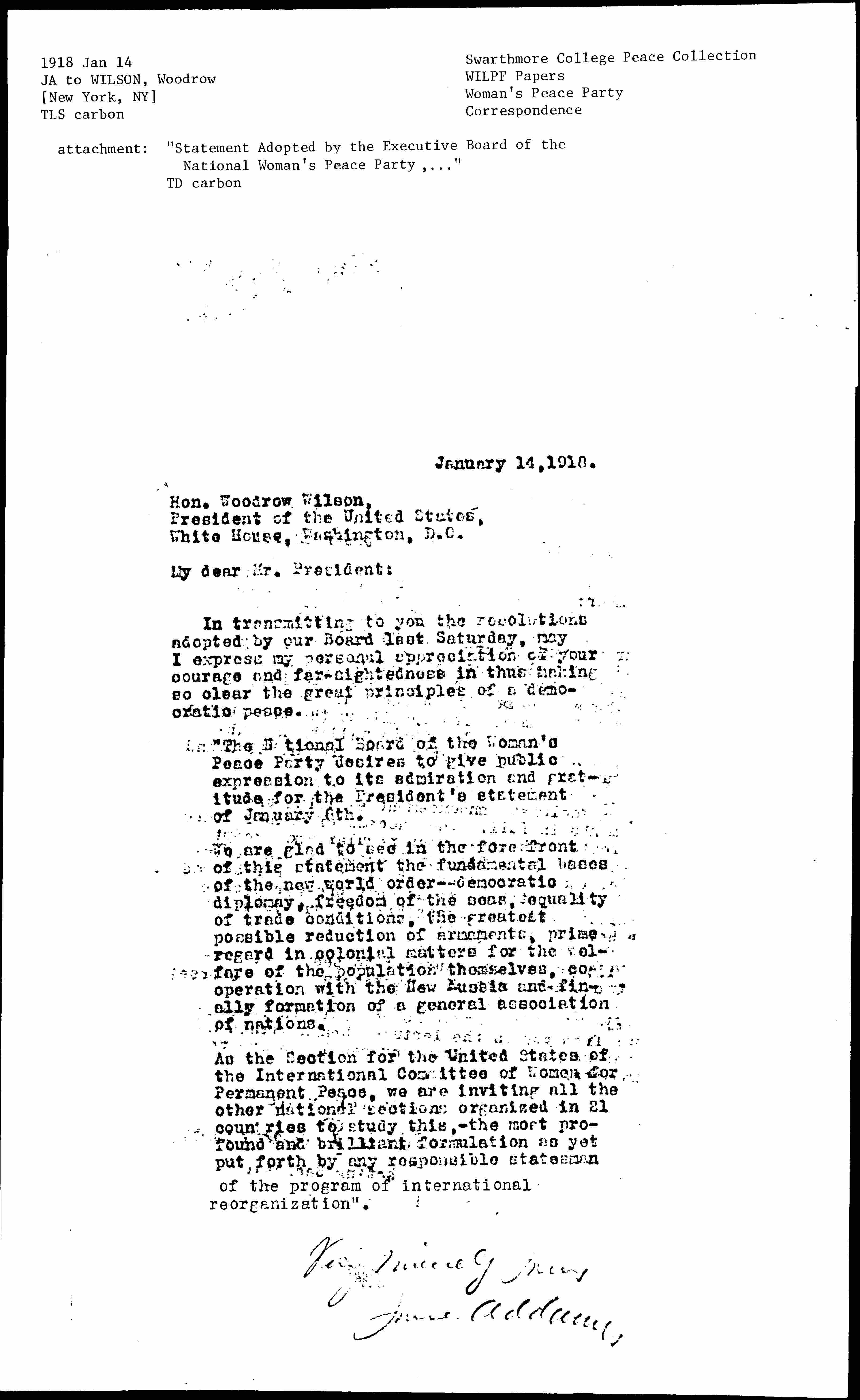 "The National Board of the Woman's Peace Party desires to give public expression to its admiration and gratitude for the President's statement of January 8th.
