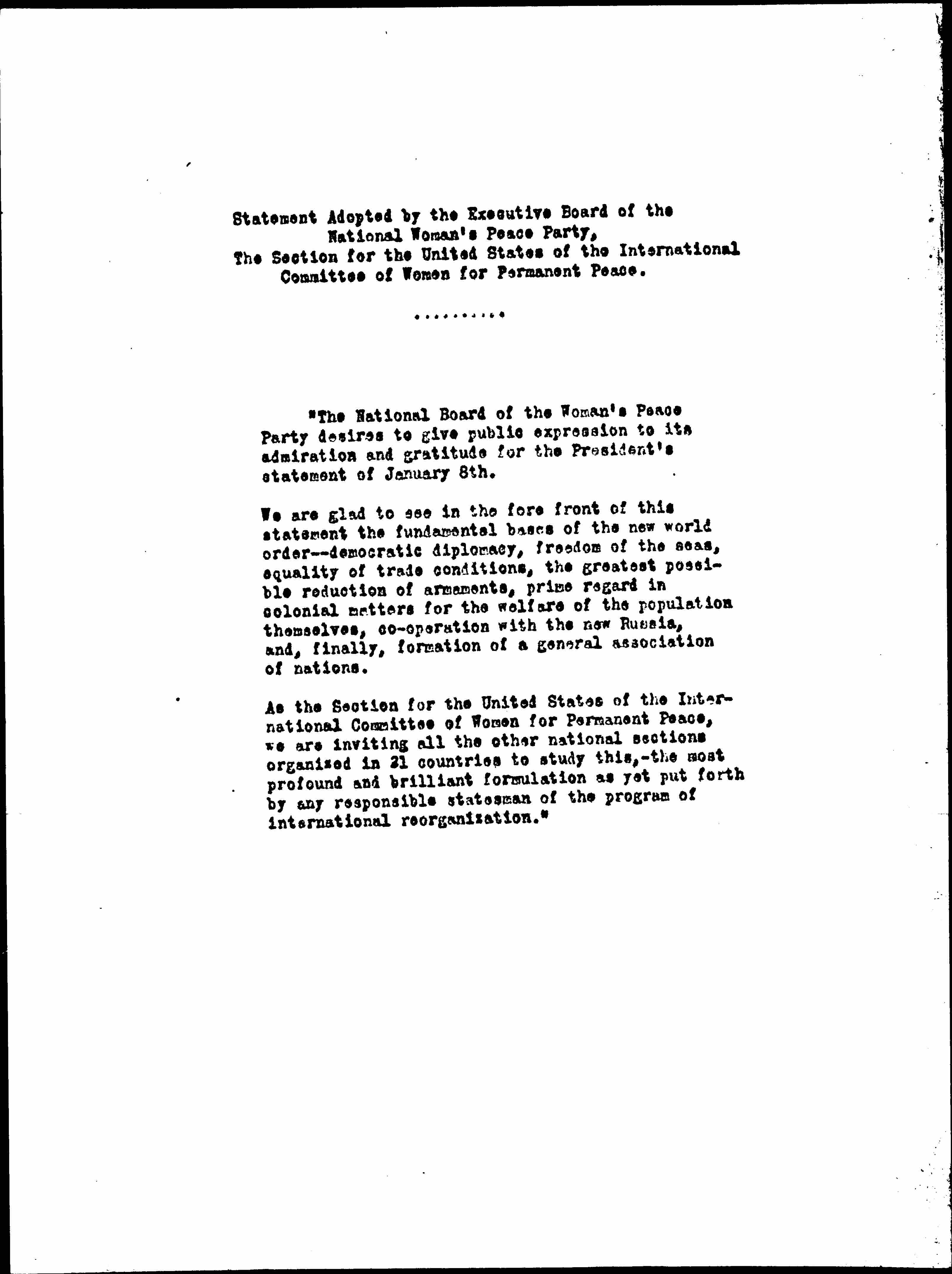 "The National Board of the Woman's Peace Party desires to give public expression to its admiration and gratitude for the President's statement of January 8th.