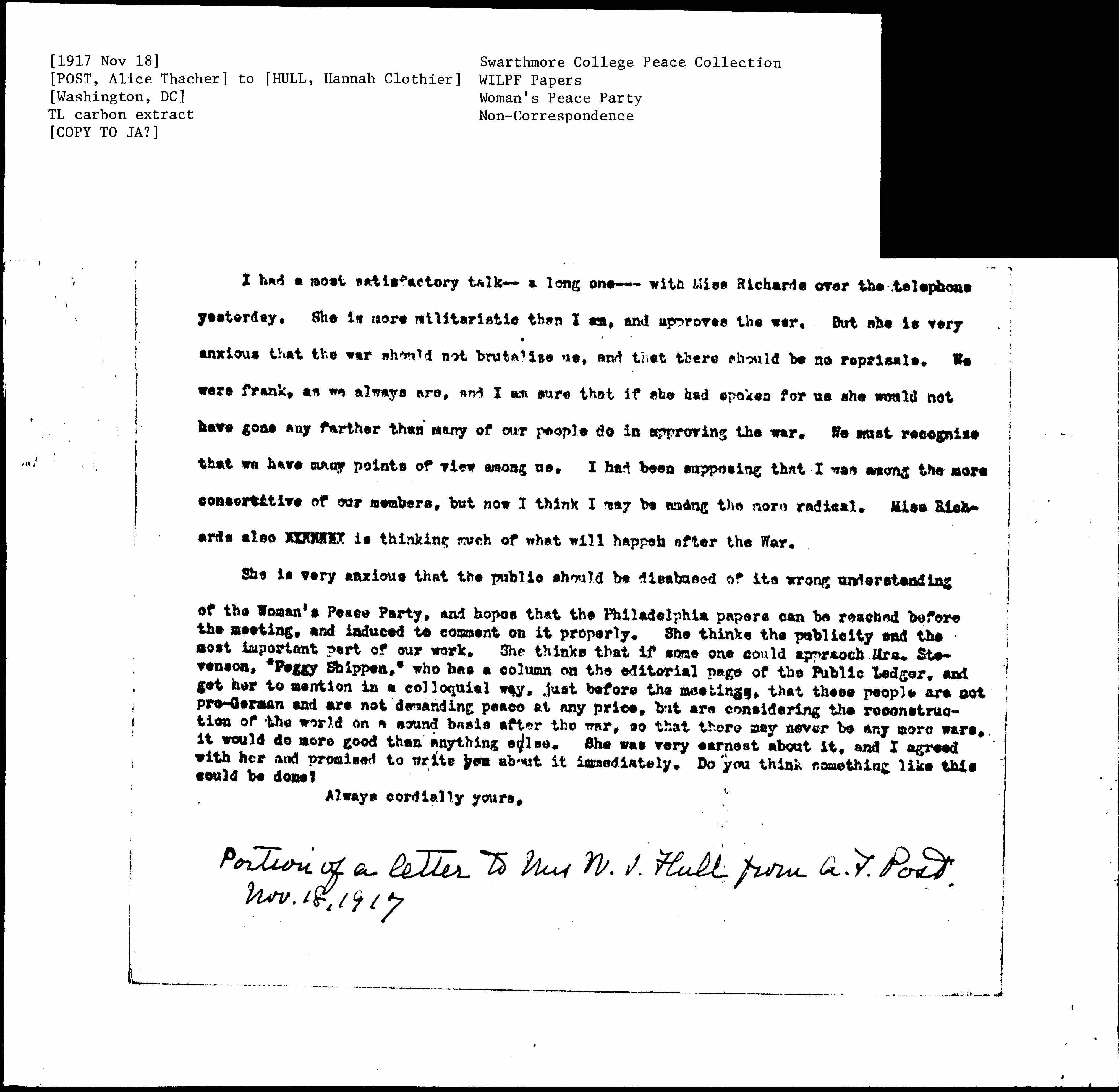 She is very anxious that the public should be disabused of its wrong understanding of the Woman's Peace Party, and hopes that the Philadelphia papers can be reached before the meeting, and induced to comment on it properly. She thinks the publicity end the most important part of our work. She thinks that if some one chould approach Mrs. Stevenson, "Peggy Shippen," who has a column on the editorial page of the Public Ledger, and get her to mention in a colloquial way, just before the meetings, that these people are not pro-German and are not demanding peace at any price, but are considering the reconstruction of the world on a sound basis after the war, so that there may never be any more wars, it would do more good than anything else. She was very earnest about it, and I agreed with her and promised to write you about it immediately. Do you think something like this could be done?