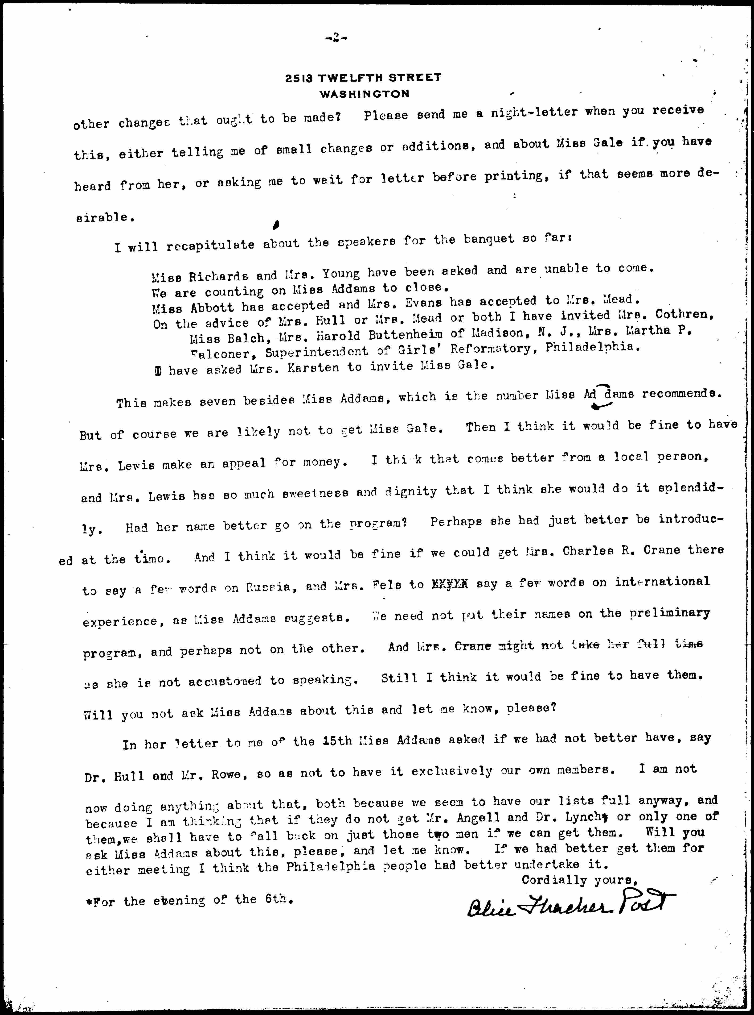 This makes seven besides Miss Addams, which is the number Miss Addams recommends. But of course we are likely not to get Miss Gale. Then I think it would be fine to have Mrs. Lewis make an appeal for money. I think that comes better from a local person, and Mrs. Lewis has so much sweetness and dignity that I think she would do it splendidly. Had her name better go on the program? Perhaps she had just better be introduced at the time. And I think it would be fine if we could get Mrs. Charles R. Crane there to say a few words on Russia, and Mrs. Fels to [illegible] say a few words on international experience, as Miss Addams suggests. We need not put their names on the preliminary program, and perhaps not on the other. And Mrs. Crane might not take her full time as she is not accustomed to speaking. Still I think it would be fine to have them. Will you not ask Miss Addams about this and let me know, please?