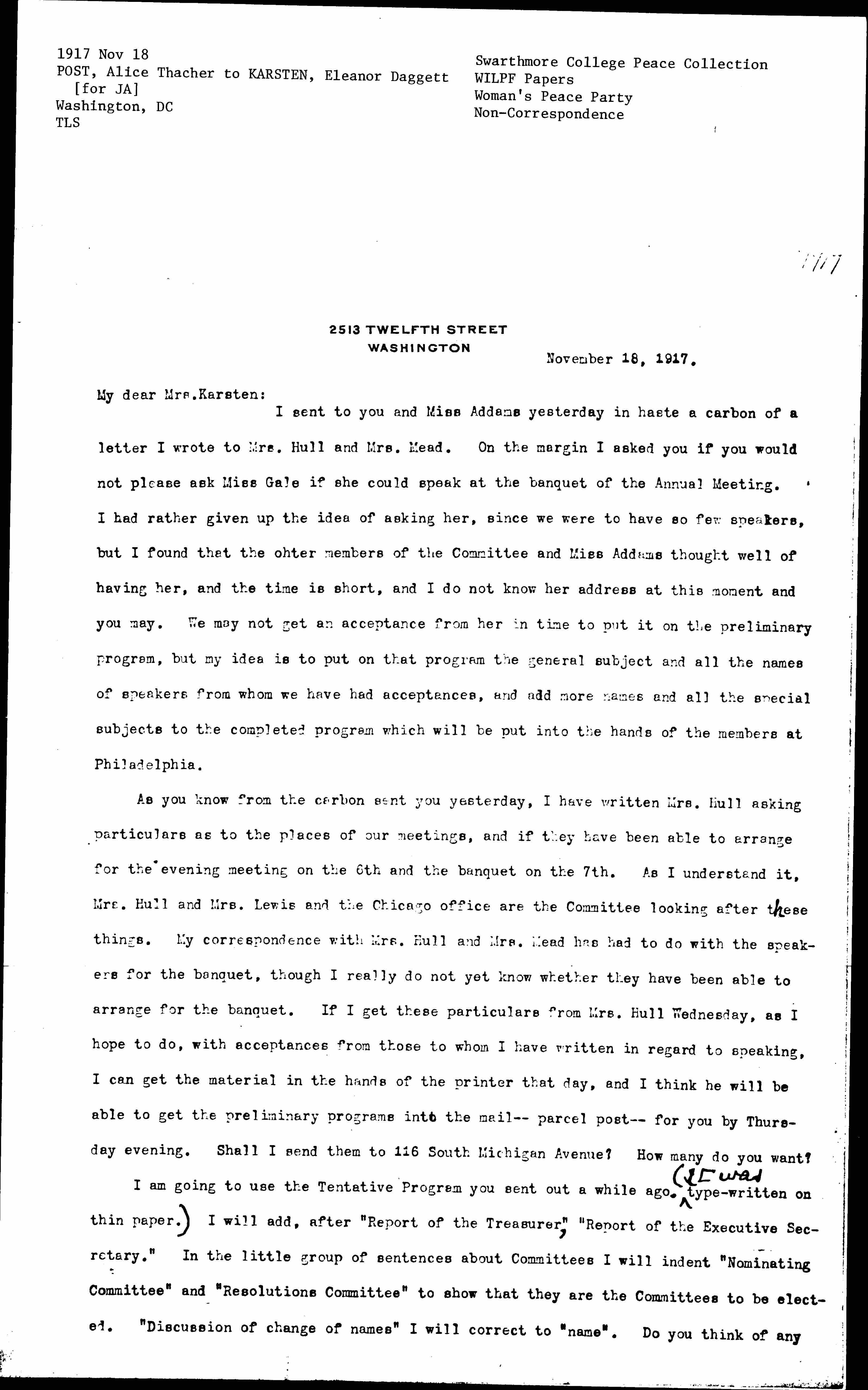 I sent to you and Miss Addams yesterday in haste a carbon of a letter I wrote to Mrs. Hull and Mrs. Mead. On the margin I asked you if you would not please ask Miss Gale if she could speak at the banquet of the Annual Meeting. I had rather given up the idea of asking her, since we were to have so few speakers, but I found that the other members of the Committee and Miss Addams thought well of having her, and the time is short, and I do not know her address at this moment and you may. We may not get an acceptance from her in time to put it on the preliminary program, but my idea is to put on that program the general subject and all the names of speakers from whom we have had acceptances, and add more names and all the special subjects to the completed program which will be put into the hands of the members at Philadelphia.