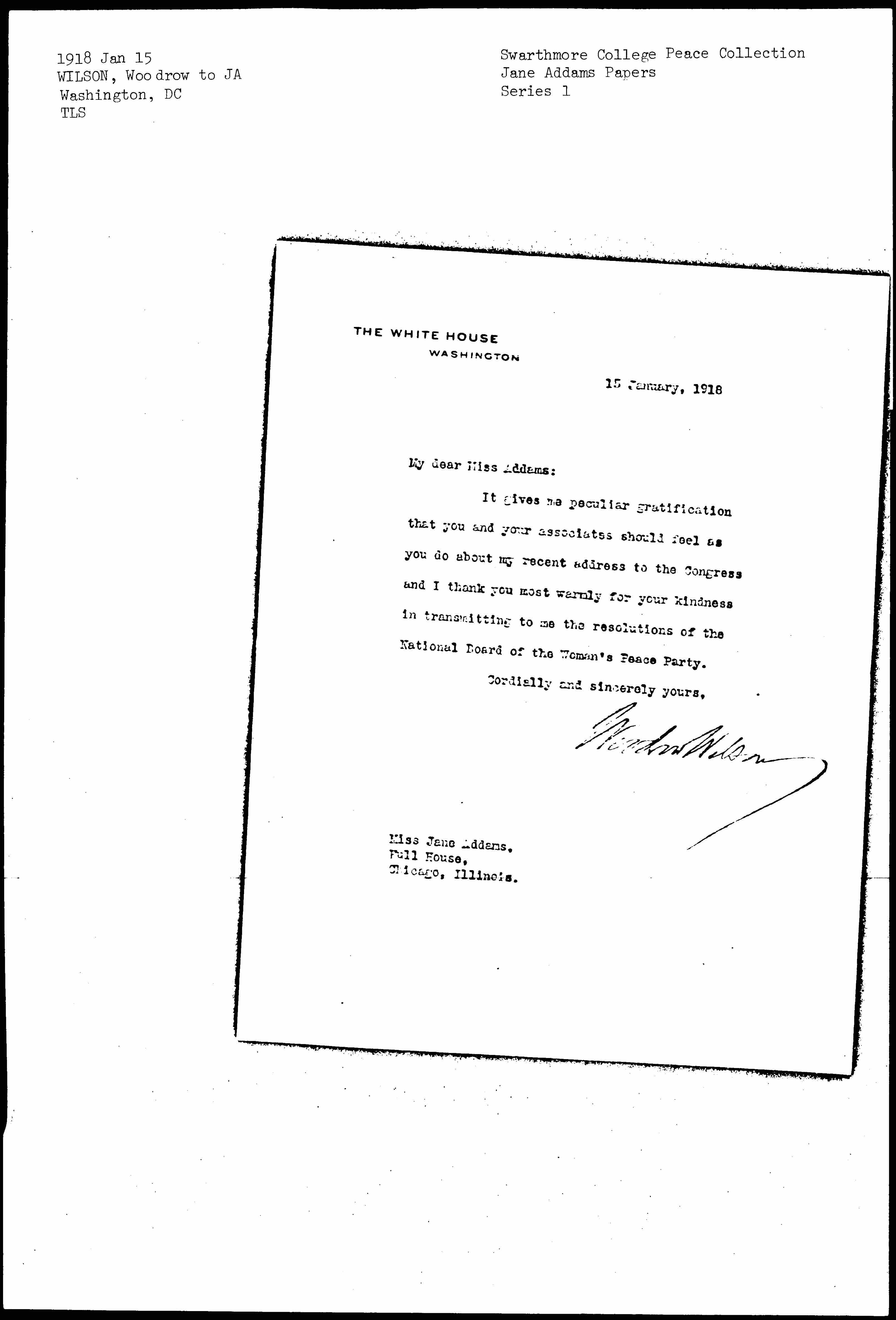 It gives me peculiar gratification that you and your associates should feel as you do about my recent address to the Congress and I thank you most warmly for your kindness in transmitting to me the resolutions of the National Board of the Woman's Peace Party.