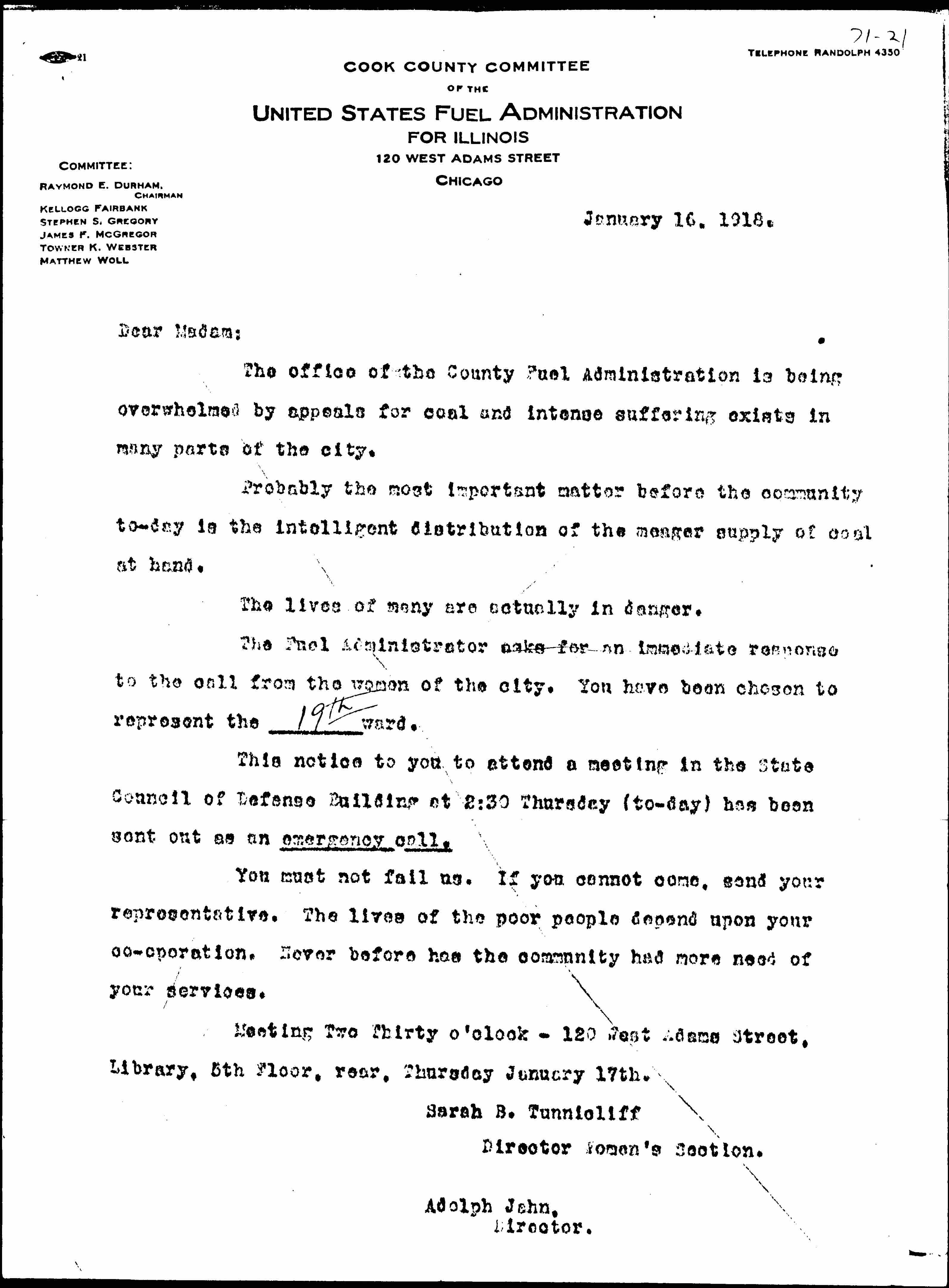 The Fuel Administrator asks for an immediate response to the call from the women of the city. You have been chosen to represent the ↑19th↓ ward.