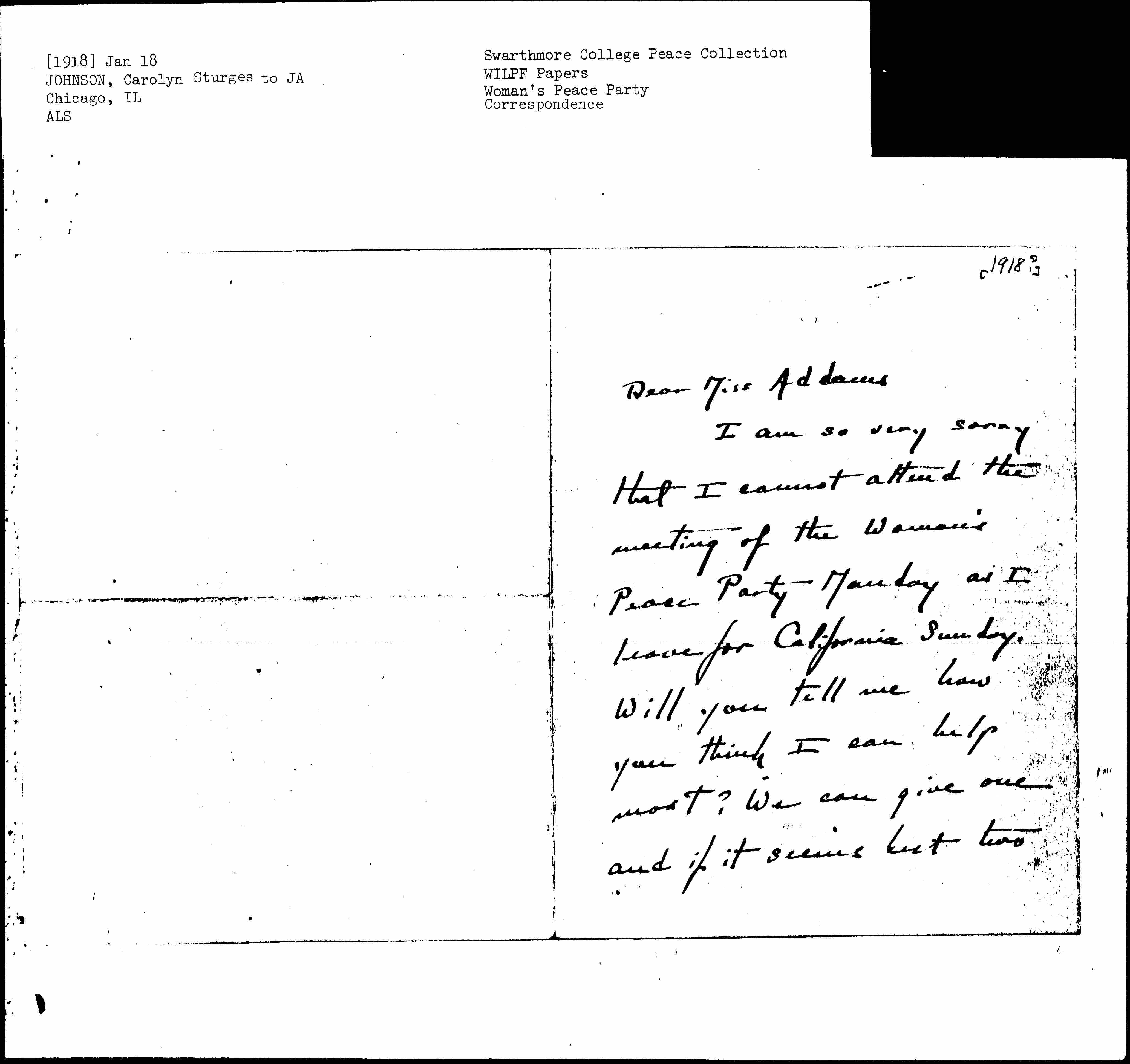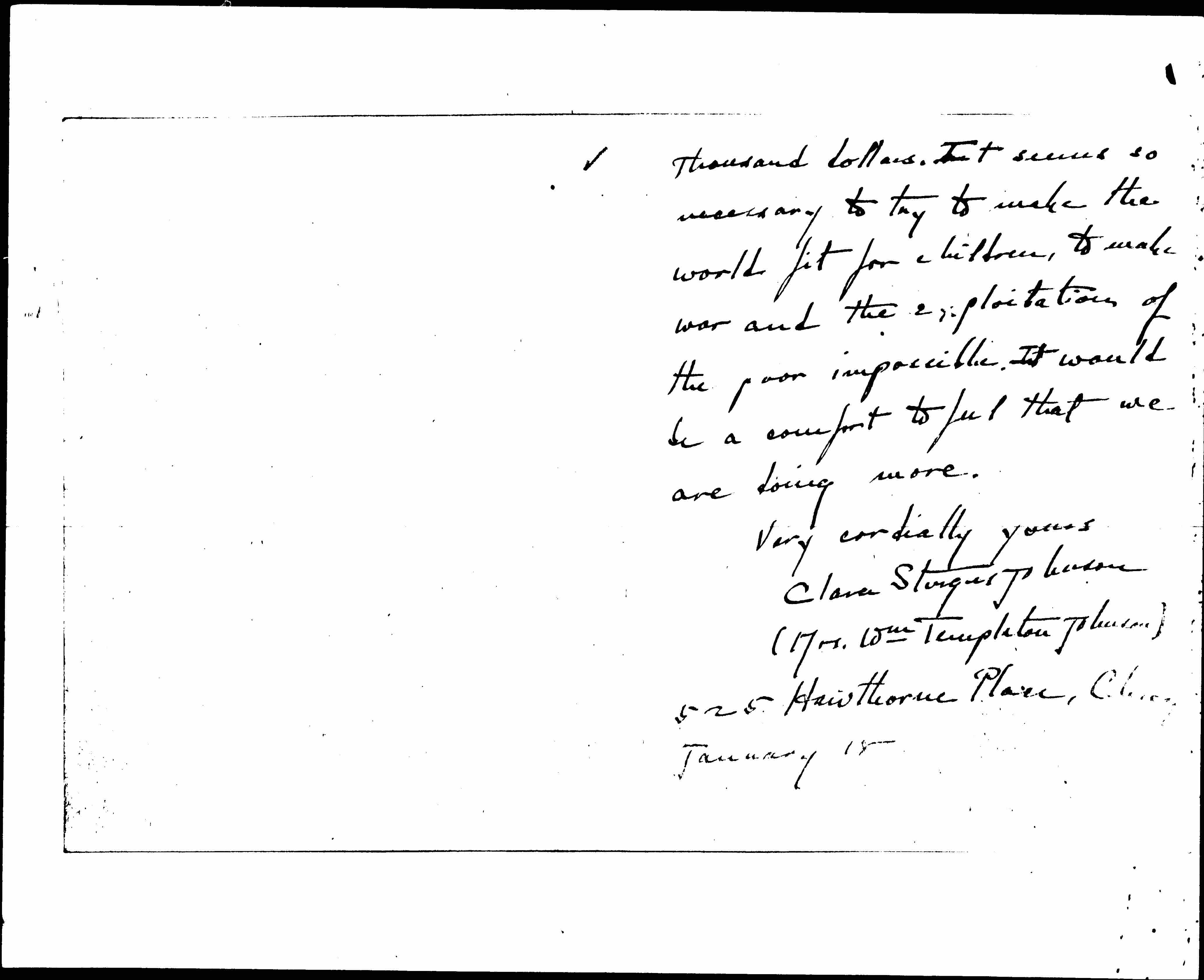 I am so very sorry that I cannot attend the meeting of the Woman's Peace Party Monday as I leave for California Sunday. Will you tell me how you think I can help most? We can give one and if it seems best two [page 2] thousand dollars. It seems so necessary to try to make the world fit for children, to make war and the exploitation of the poor impossible. It would be a comfort to feel that we are doing more.