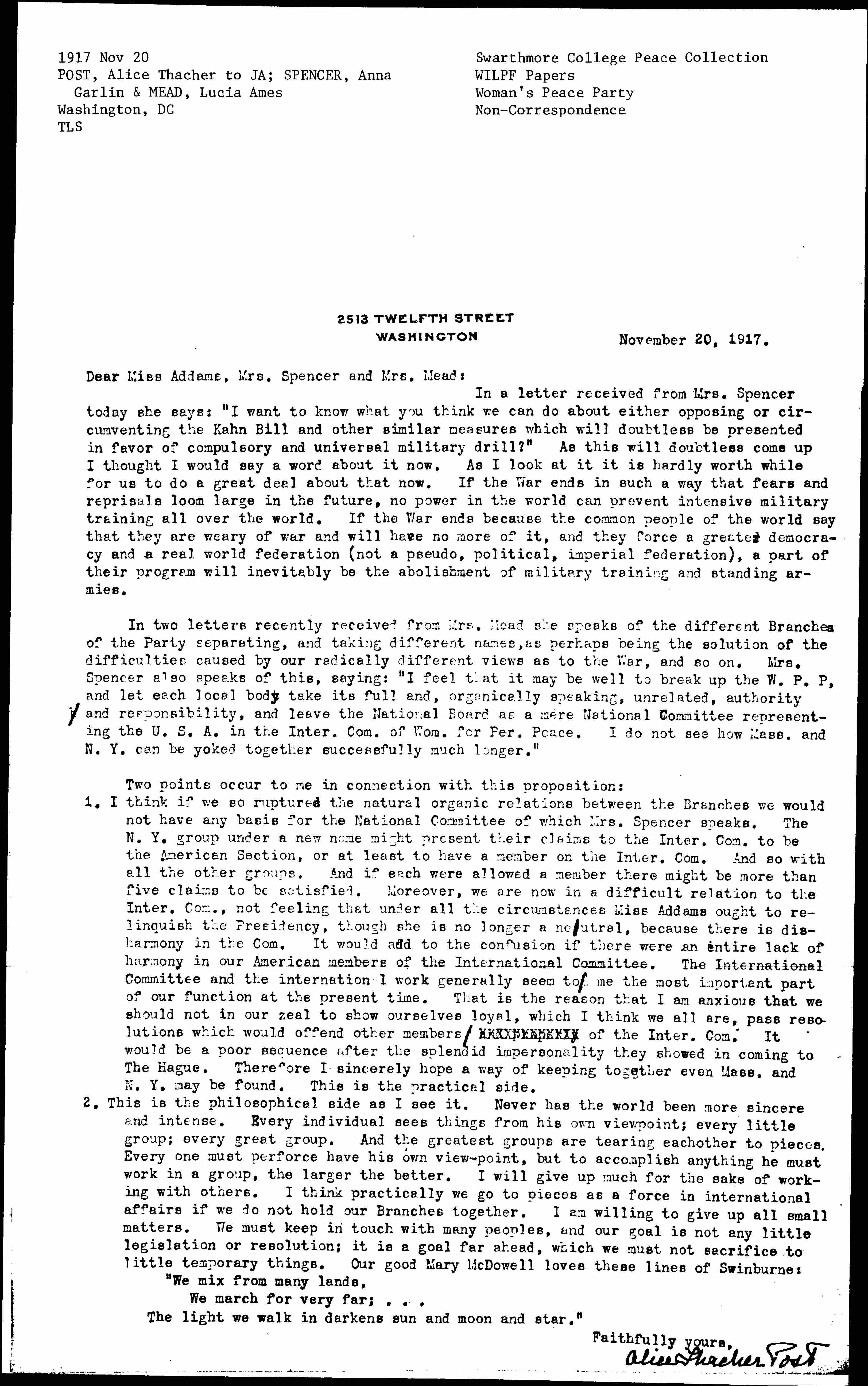 1. I think if we so ruptured the natural organic relations between the Branches we would not have any basis for the National Committee of which Mrs. Spencer speaks. The N.Y. group under a new name might present their claims to the Inter. Com. to be the American Section, or at least to have a member on the Inter. Com. And so with all the other groups. And if each were allowed a member there might be more than five claims to be satisfied. Moreover, we are now in a difficult relation to the Inter. Com., not feeling that under all the circumstances Miss Addams ought to relinquish the Presidency, though she is no long a neutral, because there is disharmony in the Com. It would add to the confusion if there were an entire lack of harmony in our American members of the International Committee. The International Committee and the international work generally seems to me the most important part of our function at the present time. That is the reason that I am anxious that we should not in our zeal to show ourselves loyal, which I think we all are, pass resolutions which would offend other members and property of the Inter. Com. It would be a poor sequence after the splendid impersonality they showed in coming to The Hague. Therefore I sincerely hope a way of keeping together even Mass. and N.Y. may be found. This is the practical side.