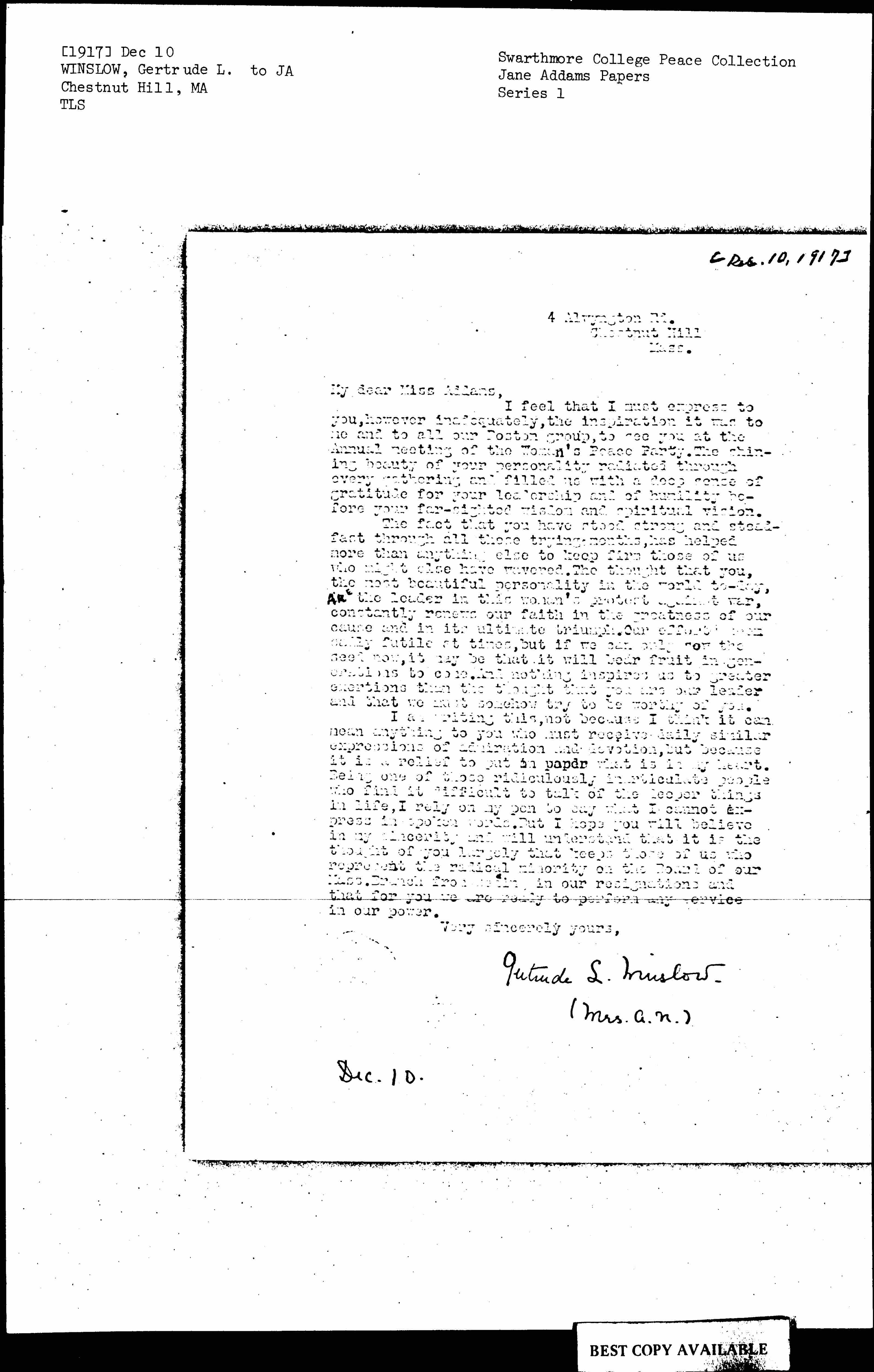 The fact that you have stood strong and steadfast through all these trying months, has helped more than anything else to keep firm those of us who might else have wavered. The thought that you, the most beautiful personality in the world [today], are the leader in this woman's protest against war, constantly renews our faith in the greatness of our cause and in its ultimate triumph. Our [efforts seem sadly] futile at times, but if we can only sow the seed now, it may be that it will bear fruit in generations to come. And nothing inspires us to greater exertions than the thought that you are our leader and that we must somehow try to be worthy of you.