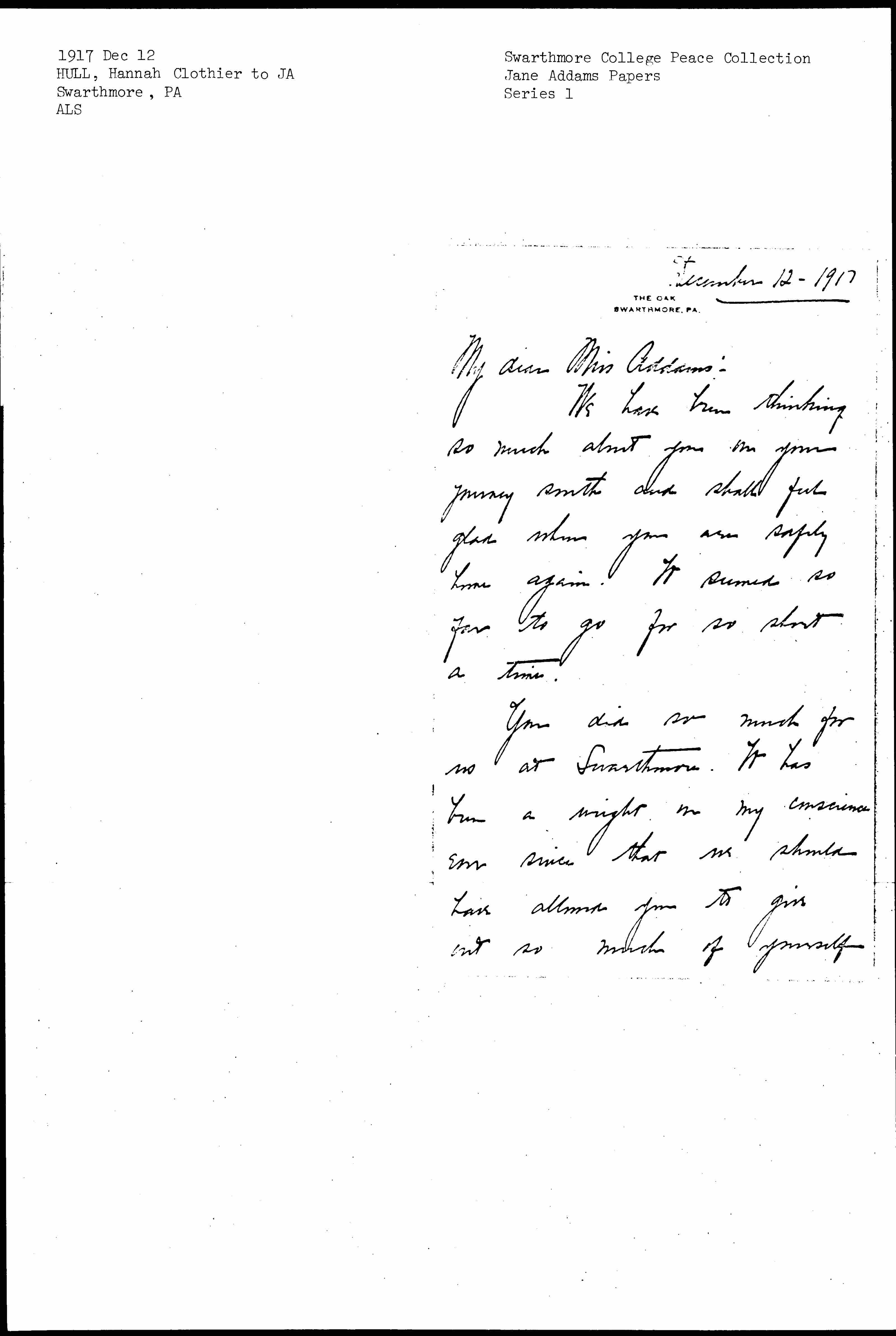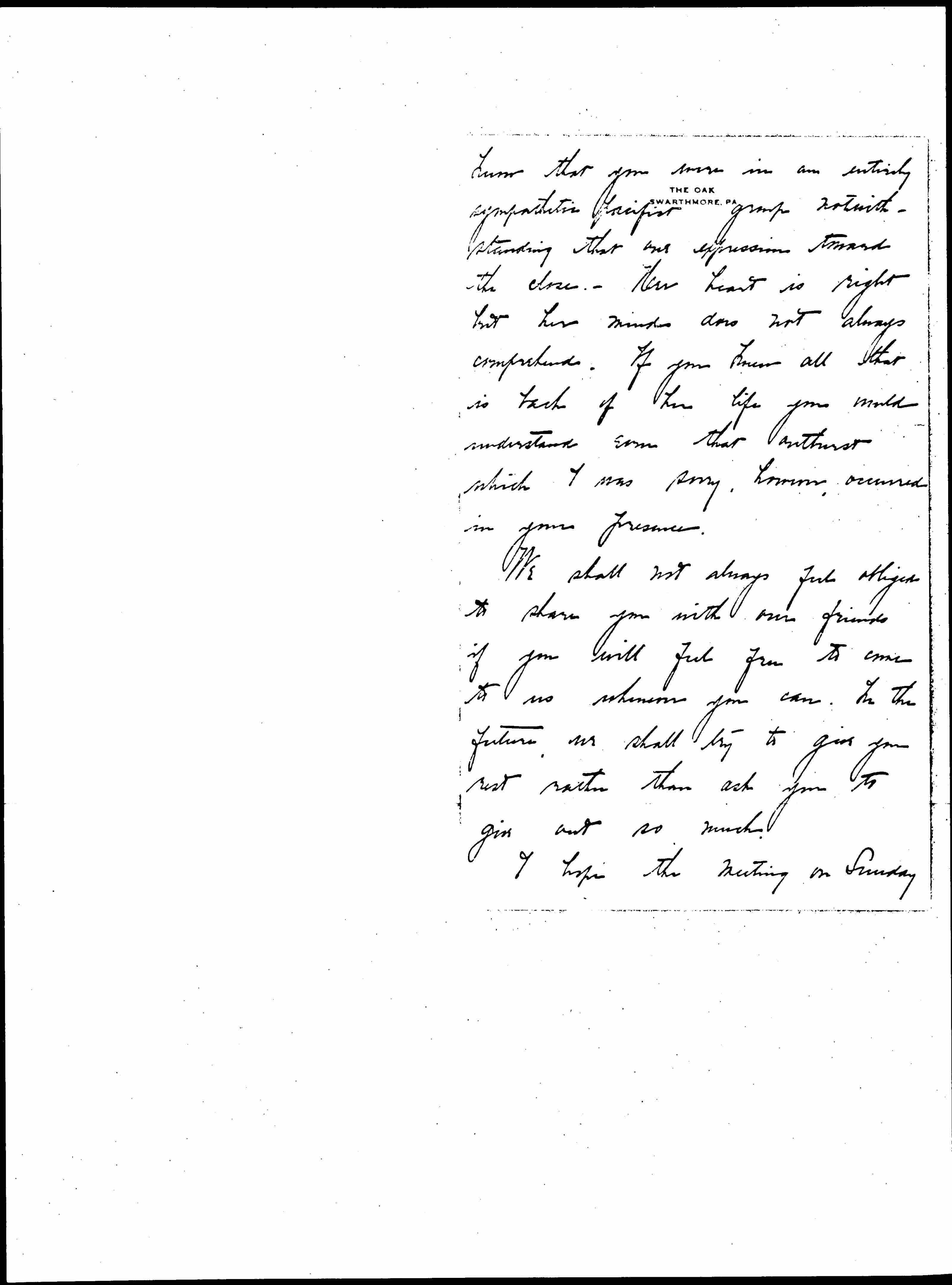 You did so much for us at Swarthmore. It has been a weight on my conscience ever since that we should have allowed you to give out so much of yourself [page 2] on Sunday -- especially after the full busy days which preceded. The community here was so interested in having you that I fear I allowed our personal friends' eagerness to share the visit outweigh the responsibility I should have felt to have protected you. If Sunday afternoon did not overtire you perhaps it will be some satisfaction to you to know how greatly such an opportunity was appreciated by all those who were here. We have received many expressions of gratitude. I want you to [page 3] know that you were in an entirely sympathetic pacifist group notwithstanding that one expression toward the close. Her heart is right but her mind does not always comprehend. If you knew all that is back of her life you would understand even that outburst which I was sorry, however, occurred in your presence.