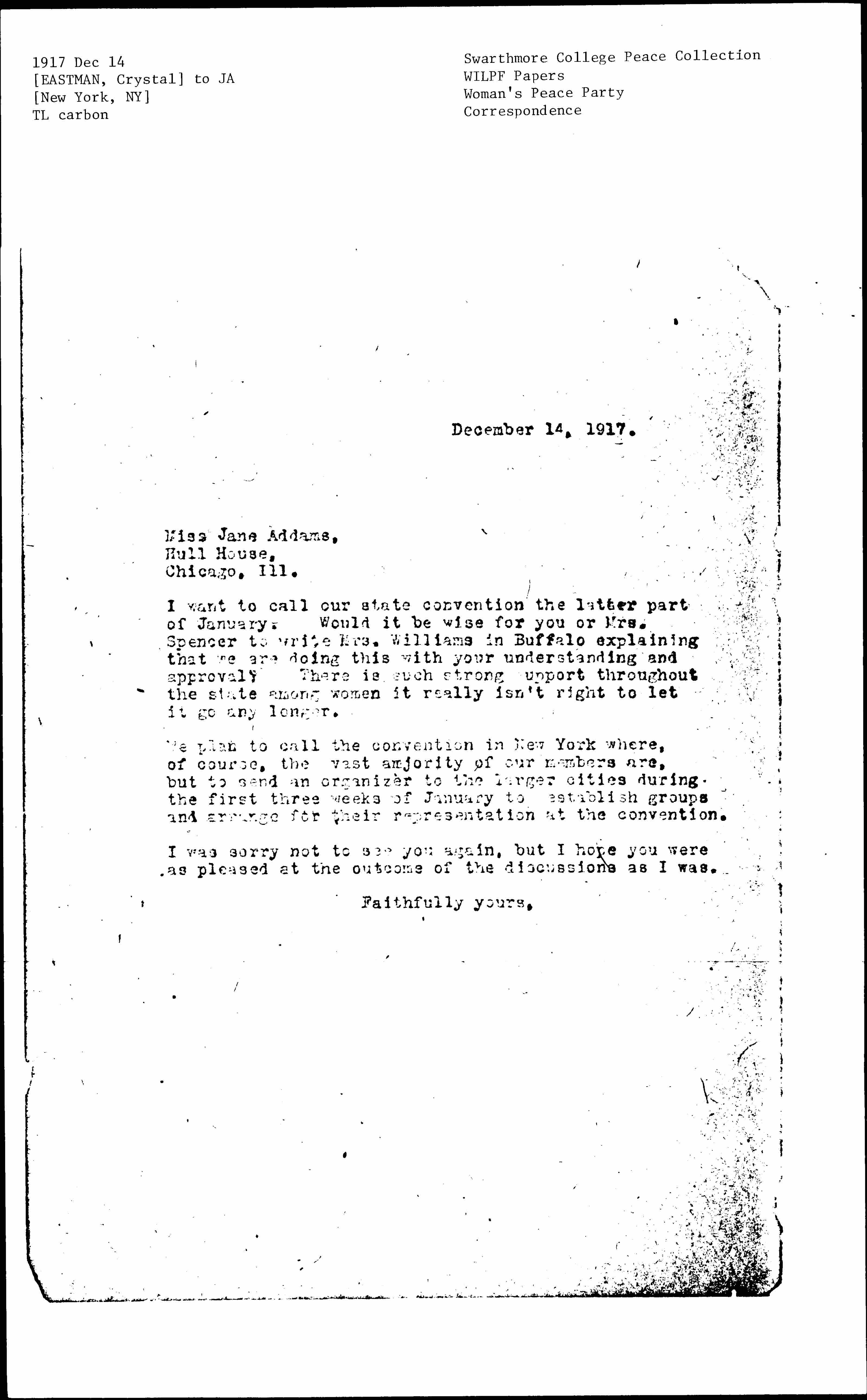 I want to call our state convention the latter part of January. Would it be wise for you or Mrs. Spencer to write Mrs. Williams in Buffalo explaining that we are doing this with your understanding and approval? There is such strong support throughout the state among women it really isn't right to let it go any longer.