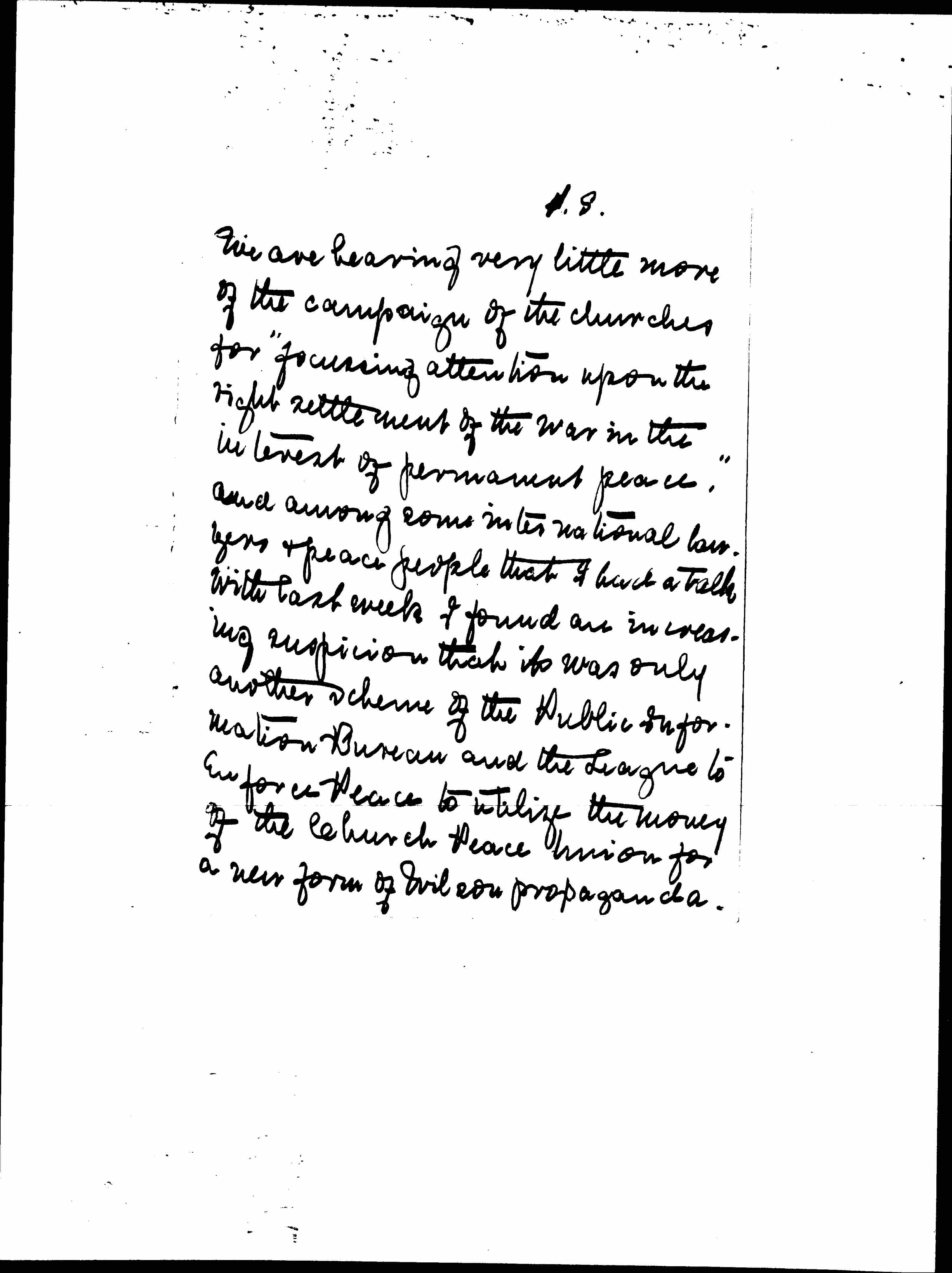 We are hearing very little more of the campaign of the churches for "[focusing] attention upon the right settlement of the war in the interest of permanent peace," and among some international lawyers & peace people that I had a talk with last week I found an increasing suspicion that it was only another scheme of the Public Information Bureau and the League to Enforce Peace to utilize the money of the Church Peace Union for a new form of Wilson propaganda.
