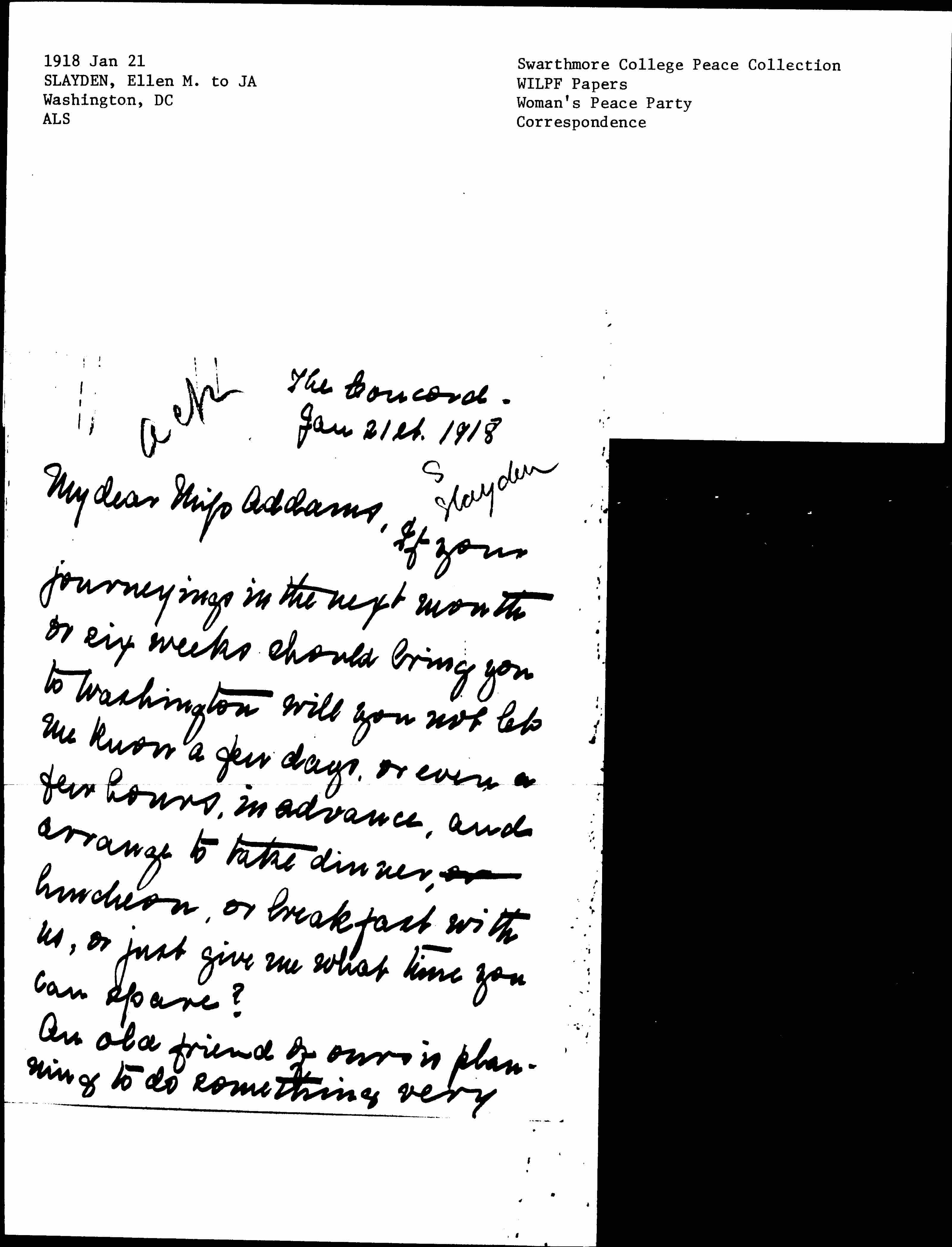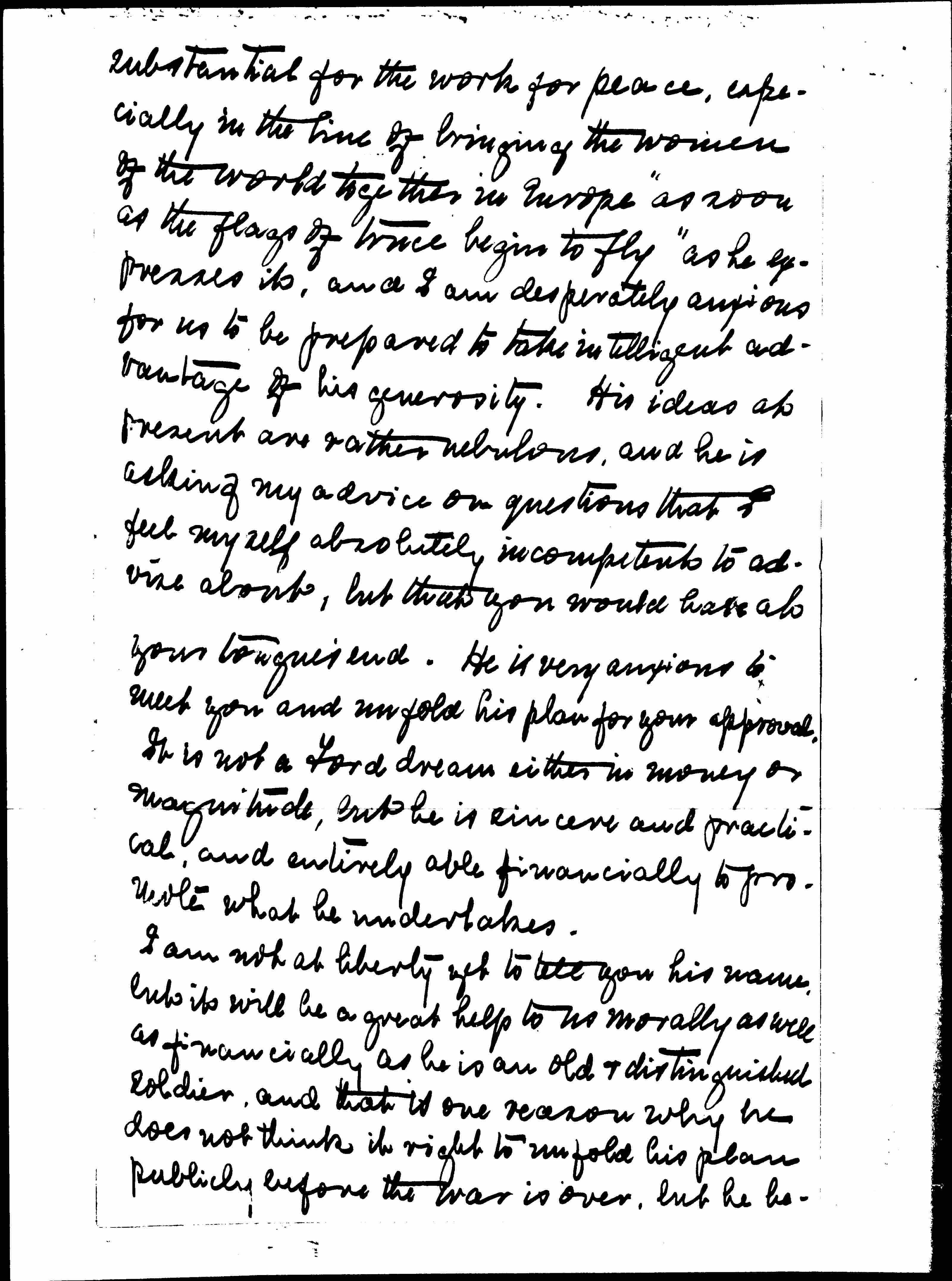 An old friend of ours is planning to do something very [page 2] substantial for the work for peace, especially in the line of bringing the women of the world together in Europe "as soon as the flags of truce begin to fly" as he expresses it, and I am desperately anxious for us to be prepared to take intelligent advantage of his generosity. His ideas at present are rather nebulous, and he is asking my advice on questions that I feel myself absolutely incompetent to advise about, but that you would have at your tongue's end. He is very anxious to meet you and unfold his plan for your approval. It is not a Ford dream either in money or magnitude, but he is sincere and practical, and entirely able financially to promote what he undertakes.