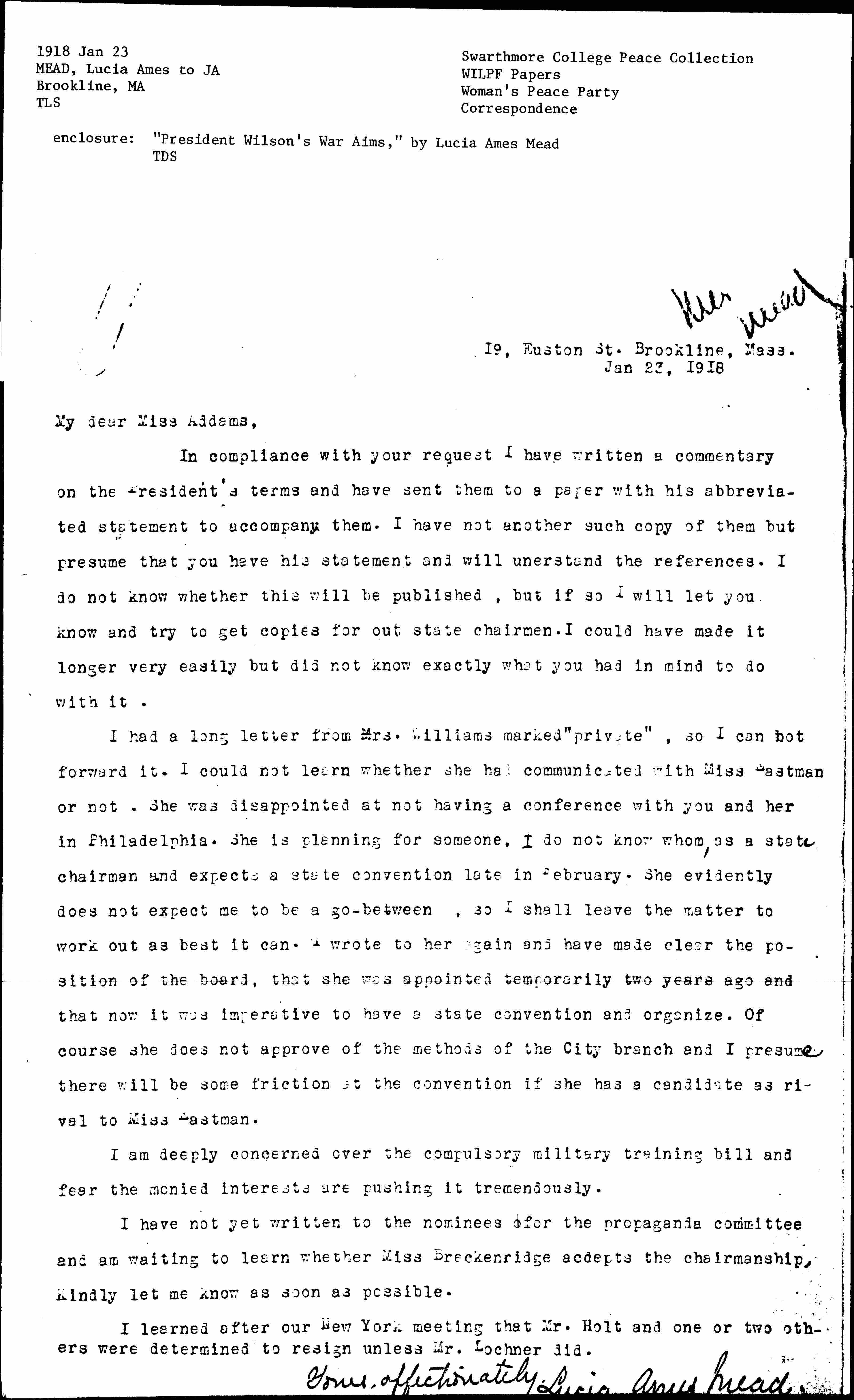 I have not yet written to the nominees for the propaganda committee and am waiting to learn whether Miss [Breckinridge] accepts the chairmanship. Kindly let me know as soon as possible.