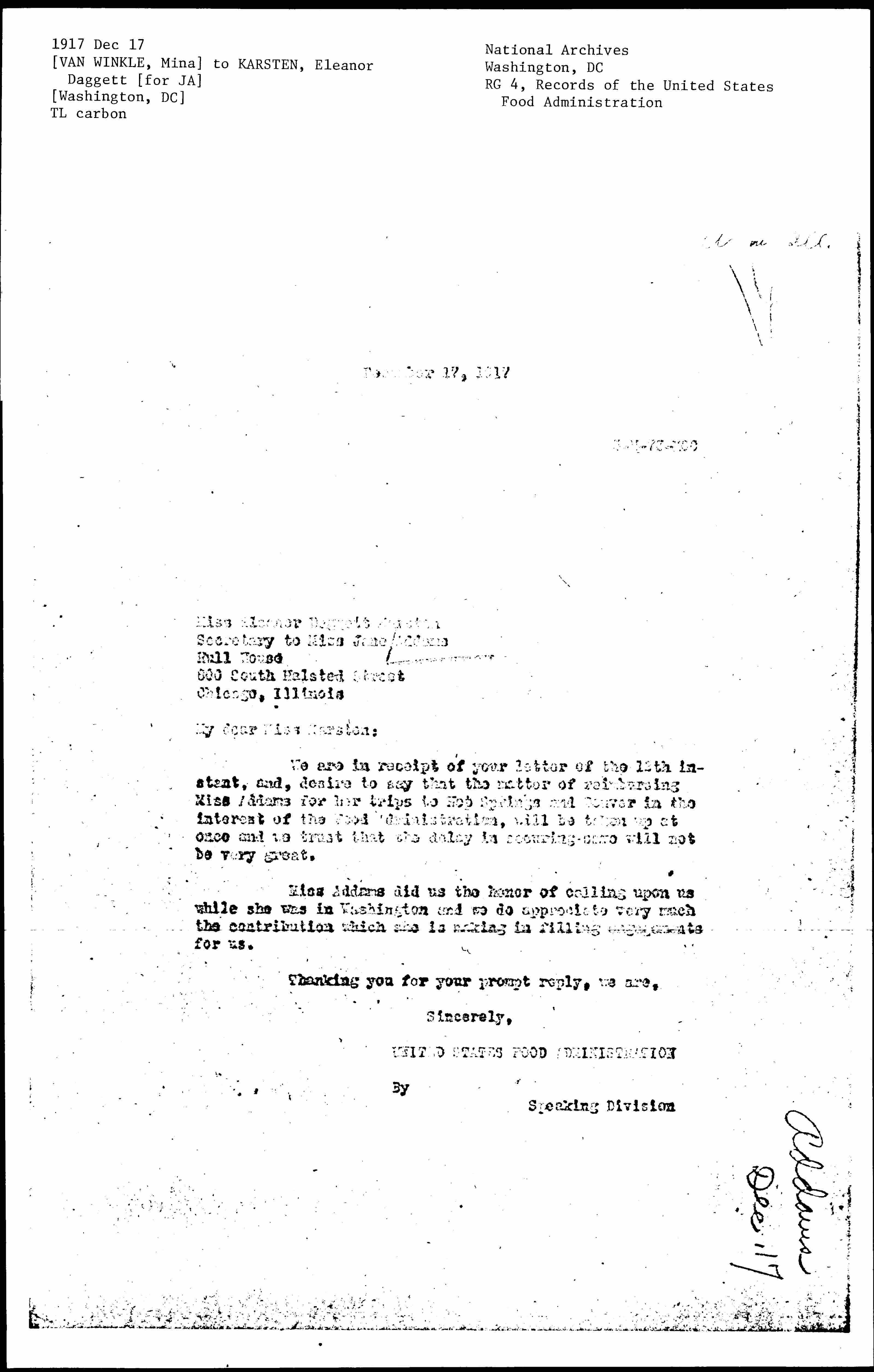 We are in receipt of your letter of the 12th instant, and, desire to say that the matter of reimbursing Miss Addams for her trips to Hot Springs and Denver in the interest of the Food Administration, will be taken up at once and we trust that the delay in securing same will not be very great.