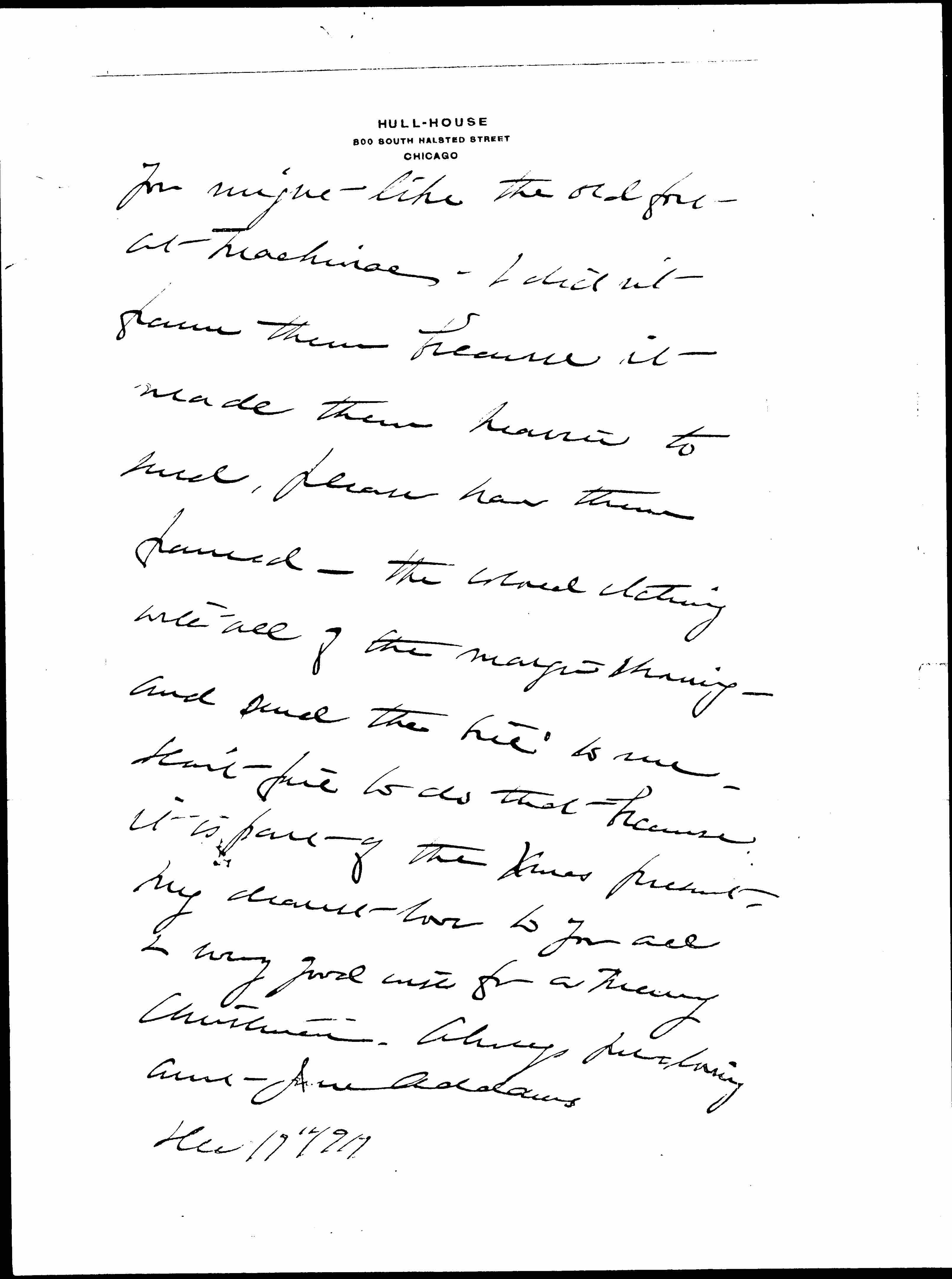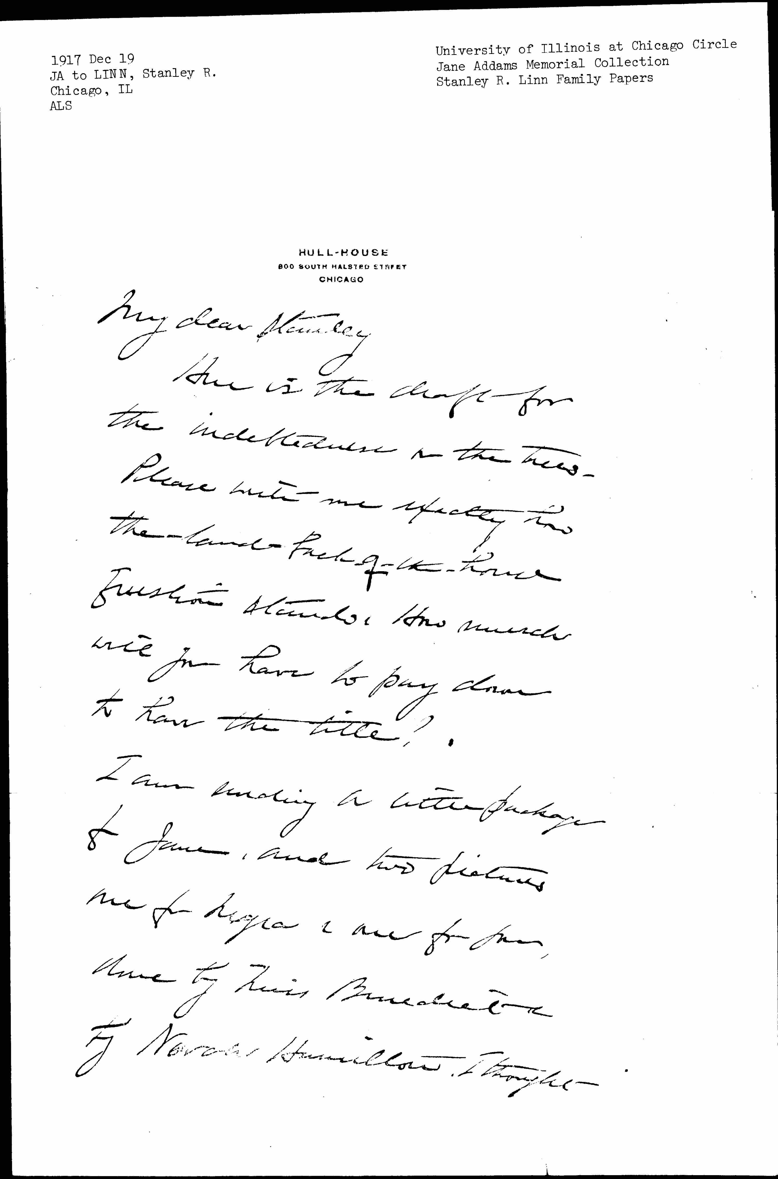 I am sending a little package for Jane, and two pictures one for Myra & one for Jane done by Miss Benedict & by Norah Hamilton. I thought [page 2] you might like the old fort at Mackinac. I didn't frame them because it made them heavier to send, please have them framed -- the colored etching with all of the margin showing -- and send the bill to me -- don't fail to do that because it is part of the Xmas present. My dearest love to you all & every good wish for a merry Christmas. Always your loving Aunt Jane Addams