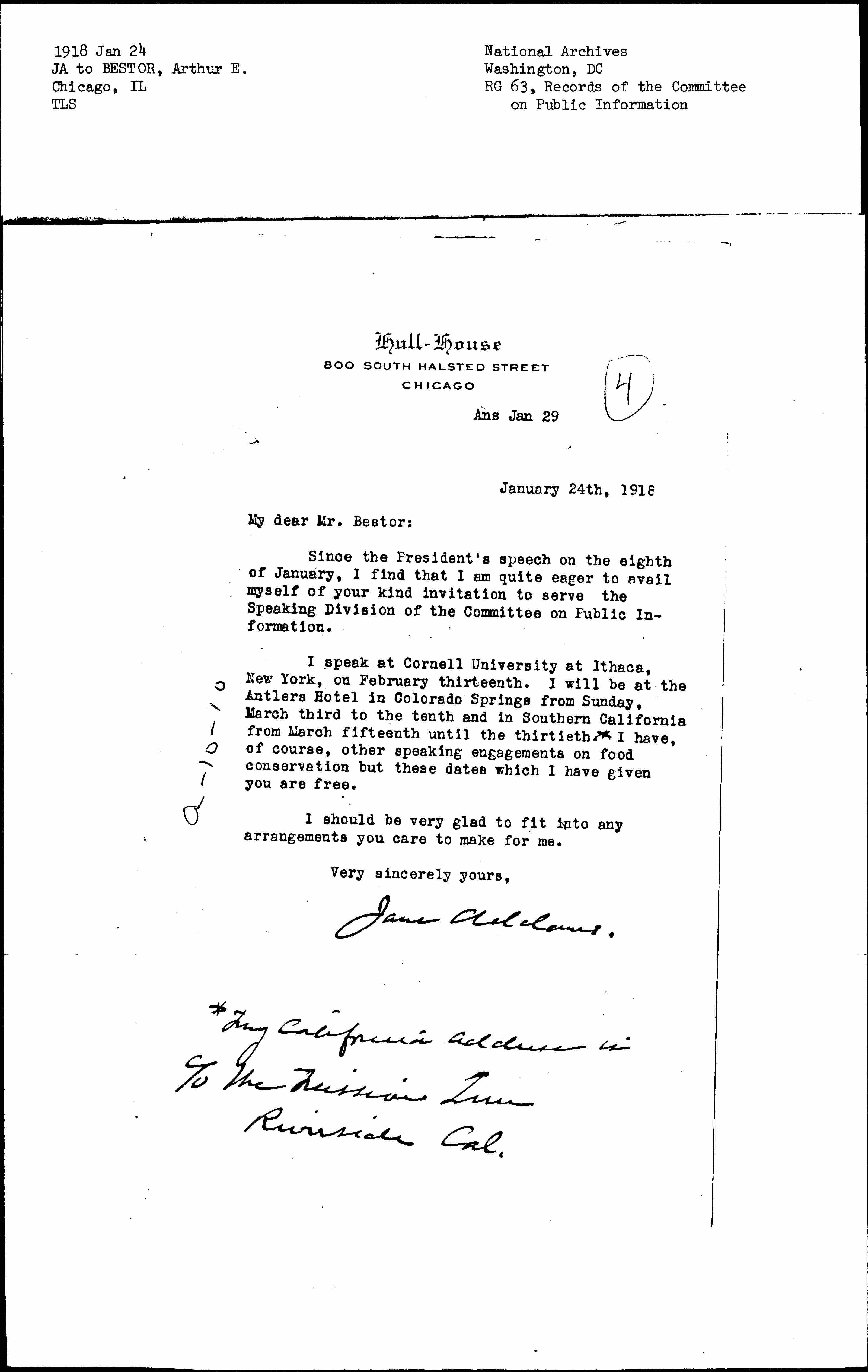 I speak at Cornell University at Ithaca, New York, on February thirteenth. I will be at the Antlers Hotel in Colorado Springs from Sunday, March third to the tenth and in Southern California from March fifteenth until the thirtieth.↑*↓ I have, of course, other speaking engagements on food conservation but these dates which I have given you are free.